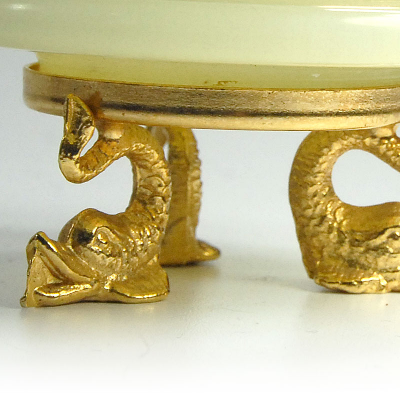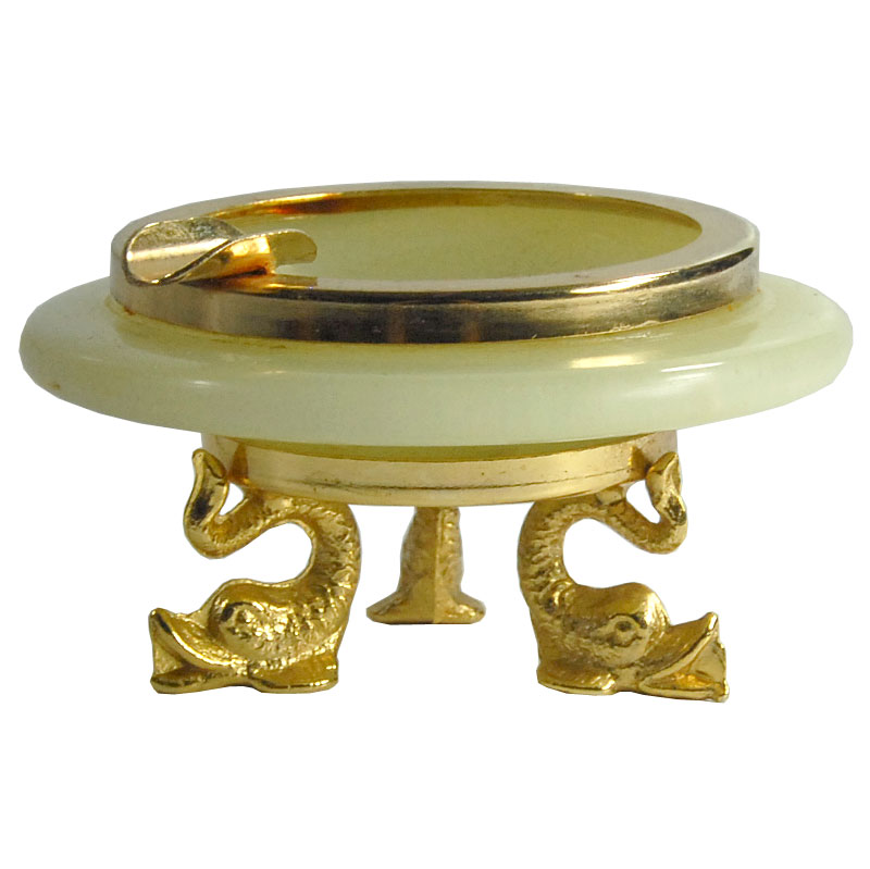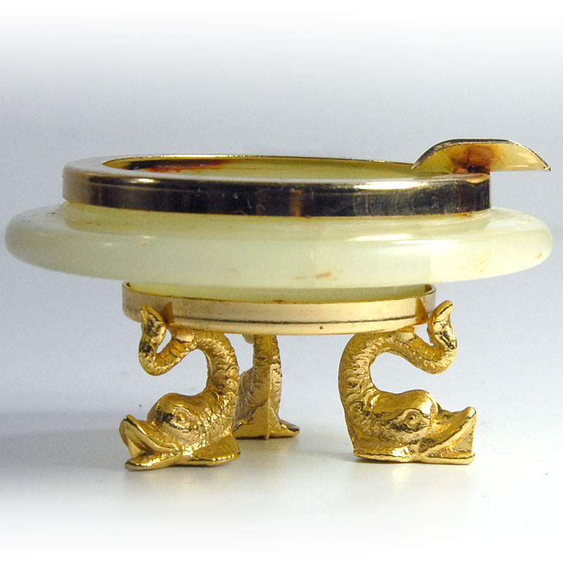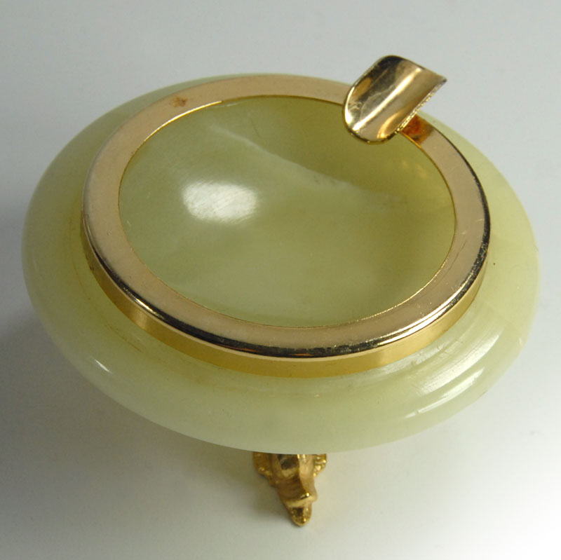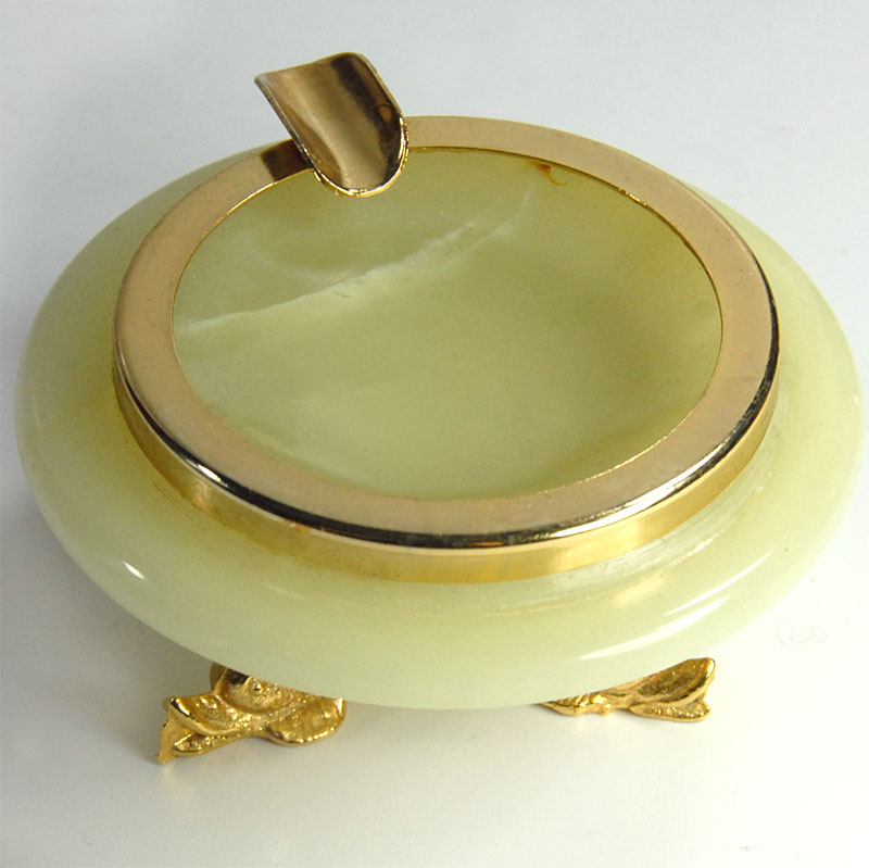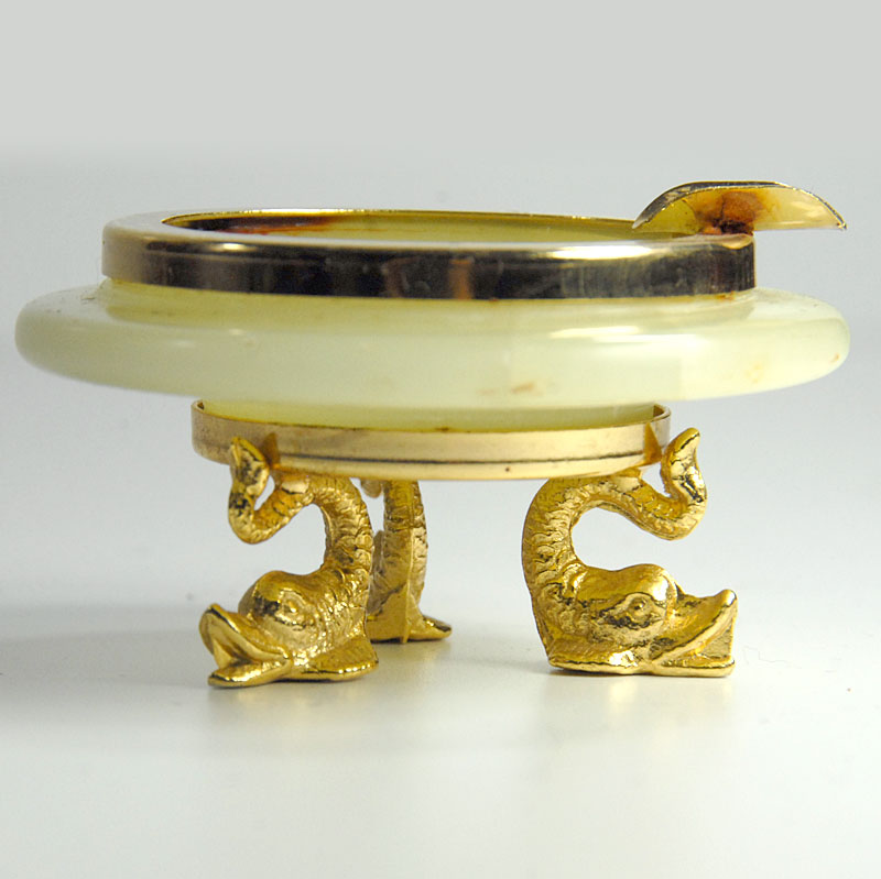 Nieduża, delikatna i elegancka popielniczka zrobiona z lekko przejrzystego alabastru, wykończona metalem w kolorze złotym. Umieszczona jest na trzech metalowych rybach. Pochodzi z Włoch z lat siedemdziesiątych XX wieku. Widoczne ślady używania i lekka patyna na elementach metalowych. Średnica: 8 cm. Wysokość: 4,5 cm.