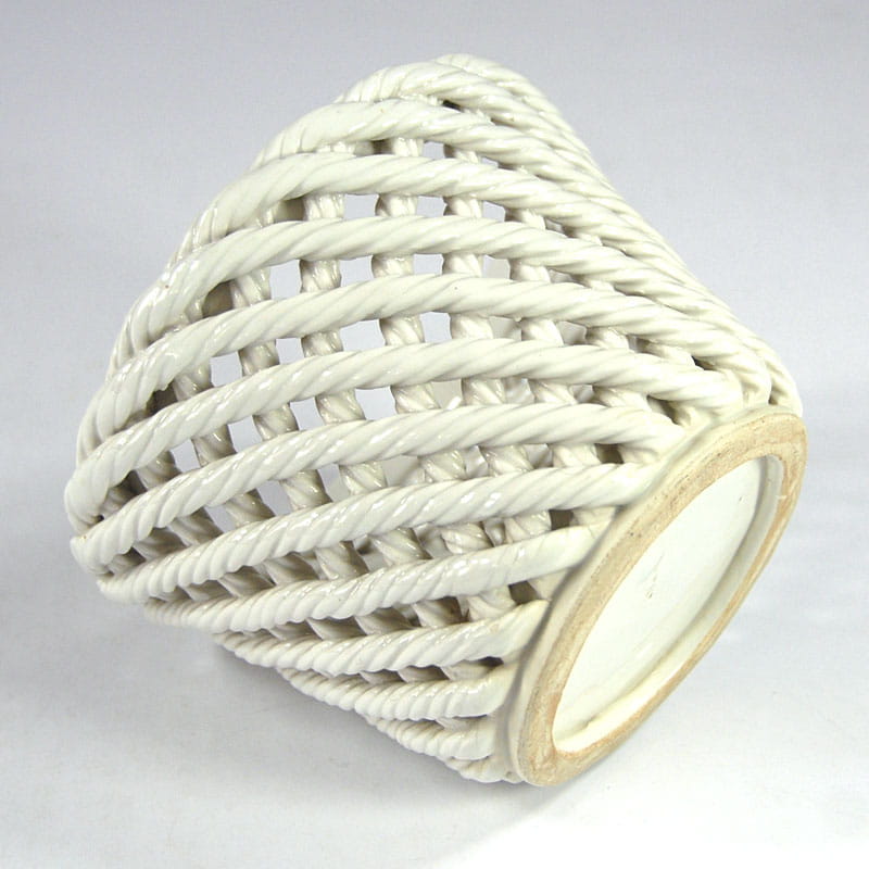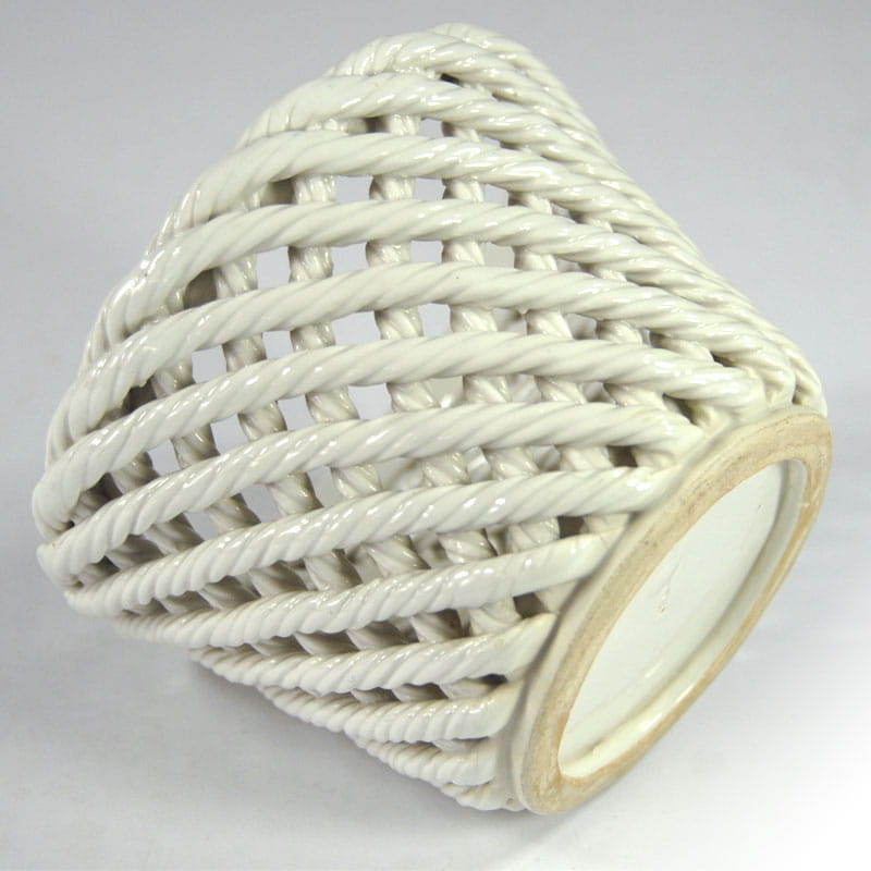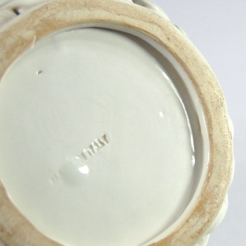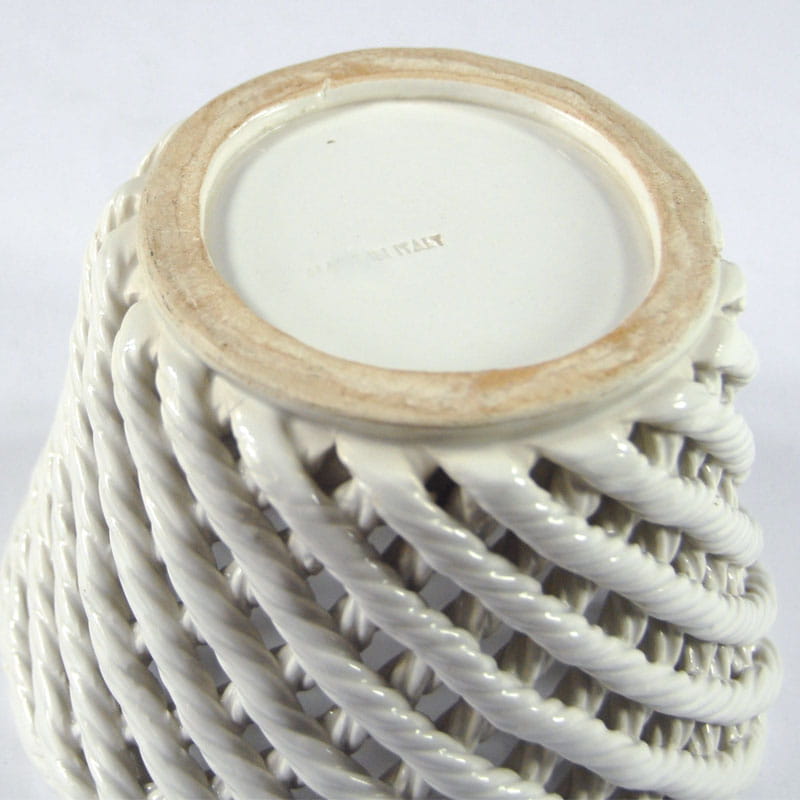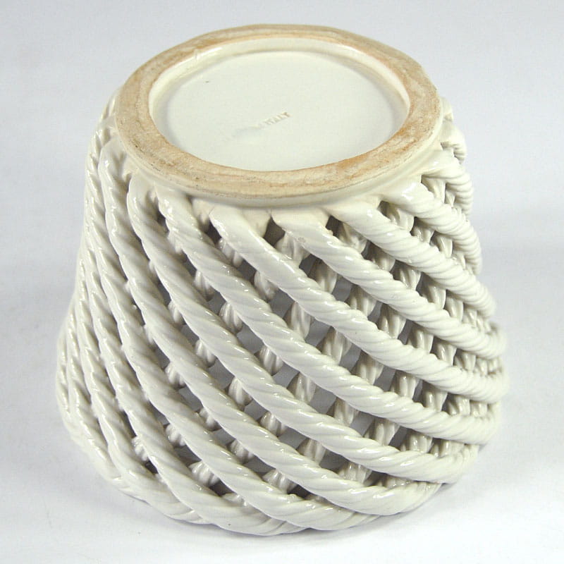 Ażurowa, ręcznie robiona osłona na doniczkę z ceramiki szkliwionej w delikatnym kremowym kolorze. Pochodzi z Włoch. Sygnowana. Przedmiot vintage zachowany w bardzo dobrym stanie. Średnica: 15 cm. Wysokość: 11 cm. Średnica podstawy: 9,5 cm.