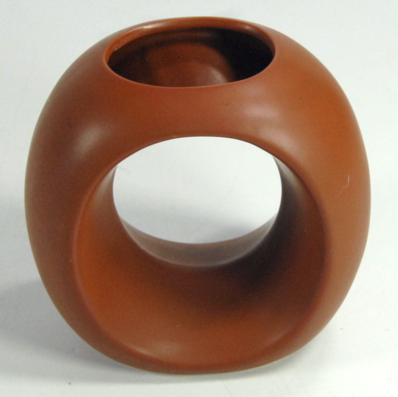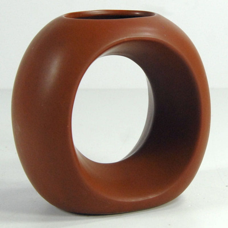 Wazon zrobiony ze szkliwionej ceramiki. Wykończony jest satynowym szkliwem w apetycznym czekoladowo brązowym kolorze. Ma atrakcyjną formę. Pochodzi z Belgii z lat osiemdziesiątych XX wieku. Zachowany w bardzo dobrym stanie z niewielkimi śladami używania głównie w postaci drobnych zarysowań powierzchni. Wymiary: 12,5 x 13 x 8 cm.