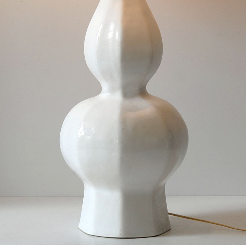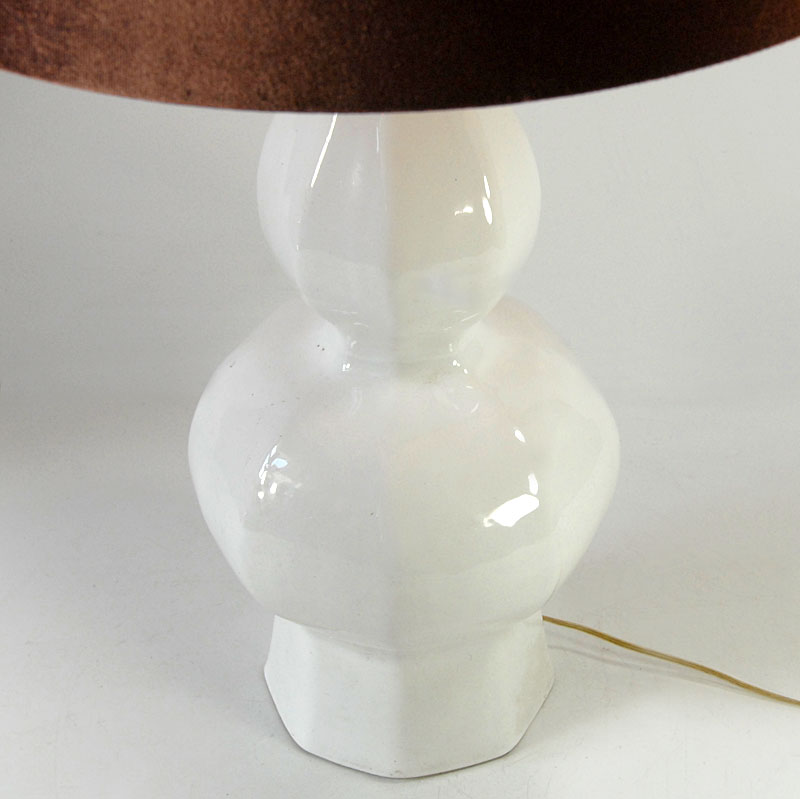 Duża, lampa stołowa zrobiona z ceramiki. Zdobina mocno błyszczącym szkliwem w kolorze lekko złamanej bieli. Lampa pochodzi z Włoch. Wyprodukowana została w latach siedemdziesiątych XX wieku. Uzupełniona o współczesny abażur. Lampa zachowana jest w bardzo dobrym stanie. Obsadka na żarówkę E27. Wysokość: 70 cm. Wysokość podstawy (bez żarówki): 50 cm. Średnica: 18 cm. Średnica dołu podstawy: 14 cm. Średnica abażuru: 45 cm.