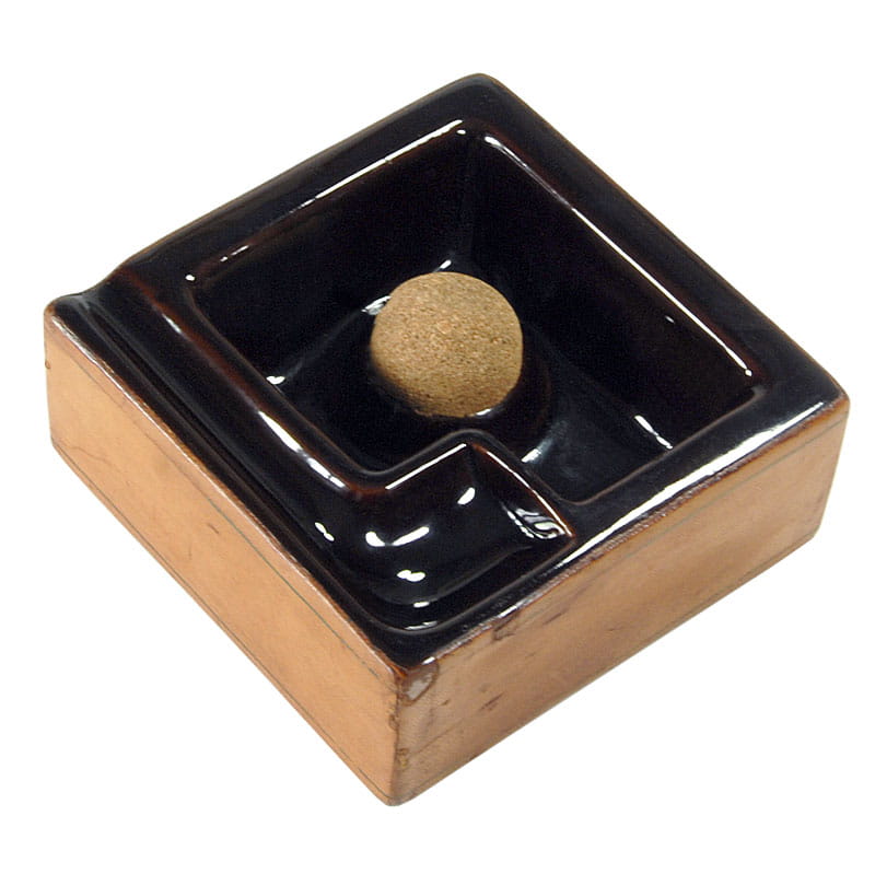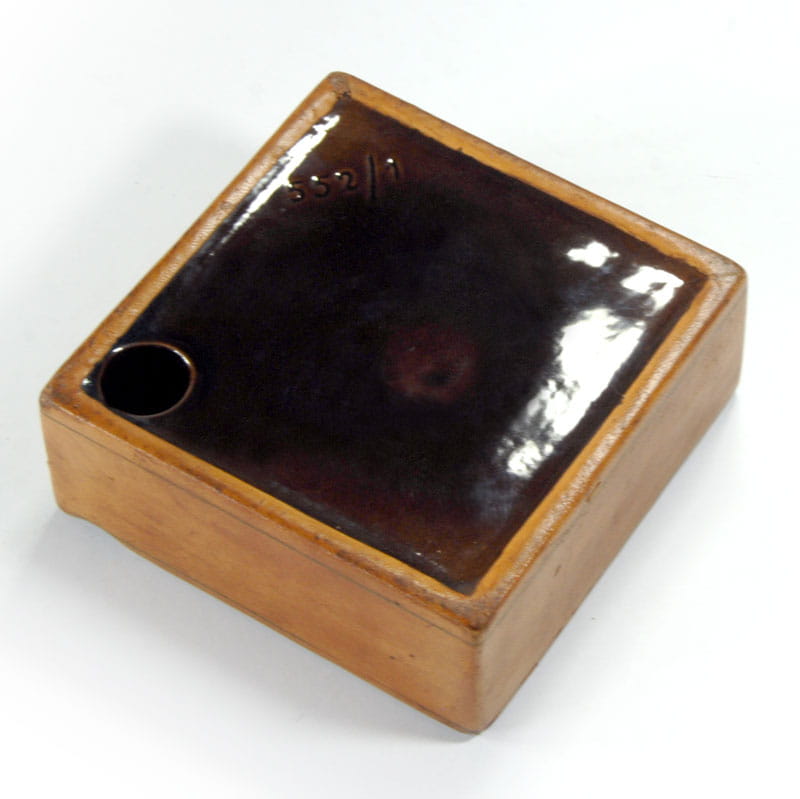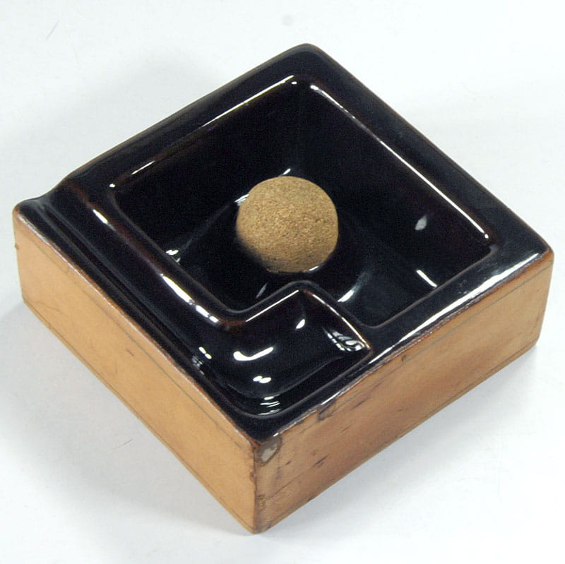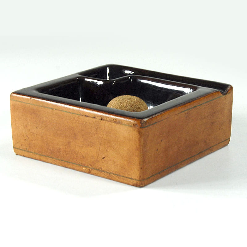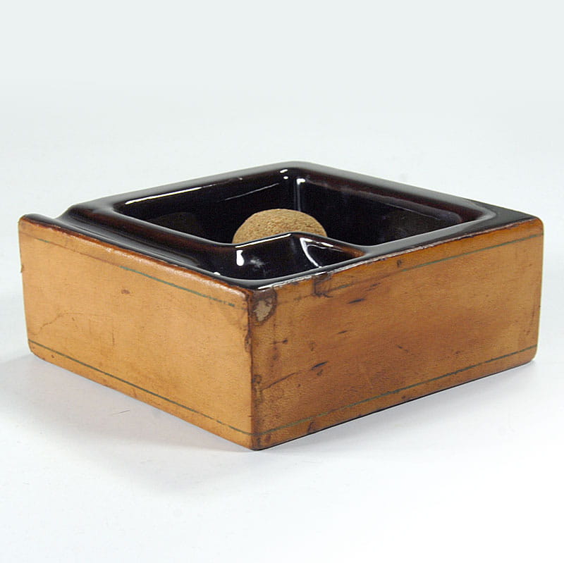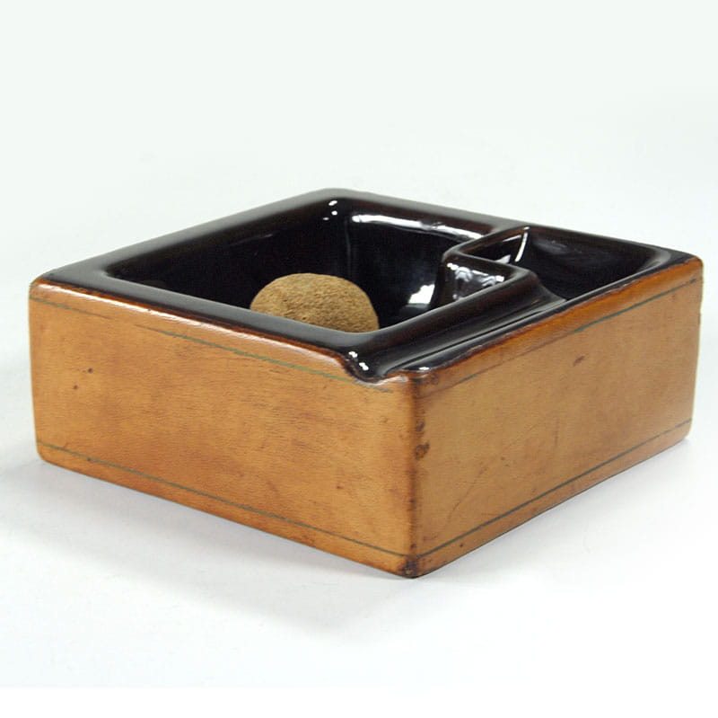 Spora, stołowa popielniczka zrobiona ze szkliwionej w kolorze ciemnego brązu ceramiki. Posiada miejsce przeznaczone do odkładania fajki. Oprawiona w naturalną skórę. Centralnie umieszczony jest korkowy odbojnik umożliwiający usuwanie resztek tytoniu z fajki. Sygnowana. Popielnica zachowana jest w dobrym stanie. Widoczne są ślady używania głównie w postaci zarysowań i uszkodzeń skóry. Popielnica pochodzi z włoskiej wytwórni SC3 z lat siedemdziesiątych XX wieku. Wymiary: 20 x 14 x 3 cm.