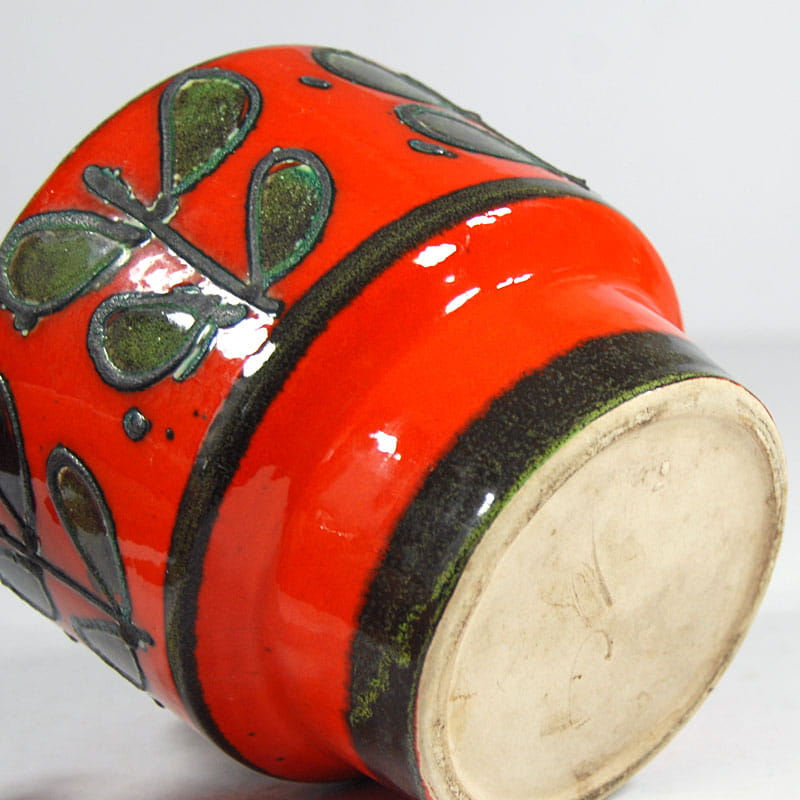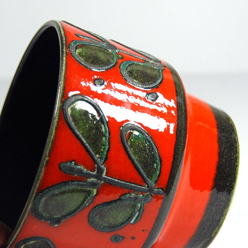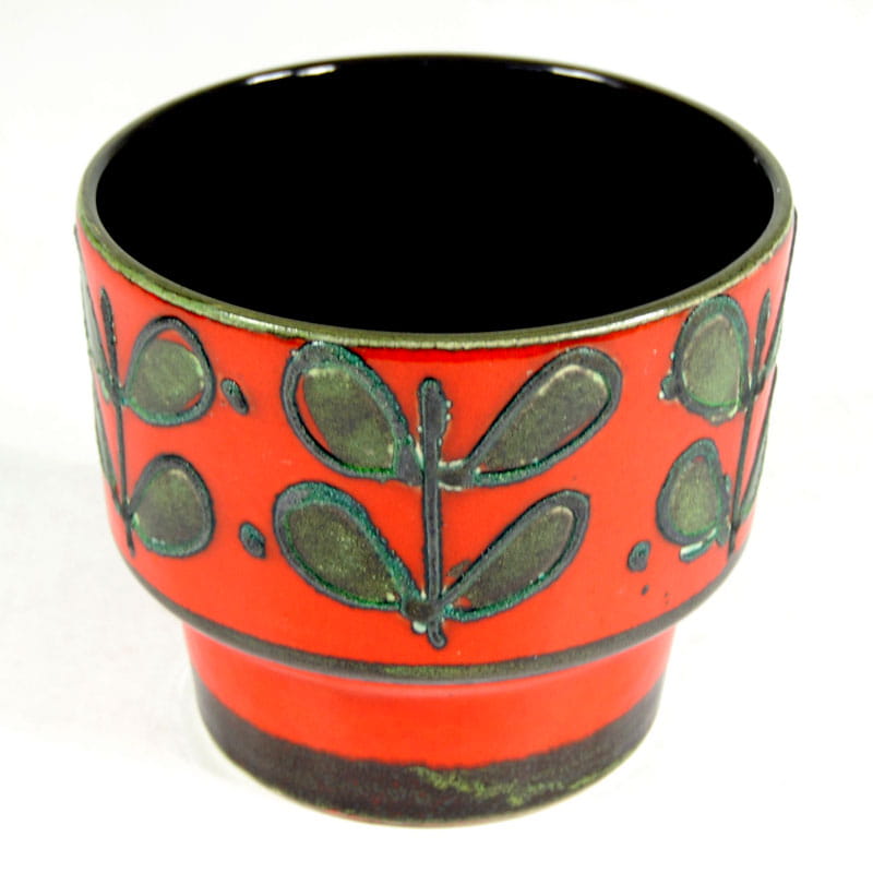 Dekoracyjna doniczka/osłonka na doniczkę zrobiona z ceramiki zdobionej fakturalną grafiką i szkliwieniem w intensywnie czerwonym kolorze. Pochodzi z Danii z lat siedemdziesiątych XX wieku. Wymiary: 16 x 14 cm. Średnica podstawy: 11 cm.