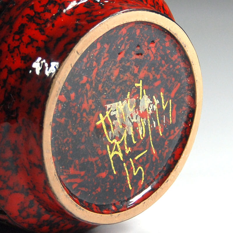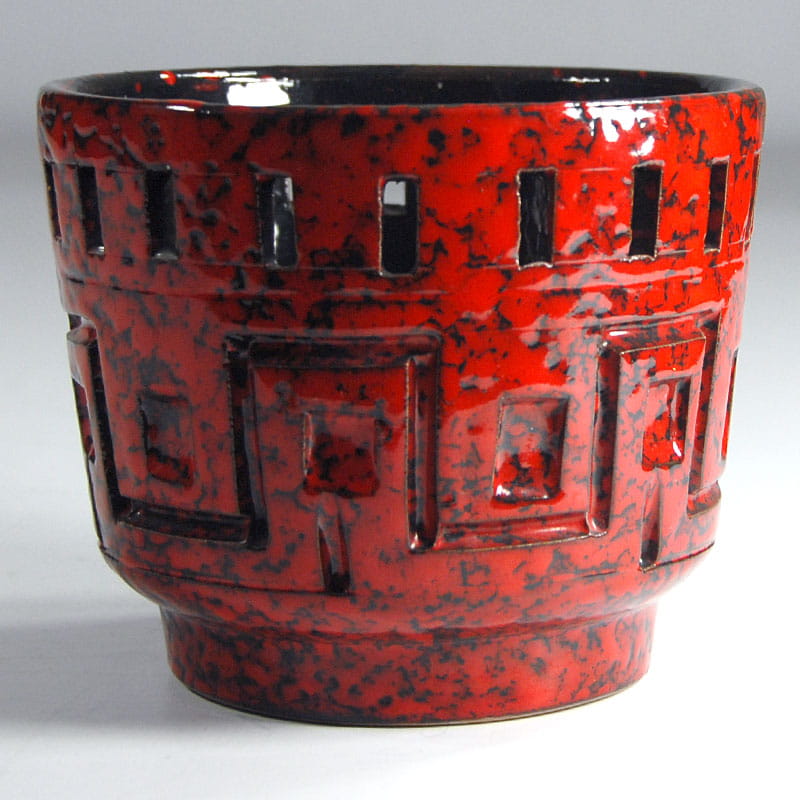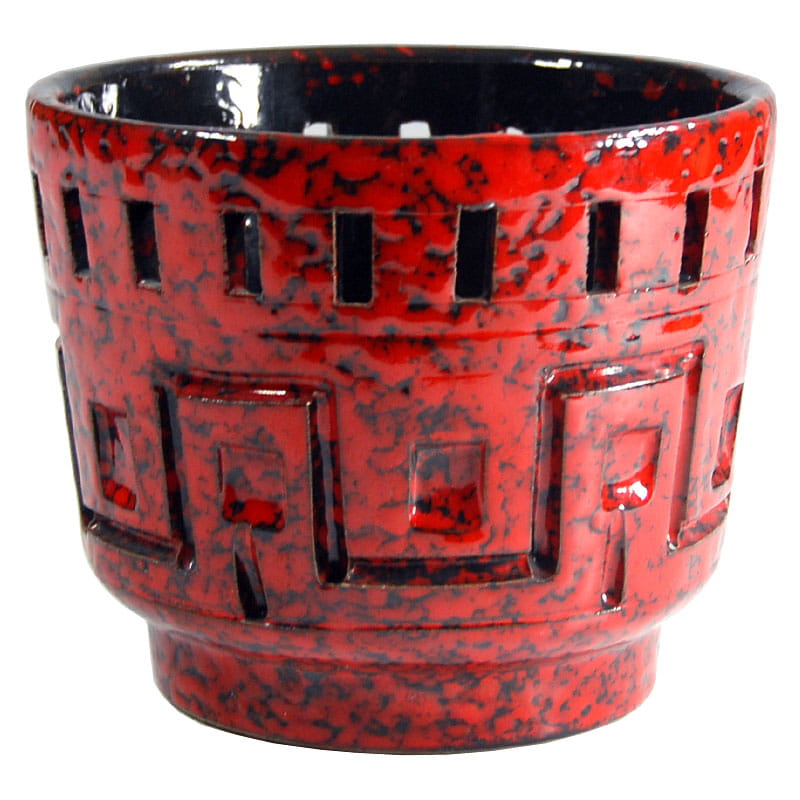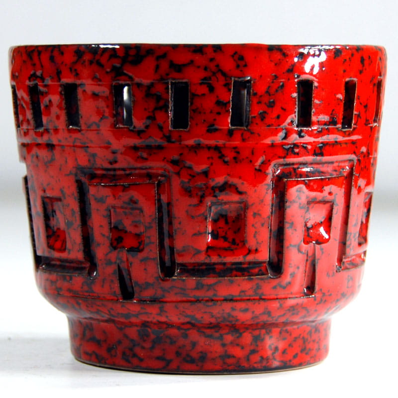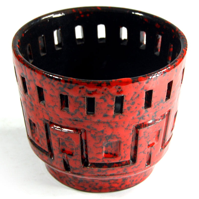 Dekoracyjna doniczka zrobiona z ceramiki zdobionej ażurem oraz szkliwiona w intensywnie czerwonym kolorze. Pochodzi z wytwórni Fratelli Fanciullacci z lat sześćdziesiątych XX wieku. Zachowana w bardzo dobrym stanie. Wymiary: 14 x 12 cm. Średnica podstawy: 10 cm.