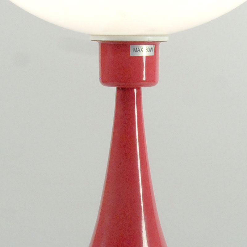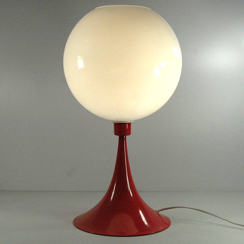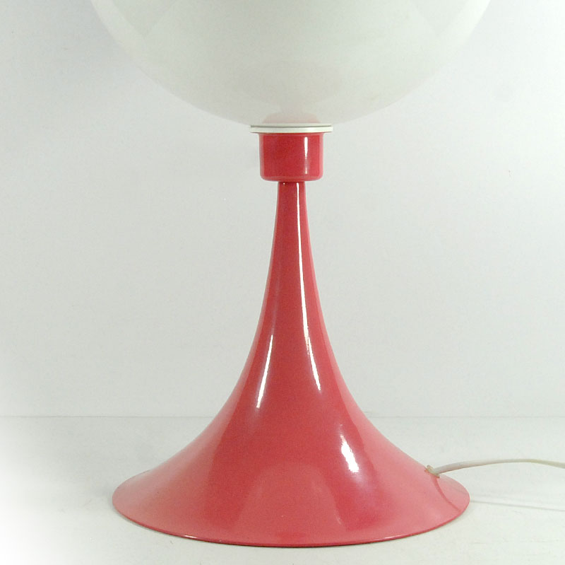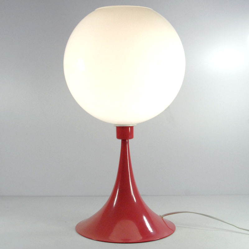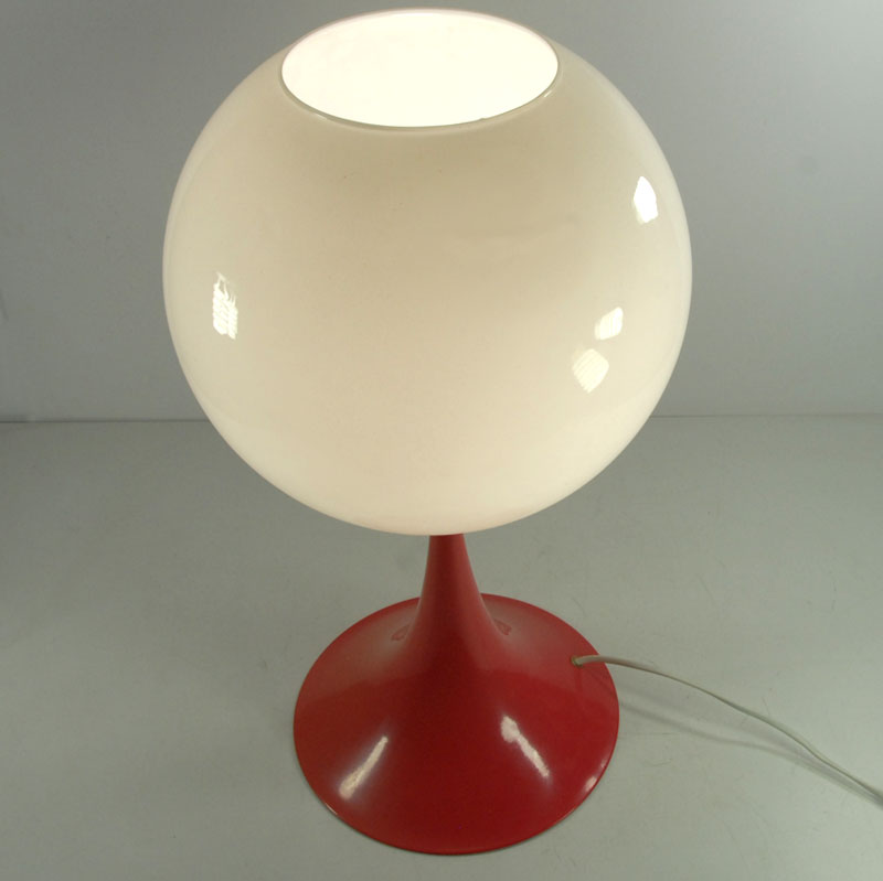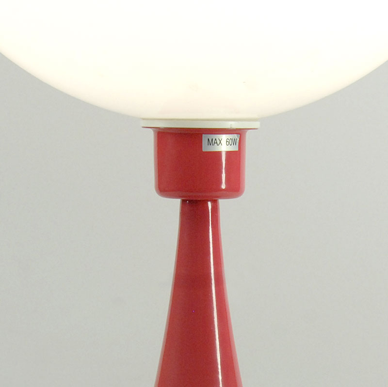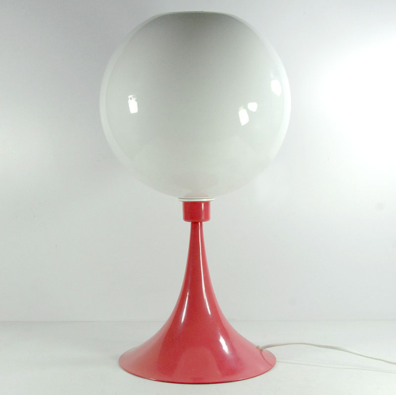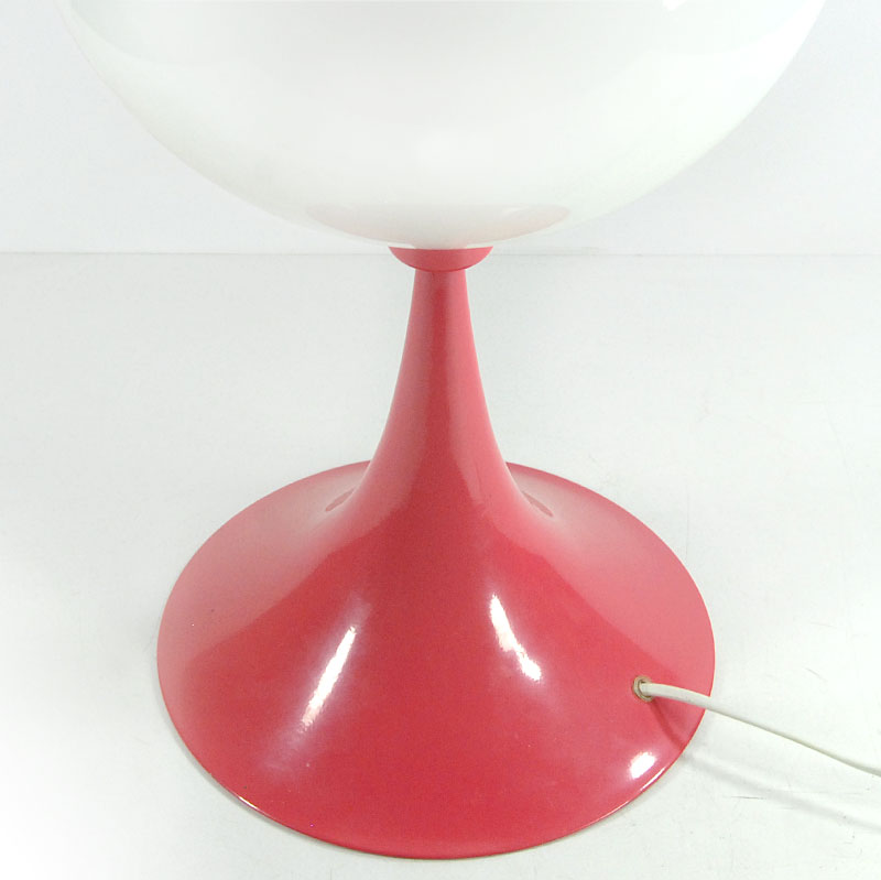 Dekoracyjna lampa zaprojektowana w stylistyce Space Age. Podstawa lampy zrobiona jest z dość delikatnego metalu w kolorze czerwonym, lekko wpadającym w malinowy róż. Klosz zrobiony jest z białego szkła. Lampa pochodzi z Włoch z lat siedemdziesiątych XX wieku. Obsadka na żarówkę z gwintem E27. Włącznik na kablu. Lekkie ślady używania w postaci drobnych zarysowań powierzchni. Wysokość całej lampy: 55 cm. Średnica podstawy: 25 cm. Średnica klosza: 25 cm.