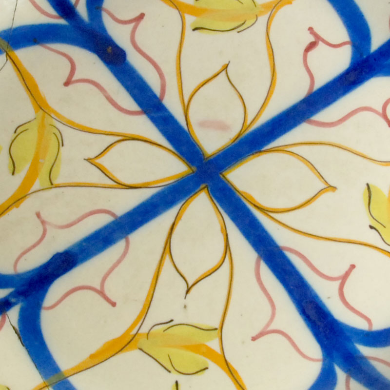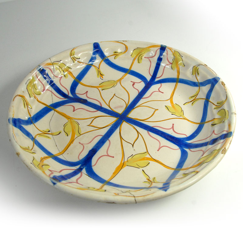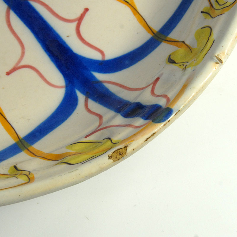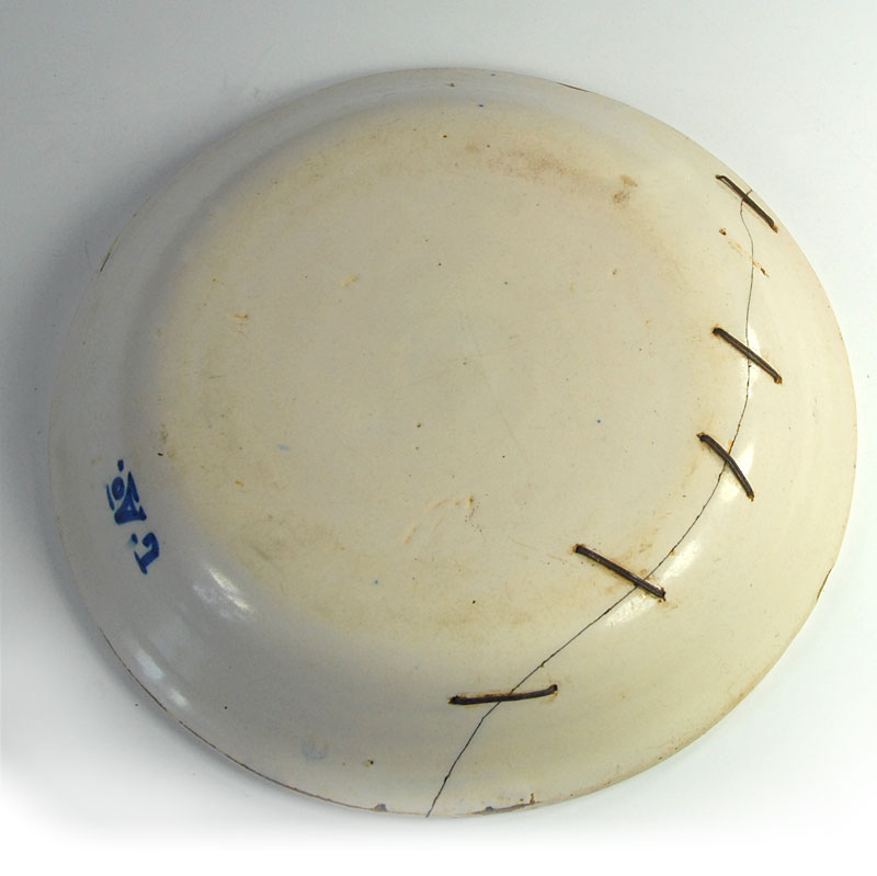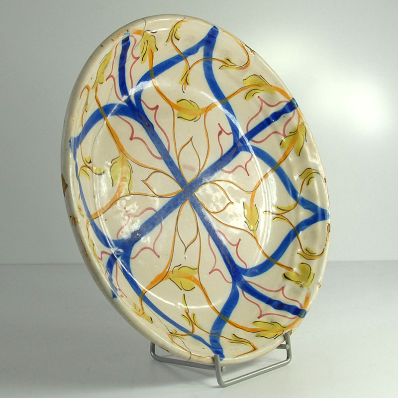 Duża bardzo efektowna patera zrobiona z majoliki. W całości ręcznie dekorowana i szkliwiona. Pochodzi z hiszpańskiej Talavery z XVIII/XIX wieku. Talerz ma starą, z dziewiętnastego wieku, naprawę za pomocą tzw. stapli. Średnica: 29 cm. Wysokość: 5 cm.