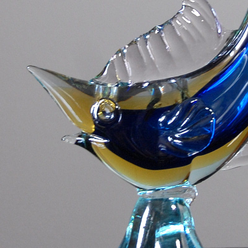 Bardzo piękna, duża figurka dekoracyjna wykonana w Murano. Szkło kolorowe, recznie formowane. Oryginalny przedmiot vintage. Lata sześćdziesiąte XX wieku. Kilka niewielkich uszkodzeń widocznych tylko z bliska. Wysokość: ok. 31 cm. Długość: ok. 16 cm. Średnica podstawy: ok. 6 cm.