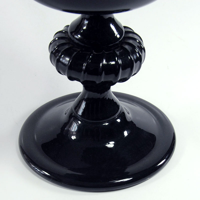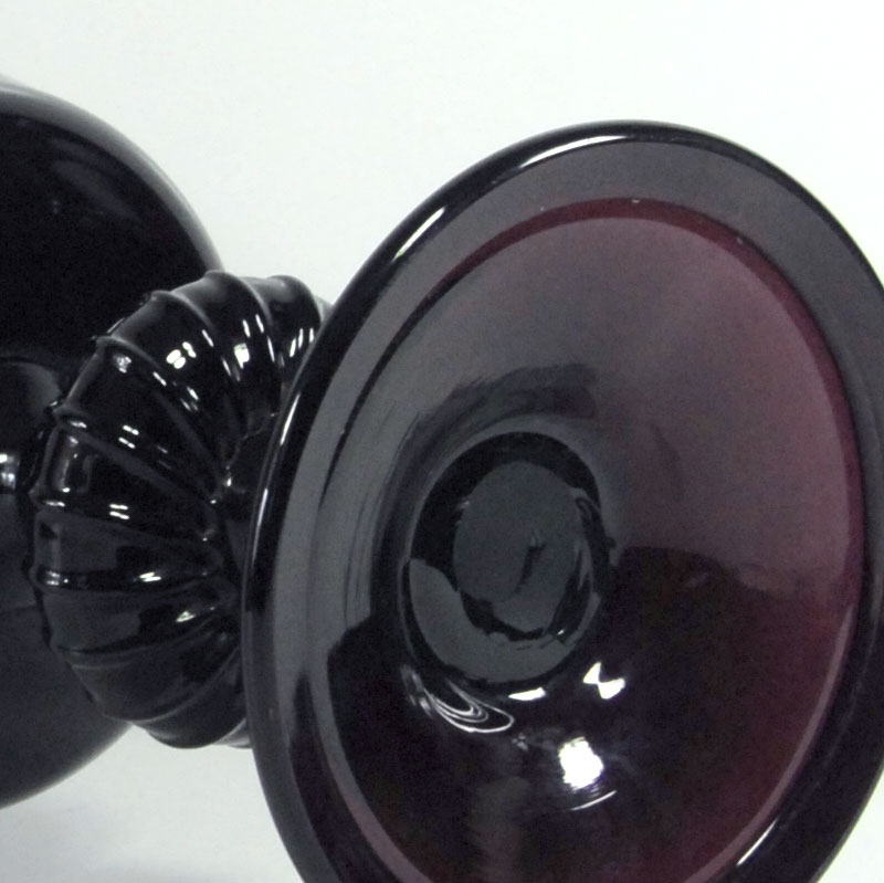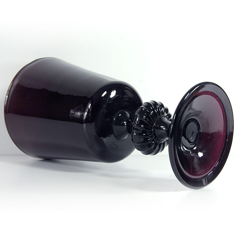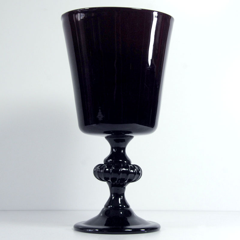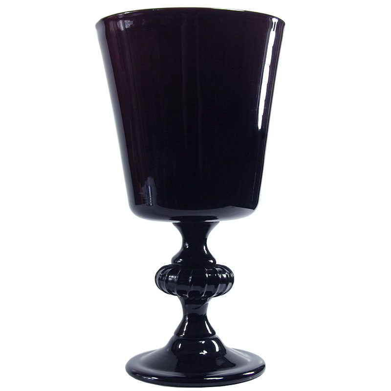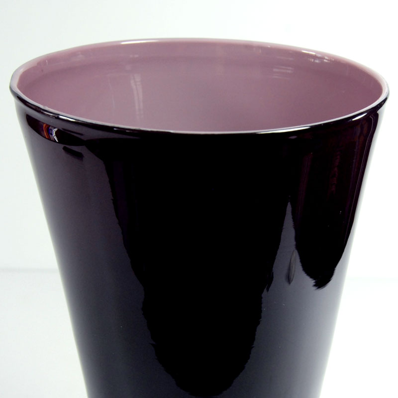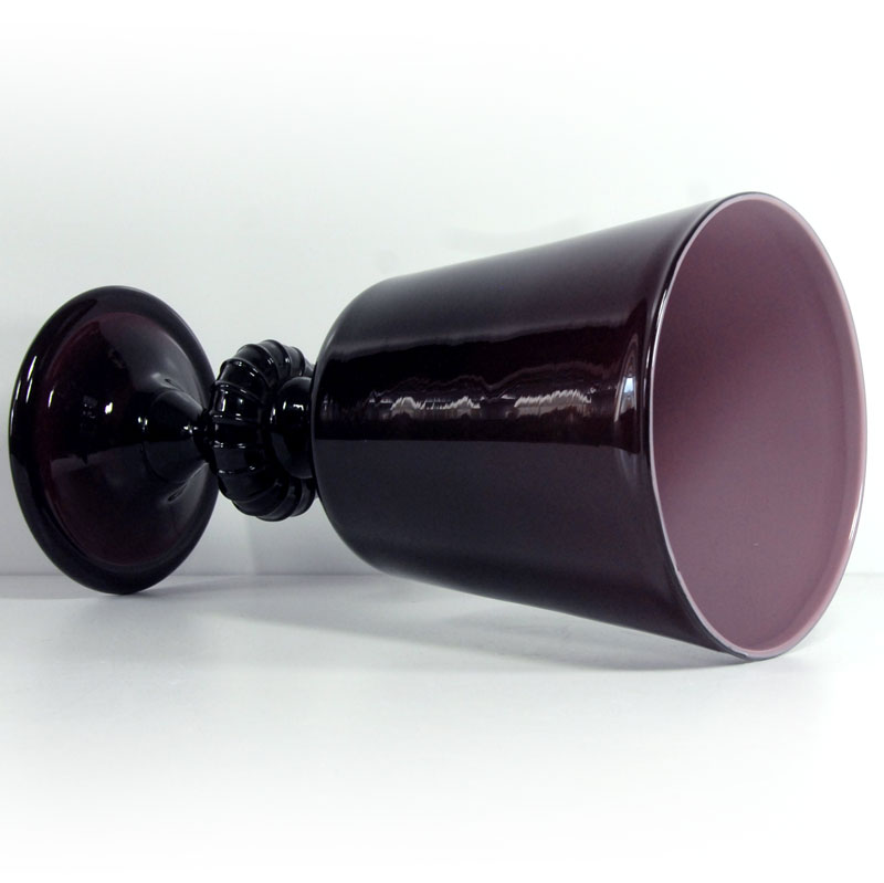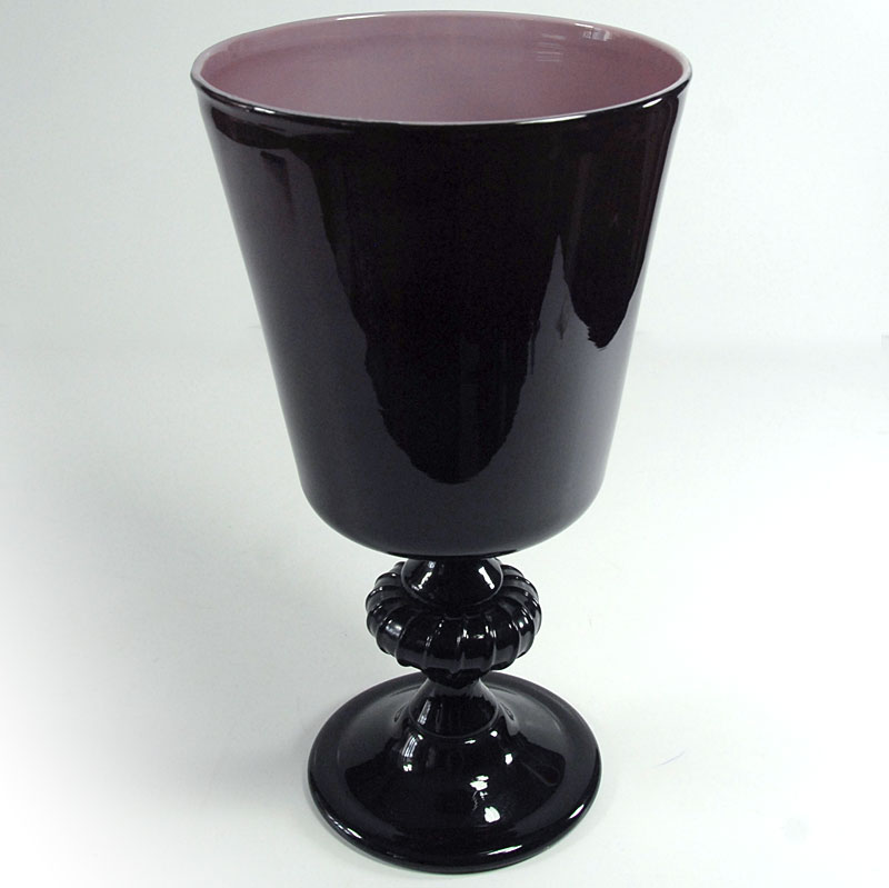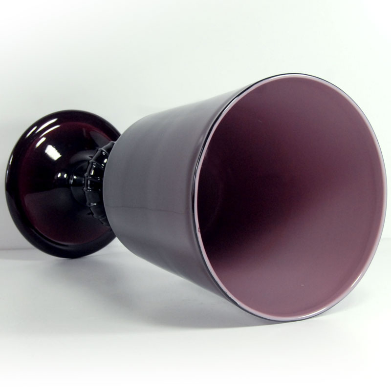 Duży, bardzo dekoracyjny włoski wazon o efektownej formie kielicha. Zrobiony jest ze szkła warstwowego, umieszczony ne dekoracyjnej stopce. Zewnętrze oraz podstawa są w pięknym, ciemno fioletowym/oberżynowym kolorze. Wnętrze jest jaśniejsze, lekko fioletowawe. Wazon powstał w wytwórni na wyspie Murano w Wenecji. Oryginalny przedmiot vintage z lat siedemdziesiątych XX w. Zachowany jest w bardzo dobrym stanie z minimalnymi śladami używania. Wysokość: 30 cm. Średnica góry: 16,5 cm. Średnica podstawy: 12,5 cm