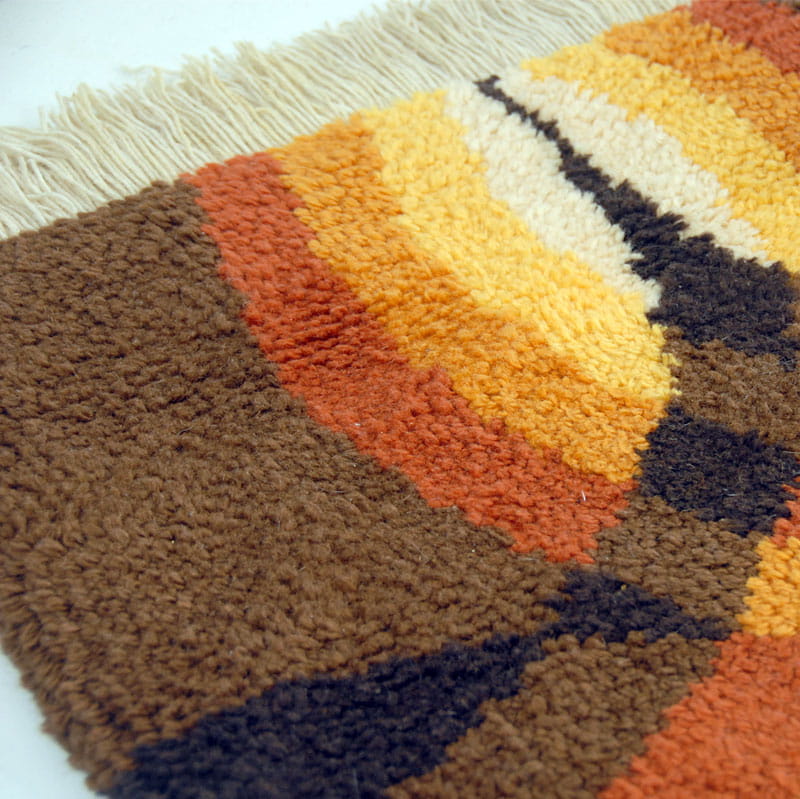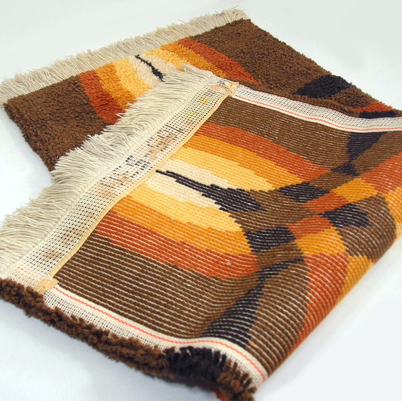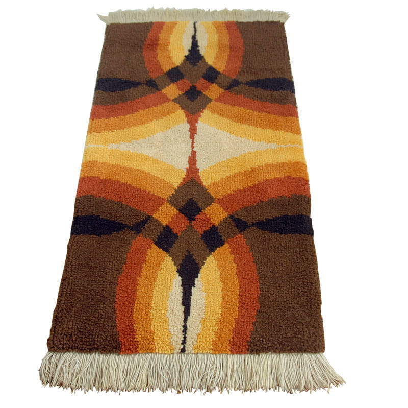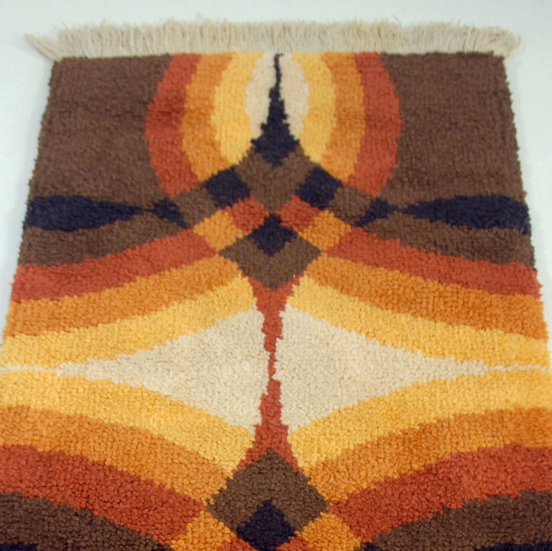 Dekoracyjny dywan lub tkanina dekoracyjna w bardzo pięknej kolorystyce. Przedmiot w stylistyce Op Art. Pochodzi z lat siedemdziesiątych XX wieku. Wyprodukowany Desso w Danii. Delikatne ślady używania. Dywan profesjonalnie wyczyszczony. Wymiary bez frędzli: 135 x 72 cm.