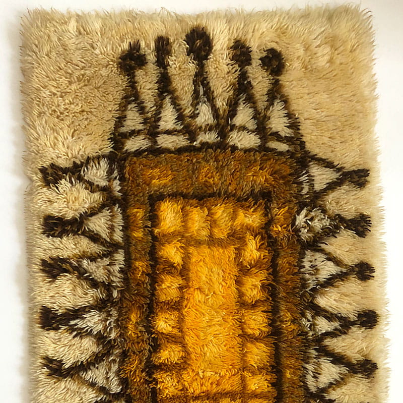 Dekoracyjny dywan lub tkanina dekoracyjna w bardzo pięknej kolorystyce. Przedmiot w stylistyce Op Art. Pochodzi z lat siedemdziesiątych XX wieku. Delikatne ślady używania. Doszyte uchwyty umożliwiające montaż listwy do zawieszenia na ścianie. Dywan jest wyczyszczony. Wymiary: 120 x 70 cm.