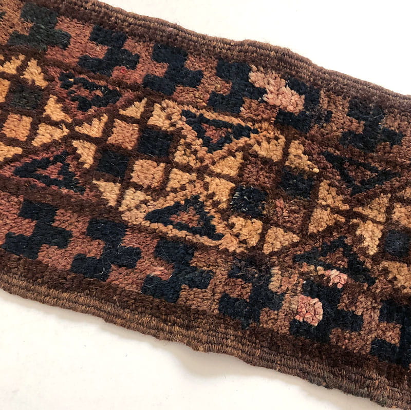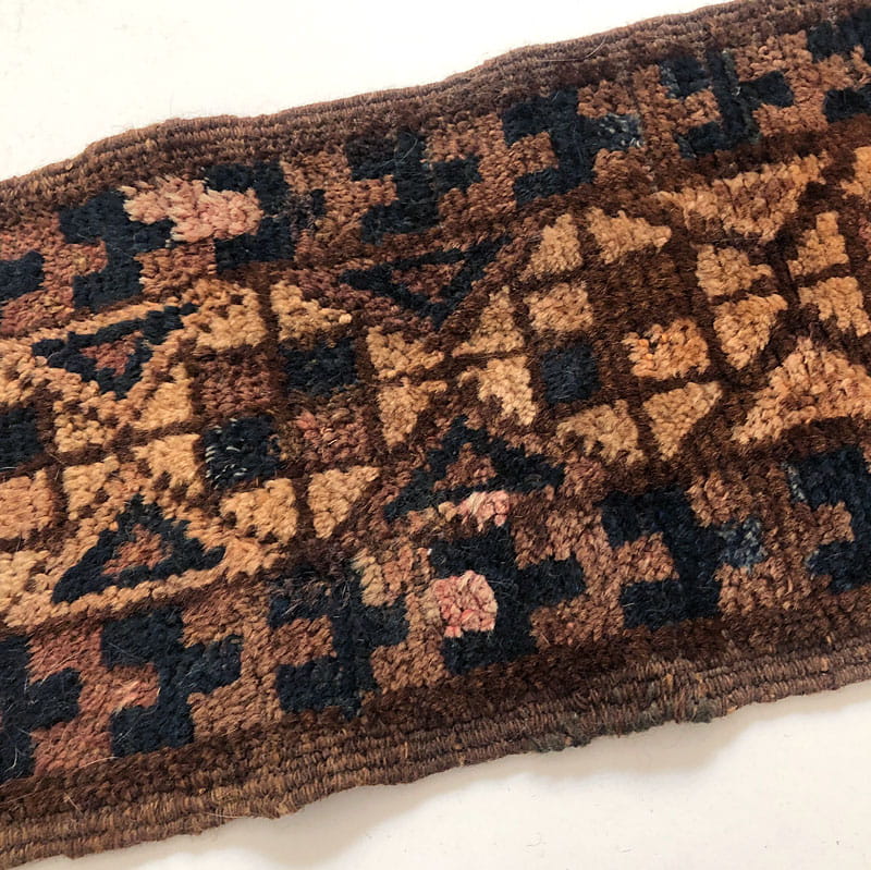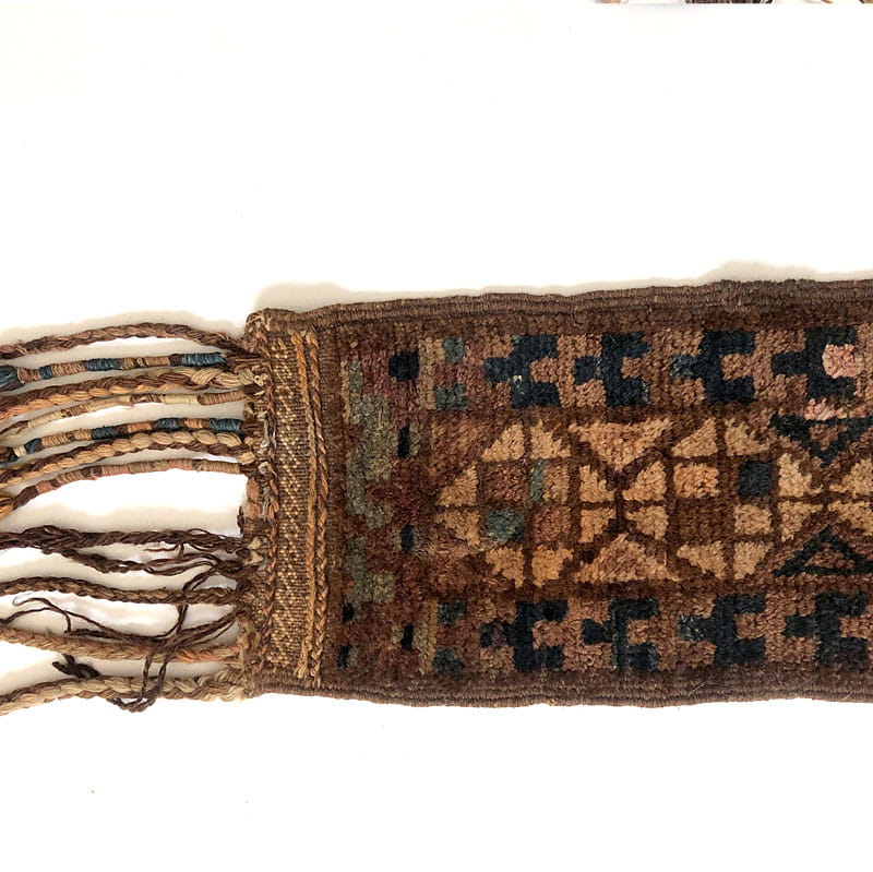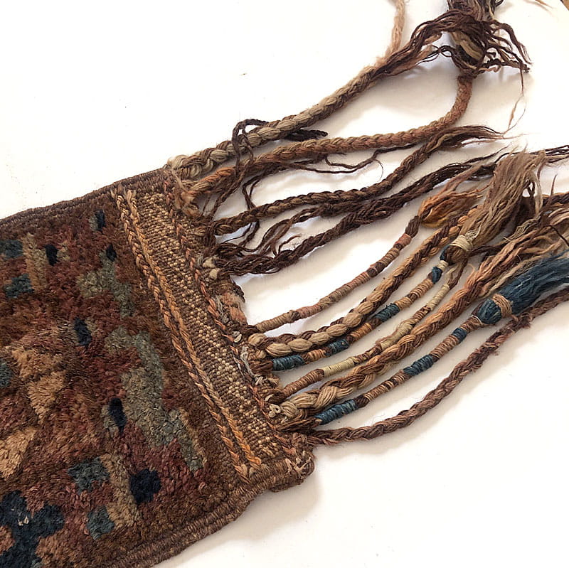 Bardzo efektowny, ręcznie robiony wełniany dywanik w pięknych kolorach. Gęsto tkany. Dość gruby i mięsisty. Miły w dotyku. Ślady używania zwłaszcza w postaci ubytków frędzli. Wymiary bez frędzli: 70 x 23 cm. Długość maksymalna frędzli: 25 cm.