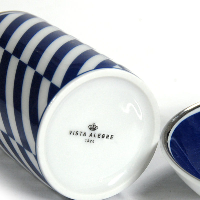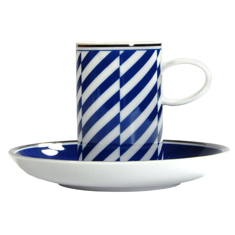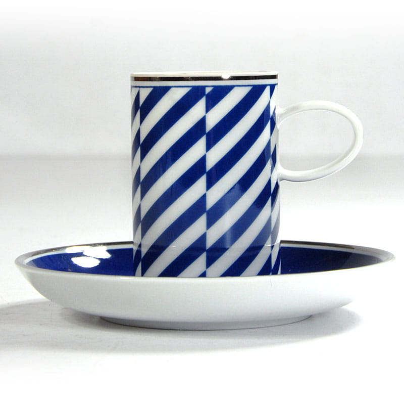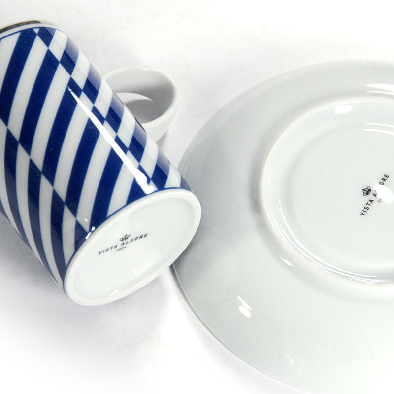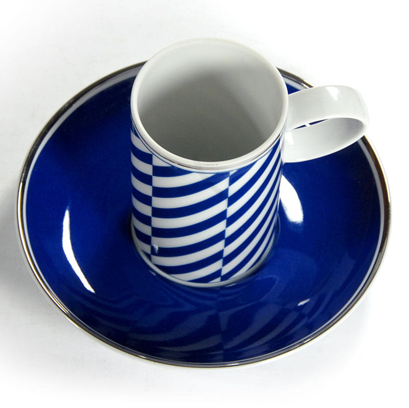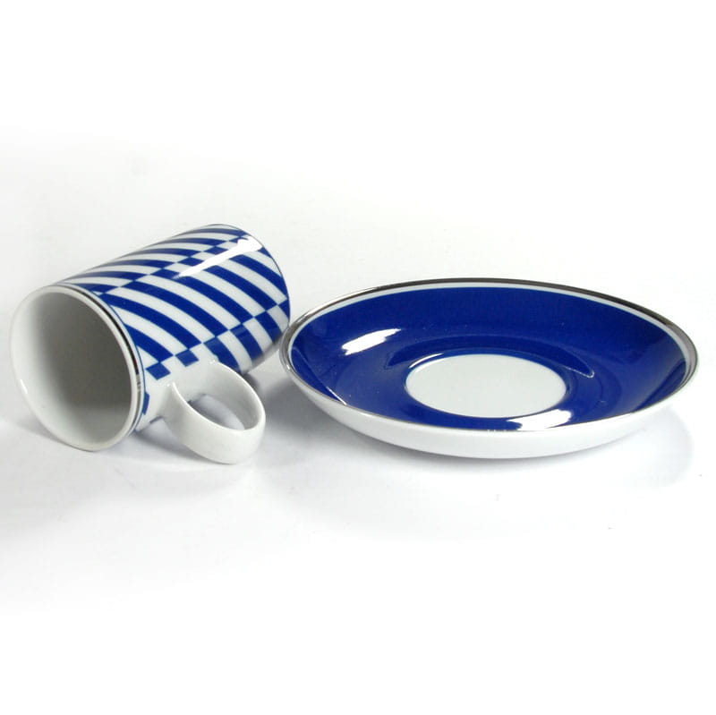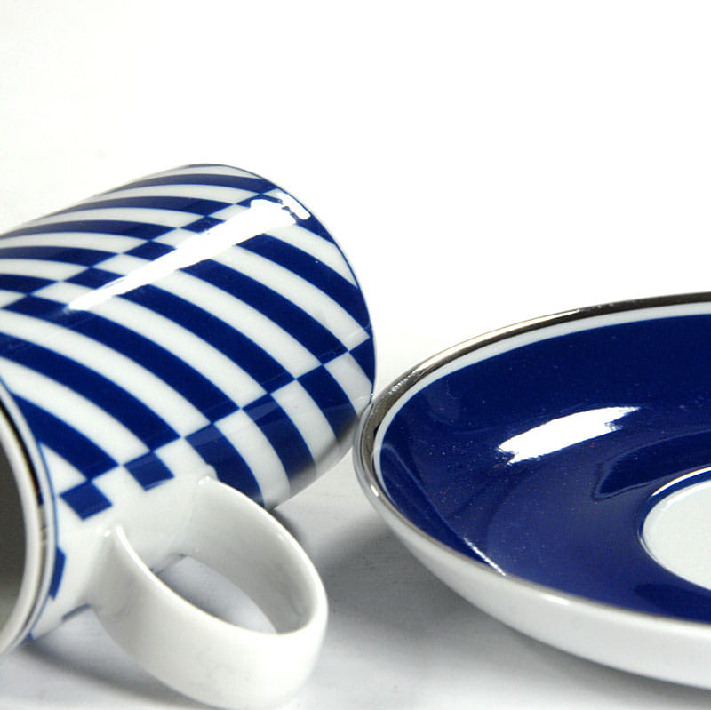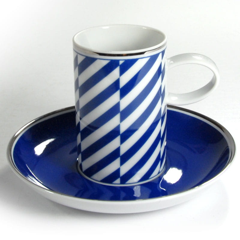 Piękna filiżanka do espresso zrobiona ze białej porcelany zdobiony motywem geometrycznym w kolorze ciemnego błękitu. Krawędzie filiżanki i spodka są srebrzone. Pochodzi z renomowanej portugalskiej wytwórni Vista Alegre. Sygnowana. Idelany stan zachowania. Wymiary: 19 x 15 cm. Wysokość: 3,5 cm.