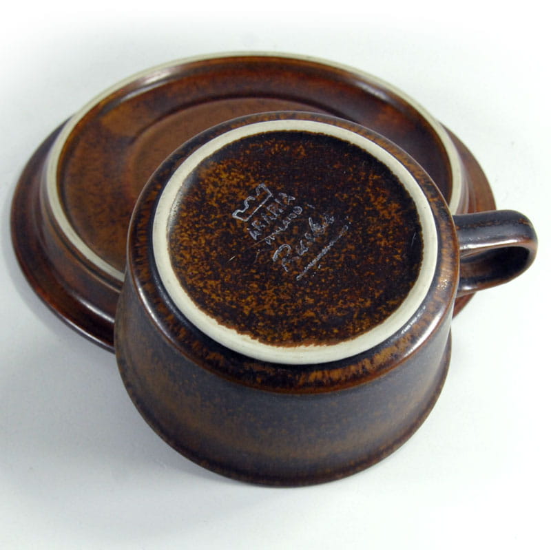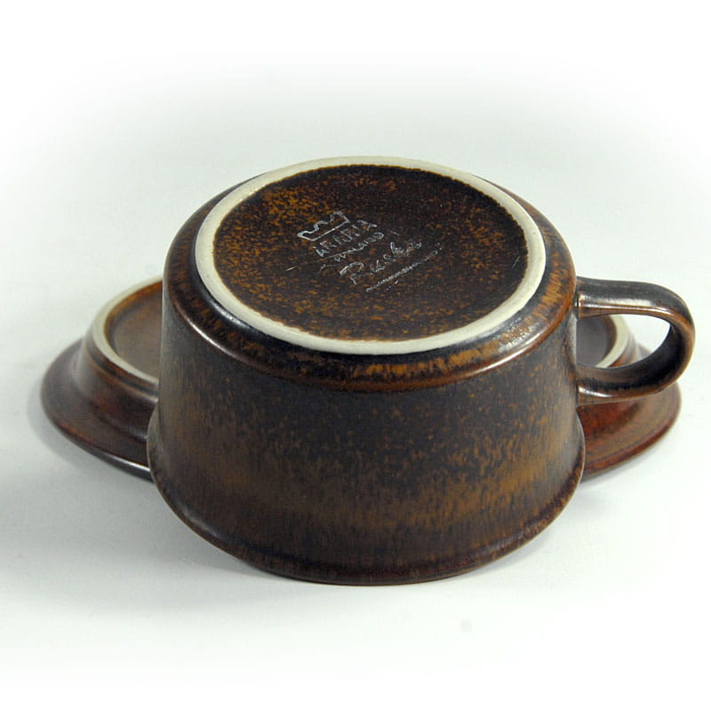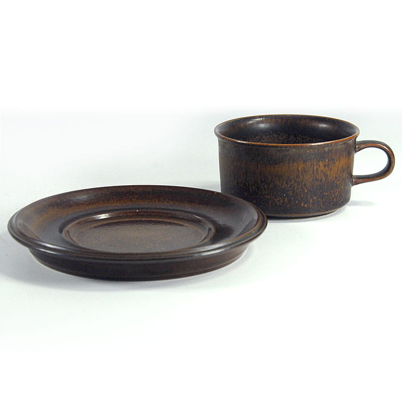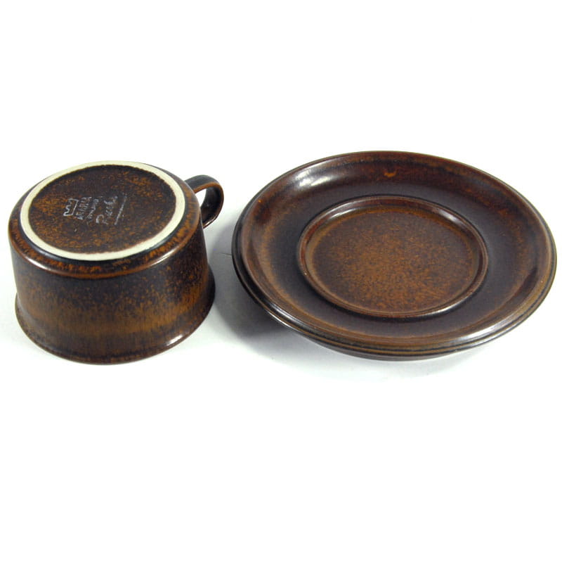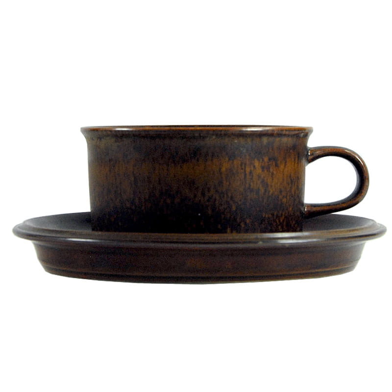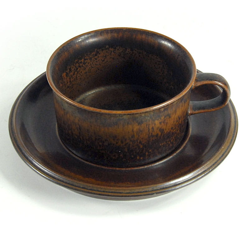 Filiżanka herbaciana z serii Ruska wykonana z wysokiej jakości szkliwionej ceramiki. Pochodzi z Finlandii z wytwórni Arabia. Element zastawy stołowej linii Ruska zostały zaprojektowane przez Ullę Procopé dla fińskiej wytwórni Arabia. Oryginalny przedmiot vintage pochodzący z lat siedemdziesiątych XX wieku. Lekkie ślady używania. Wymiary filiżanki: 5,5 x 10 cm. Średnica spodka: 16 cm.