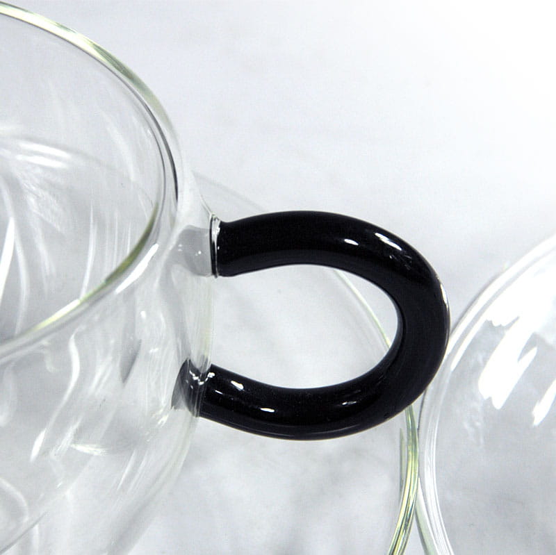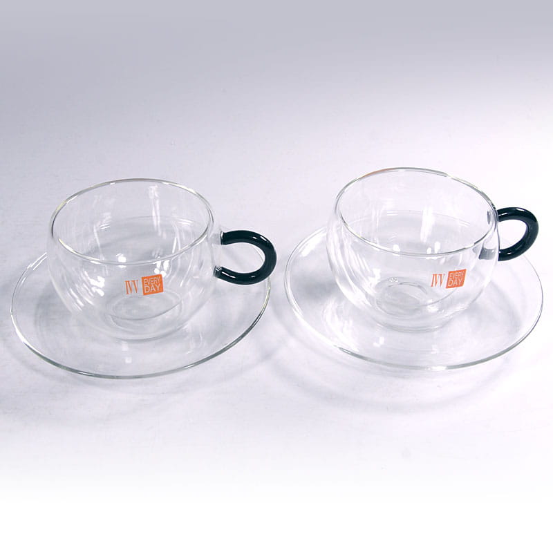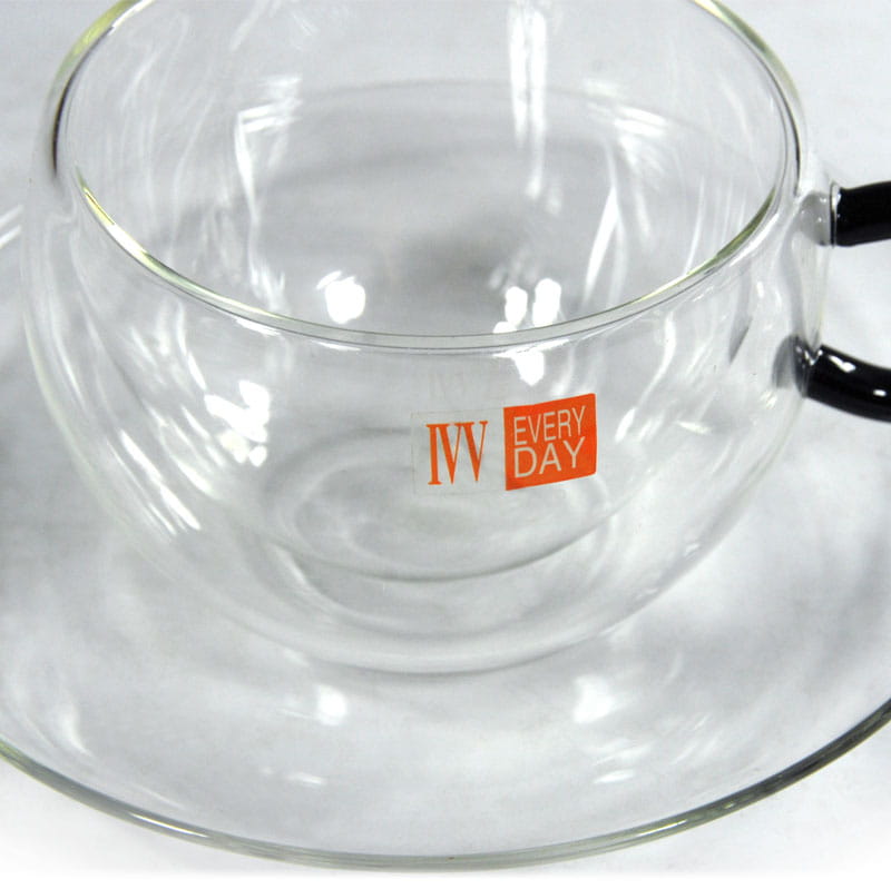 Para minimalistycznych filiżanek kawowych/herbacianych zrobionych z przeźroczystego szkła. Ścianki filiżanek są podwójne. Pochodzą z toskańskiej wytwórni Industria Vetraria Valdarnese (IVV). Bardzo dobry stan zachowania. Średnica filiżanki: 10 cm. Wysokość: 7 cm. Średnica spodka: 16 cm.