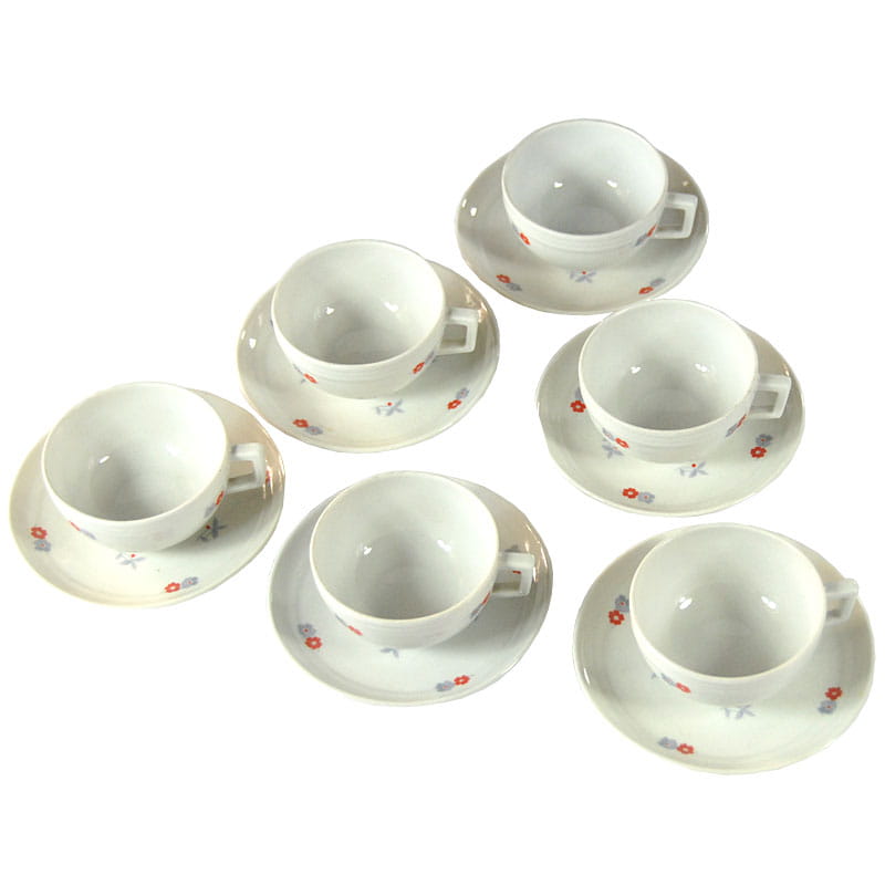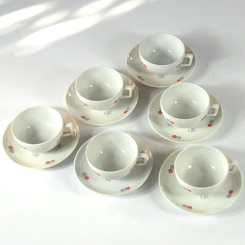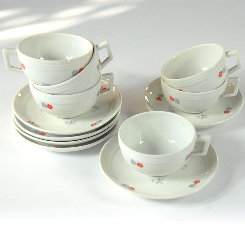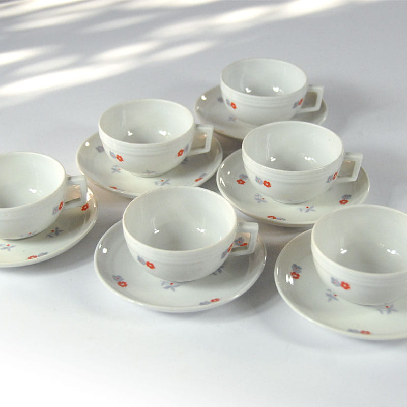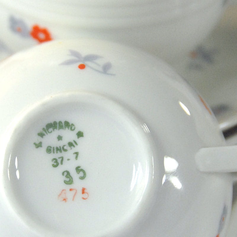 Sześć niedużych filiżanek do kawy Art Deco. Zrobione są z porcelany, dekorowane kalkomanią. Pochodzą z wytwórni Richarda Ginori w Mediolanie. Wyprodukowane w latach trzydziestych XX wieku. Sygnowane. Wymiary filiżanki: 7 x 5 cm. Średnica spodka: 11,5 cm.