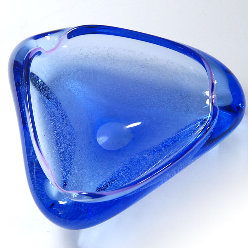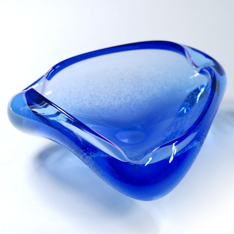 Popielnica zrobiona z kobaltowego szkła z dekoracyjnymi bąbelkami. Pochodzi z Czechosłowacji z lat siedemdziesiątych XX wieku. Wymiary: 16 x 16 x 16 cm. Wysokość: 6 cm.