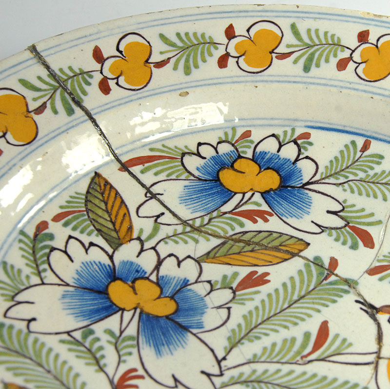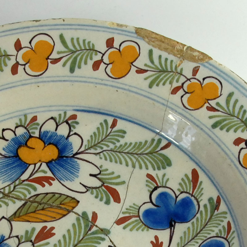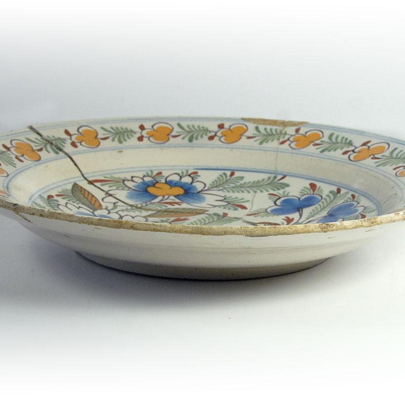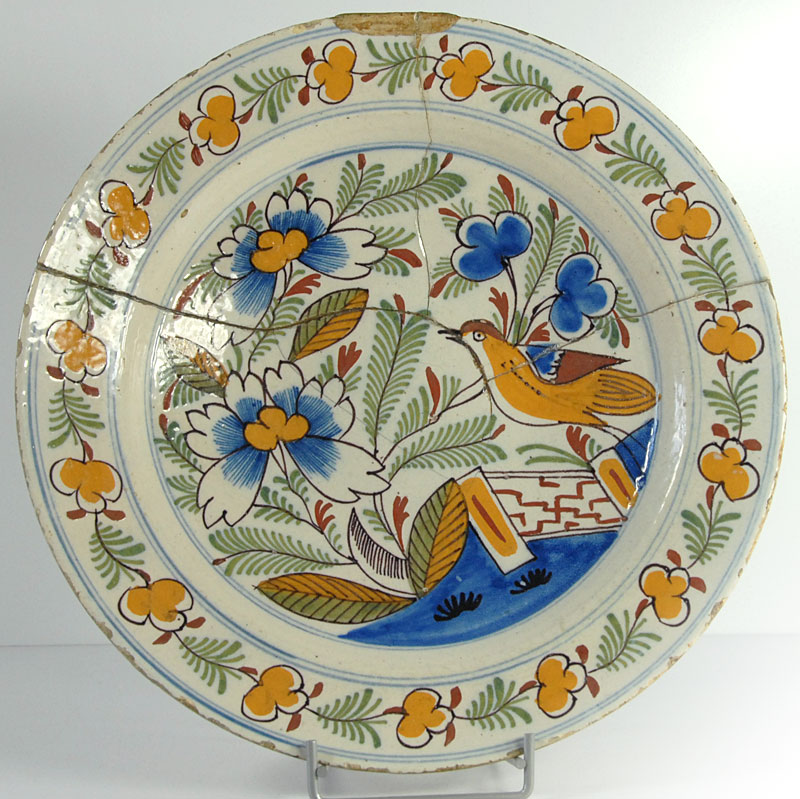 Unikatowy, duży i bardzo dekoracyjny talerz. Zrobiony jest z ręcznie malowanego fajansu. Pochodzi z niderlandzkiej wytwórni Delft z przełomu osiemnastego i dziewiętnastego wieku. Talerz ma stare naprawy i klejenia. Nosi ślady używania, zdrapania, przebarwienia i ubytki charakterystyczne dla wiekowego fajansu. Ma otwór umożliwiający zawieszenie. Średnica: 30,5 cm. Głębokość: 5 cm.