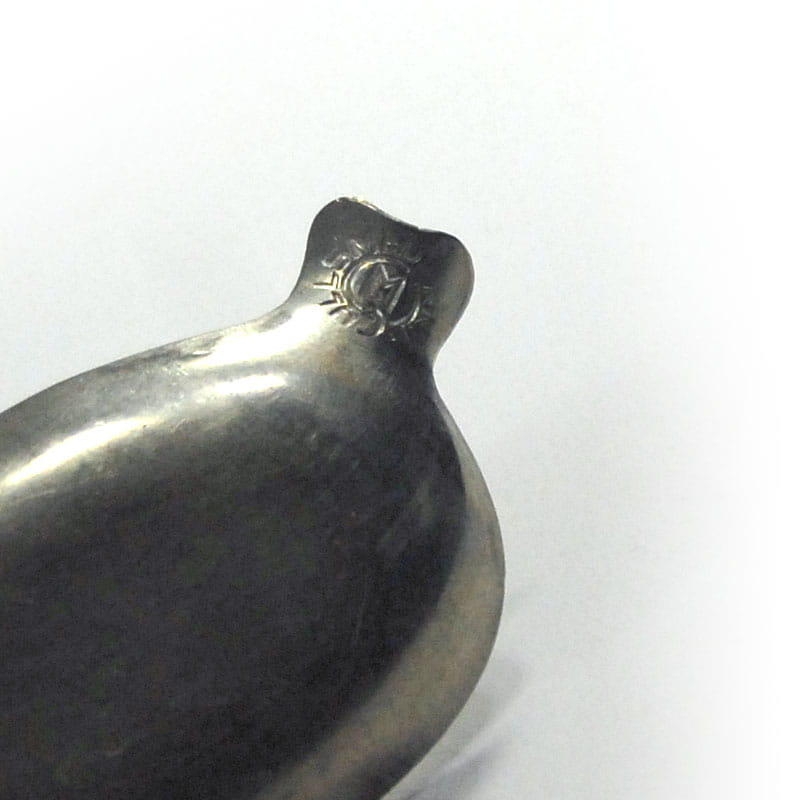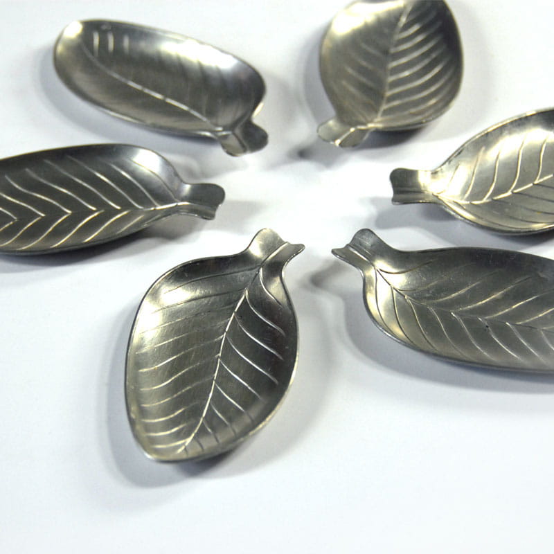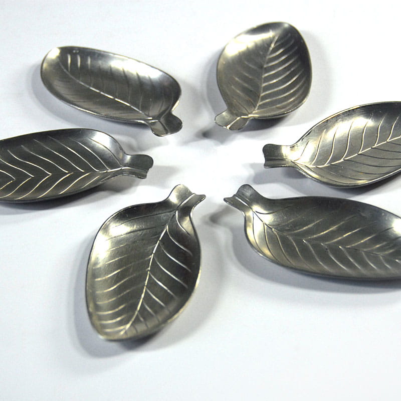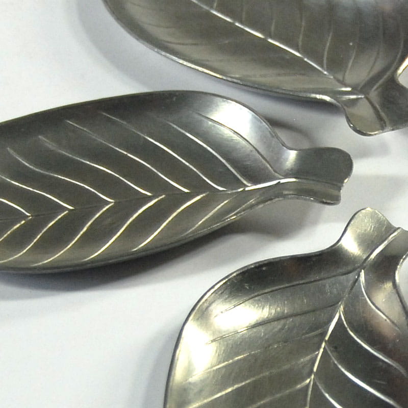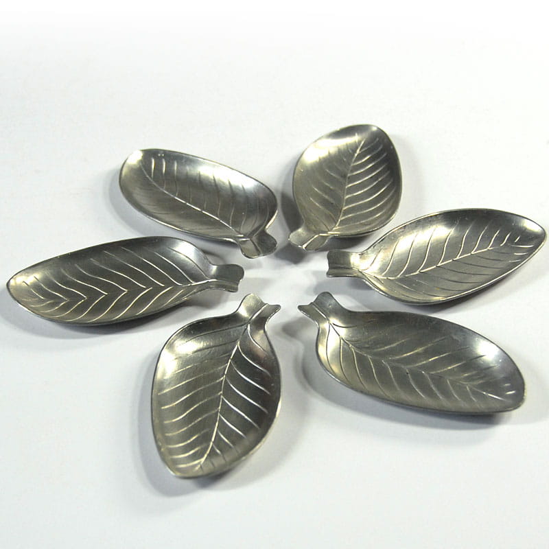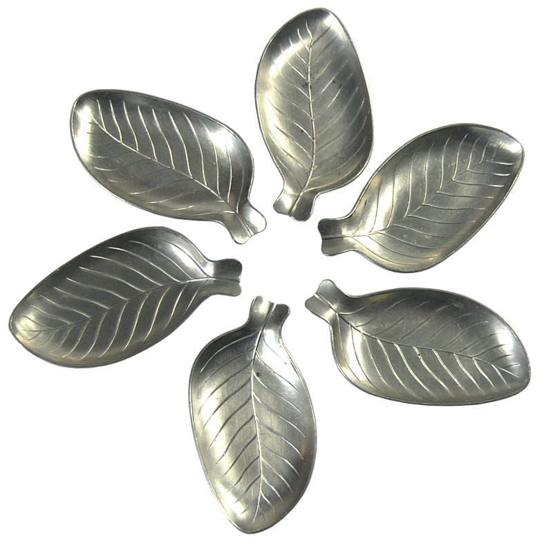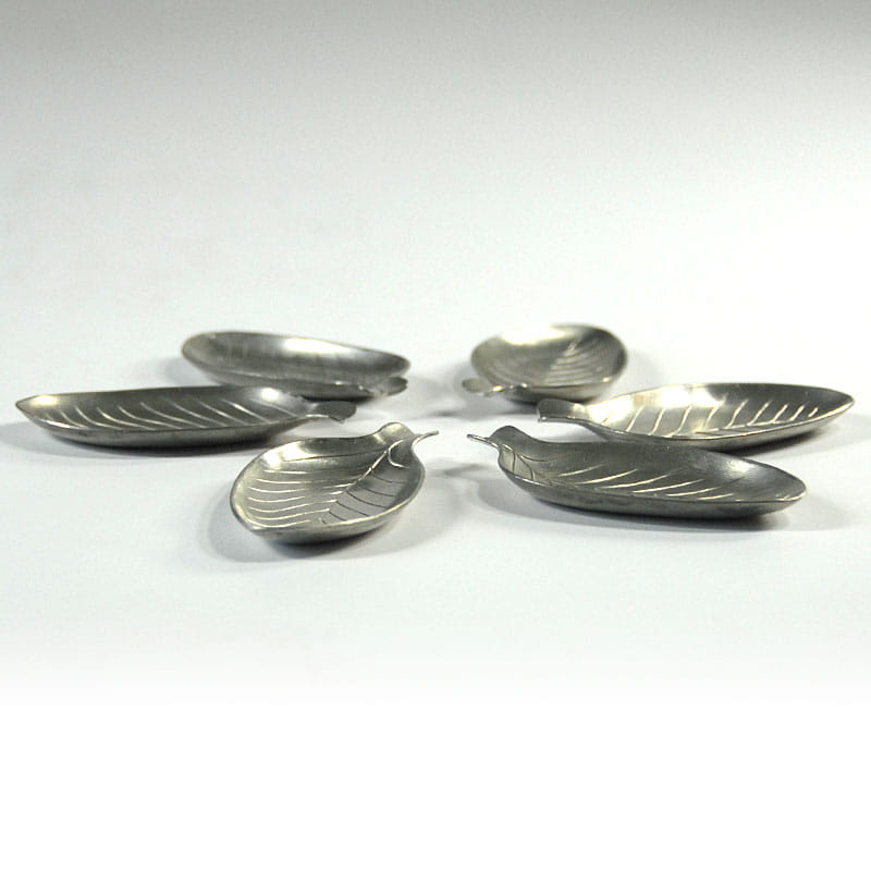 Komplet sześciu małych popielniczek stołowych w formie stylizowanych listków. Popielniczki pochodzą z Norwegii z lat sześćdziesiątych XX wieku. Sygnowane: Gullsmed Tinn. Zrobione są ze stopu cyny z ołowiem. Bardzo dobry stan zachowania z niewielkimi śladami używania. Wymiar pojedynczej popielniczki: 9,9 x 5 cm.