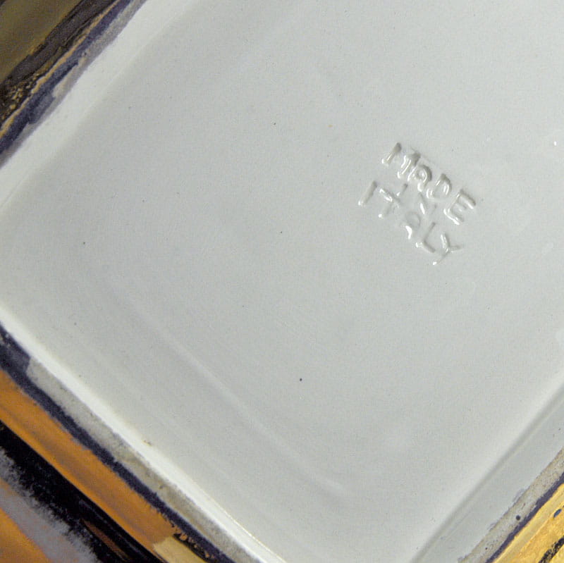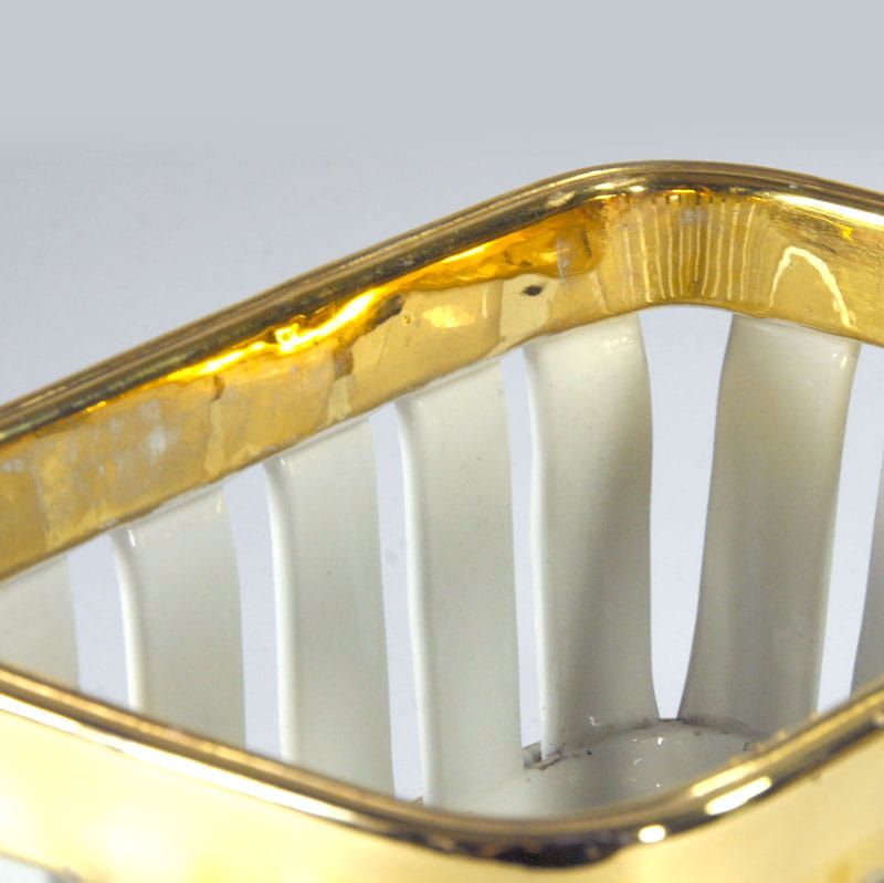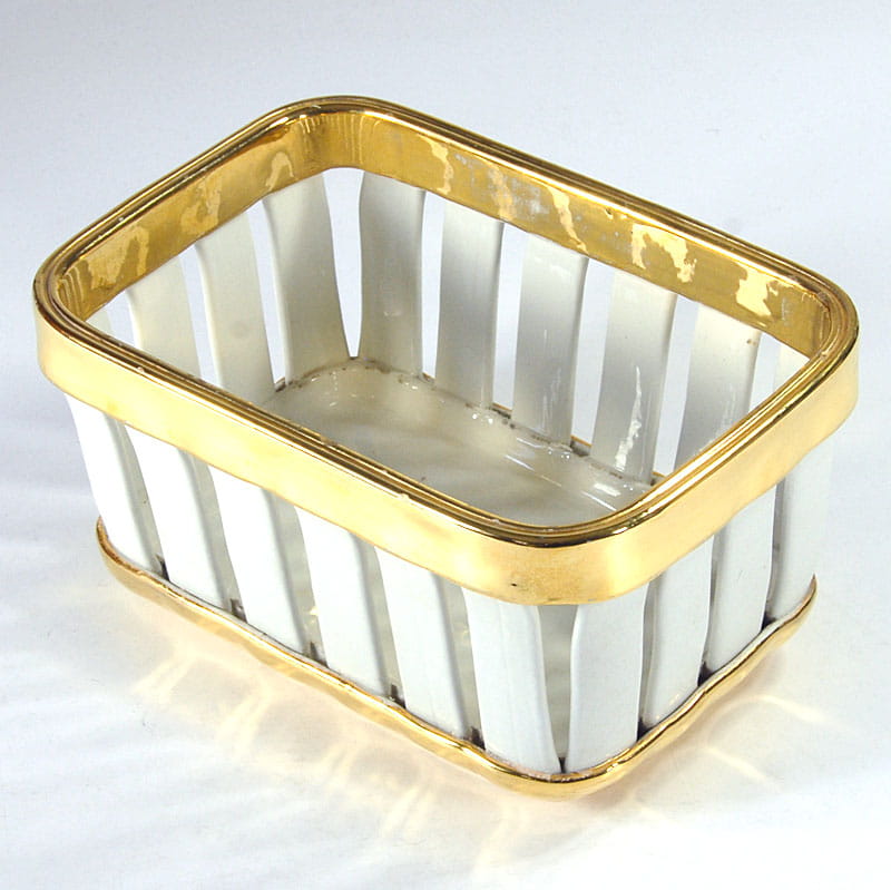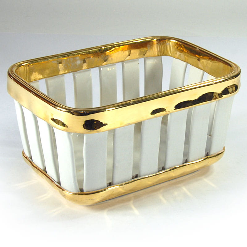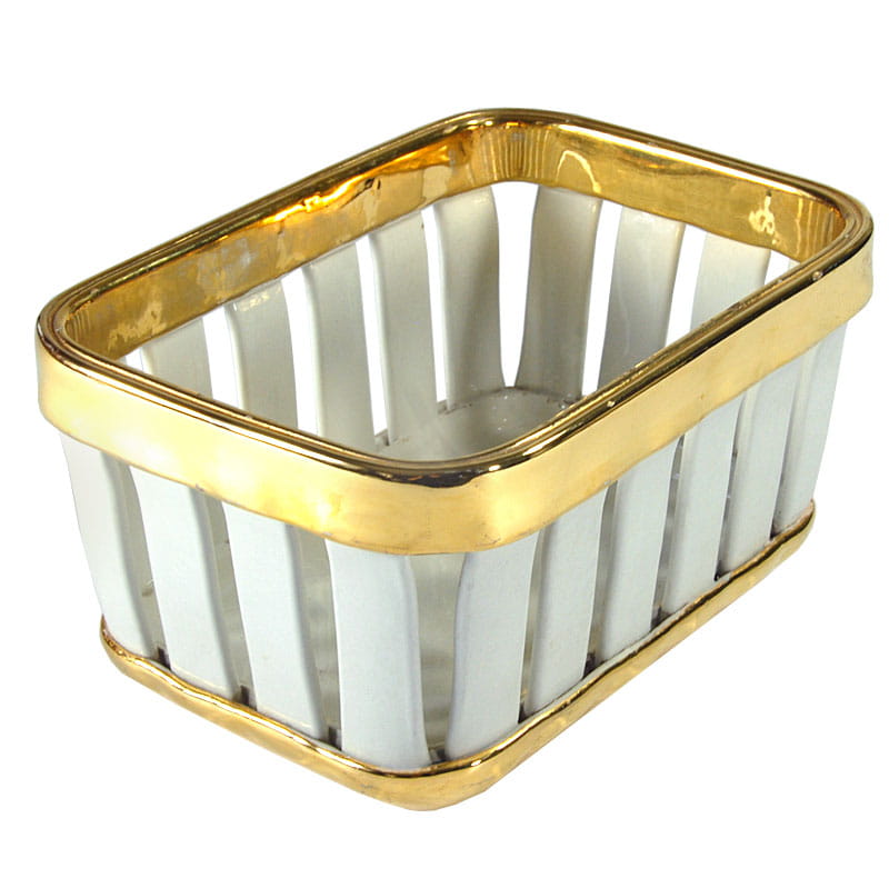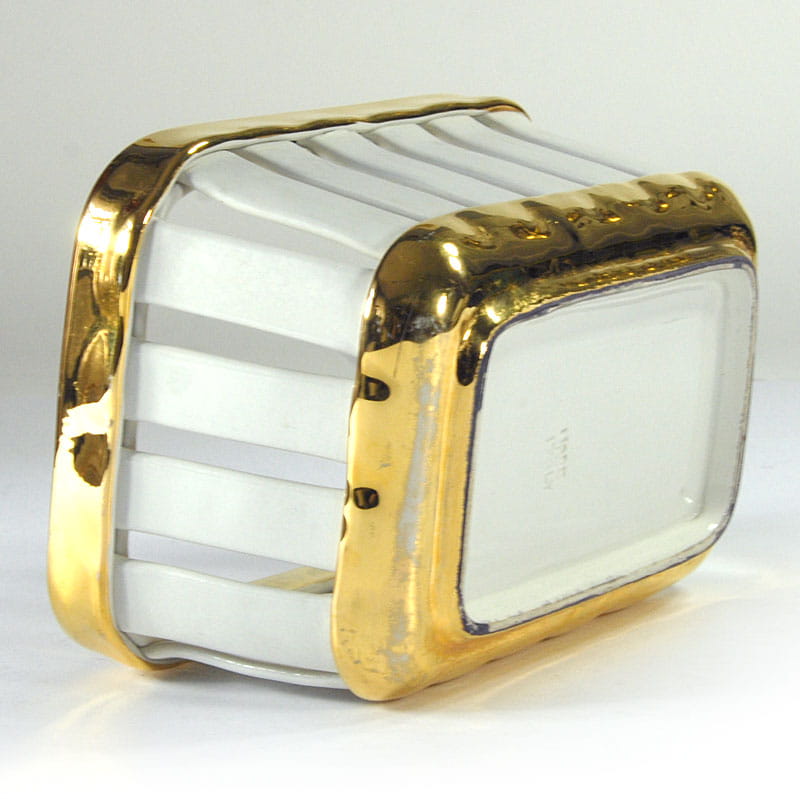 Duży, dekoracyjny kosz lub osłona na doniczkę zrobiona ze szkliwionej ceramiki. Listwy poziome są szkliwione z dużym połyskiem w kolorze złotym. Kosz pochodzi z Włoch z lat siedemdziesiątych XX wieku. Widoczne ślady używania w postaci przetarcia złocenia oraz drobnych ubytków. Wymiary: 24 x 16,5 cm. Wysokość: 13 cm.