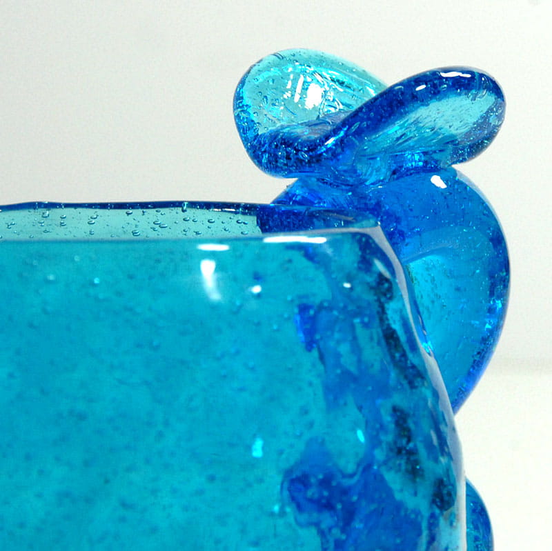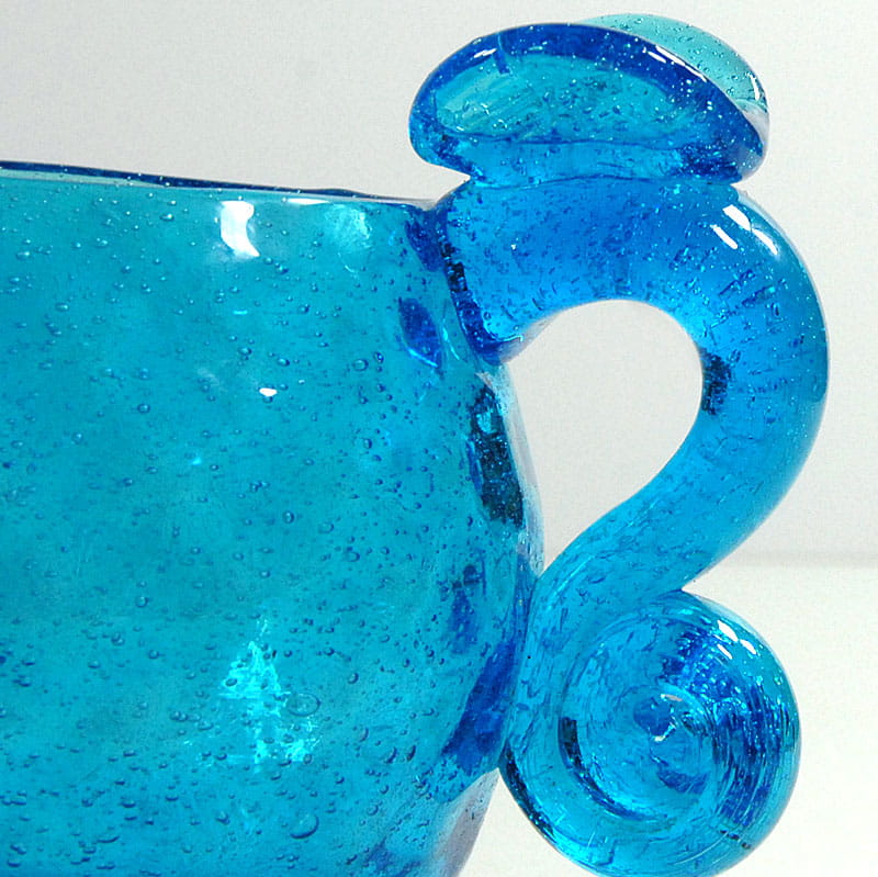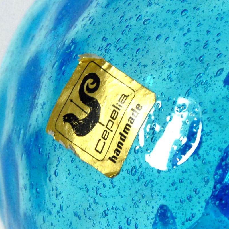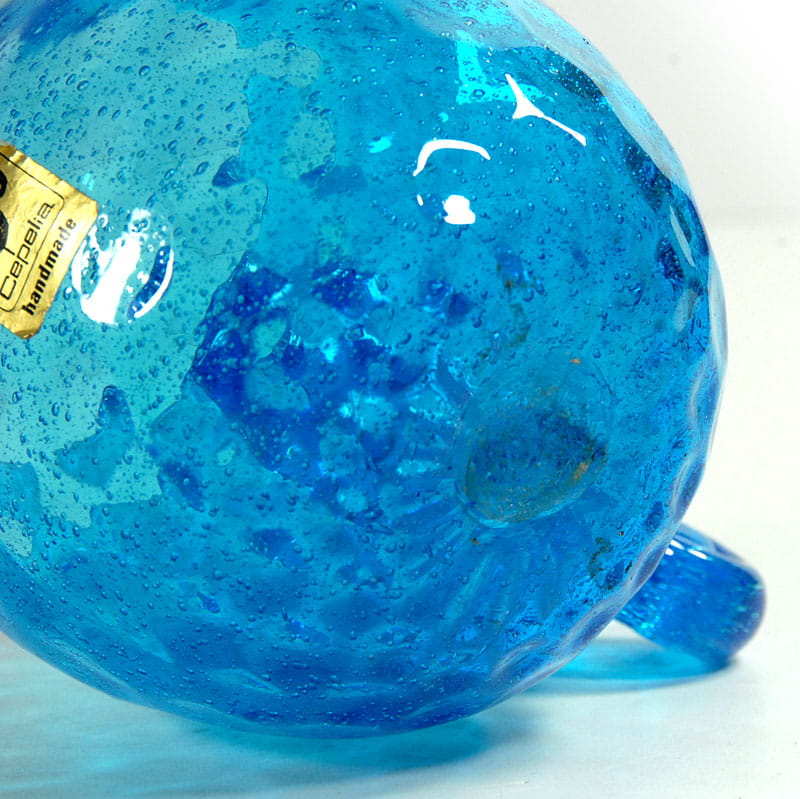 Bardzo dekoracyjny kubek/kufel zrobiony ze szkła sodowego w intensywnie błękitnym kolorze. Sygnowany naklejką Cepelii. Pochodzi z lat siedemdziesiątych XX wieku. Bardzo dobry stan zachowania. Wymiary: 12,5 x 15 x 10,5 cm.