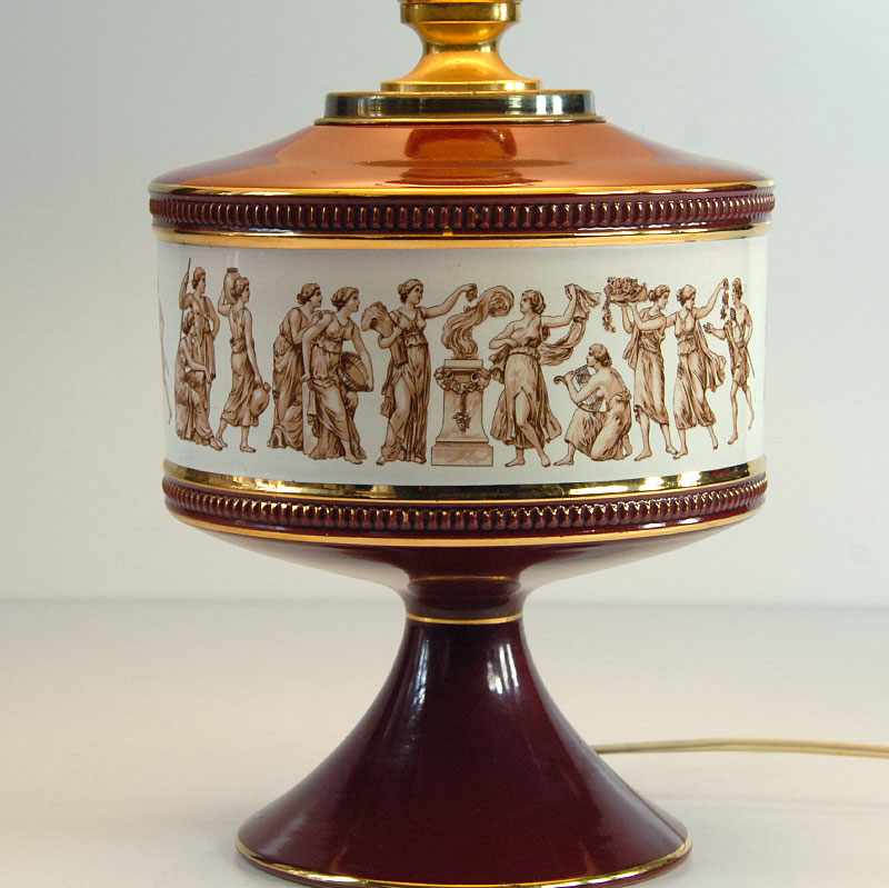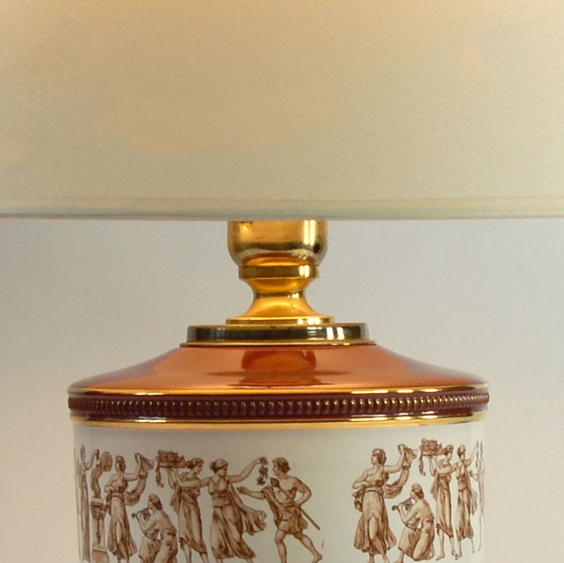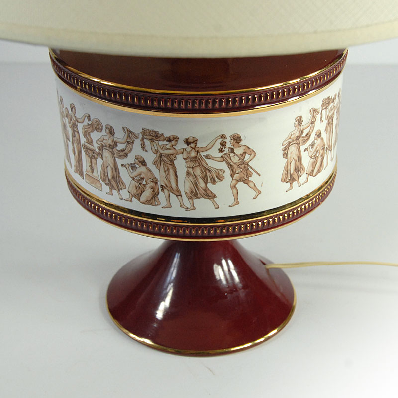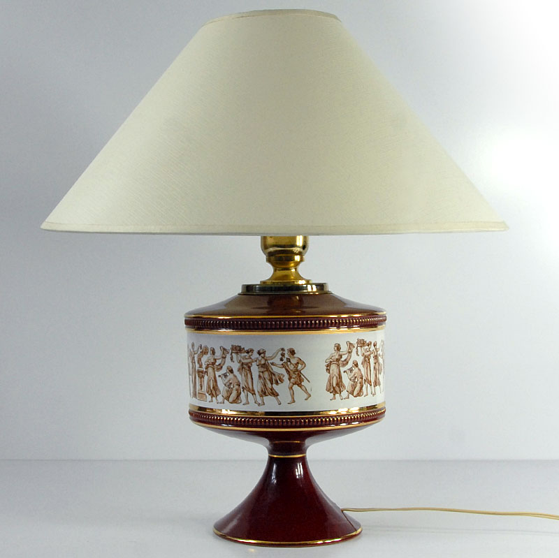 Dekoracyjna lampa stołowa zrobione z dekorowanej i złoconej ceramiki Fiorentine. Zdobione kalkomanią w stylu Piero Fornasettiego. Przedmiot pochodzi z Włoch z lat pięćdziesiątych XX w. Sygnowana. Lampa została uzupełniona o współczesny abażur. Delikatne ślady używania głównie w postaci drobnych przetarć złocenia. Wysokość lampy: 40 cm. Średnica abażuru: 35 cm. Średnica maksymalna podstawy lampy: 16 cm. Średnica dolna podstawy: 11 cm.