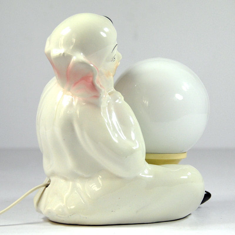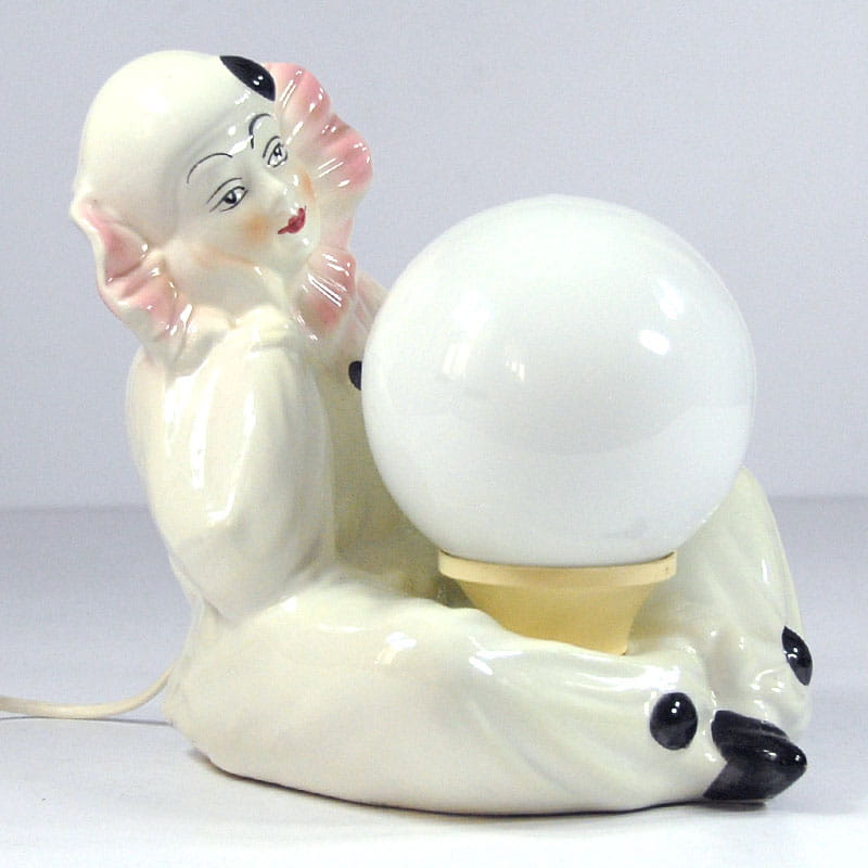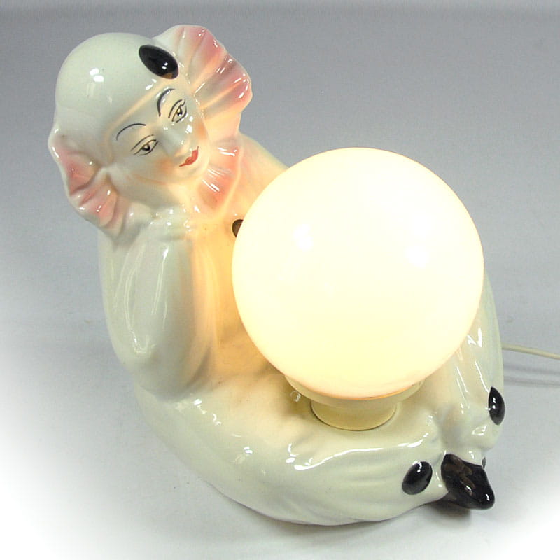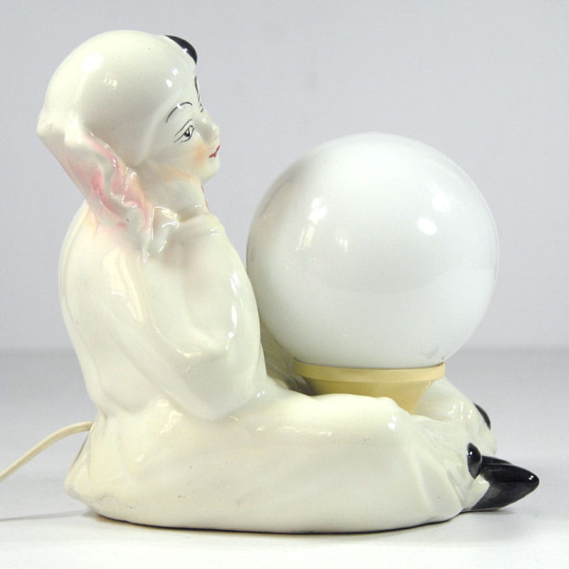 Lampa stołowa lub nocna zrobiona ze szkliwionej ceramiki w formie siedzącego Arlekina. Pochodzi z wytwórni Centrolux we włoskim Montobello. Pochodzi z lat osiemdziesiątych XX wieku. Zachowana w bardzo dobrym stanie. Żarówka z gwintem E14. Włącznik na kablu. Wymiary zewnętrzne lampy: 23 x 24 x 20 cm. Średnica klosza: 12 cm.