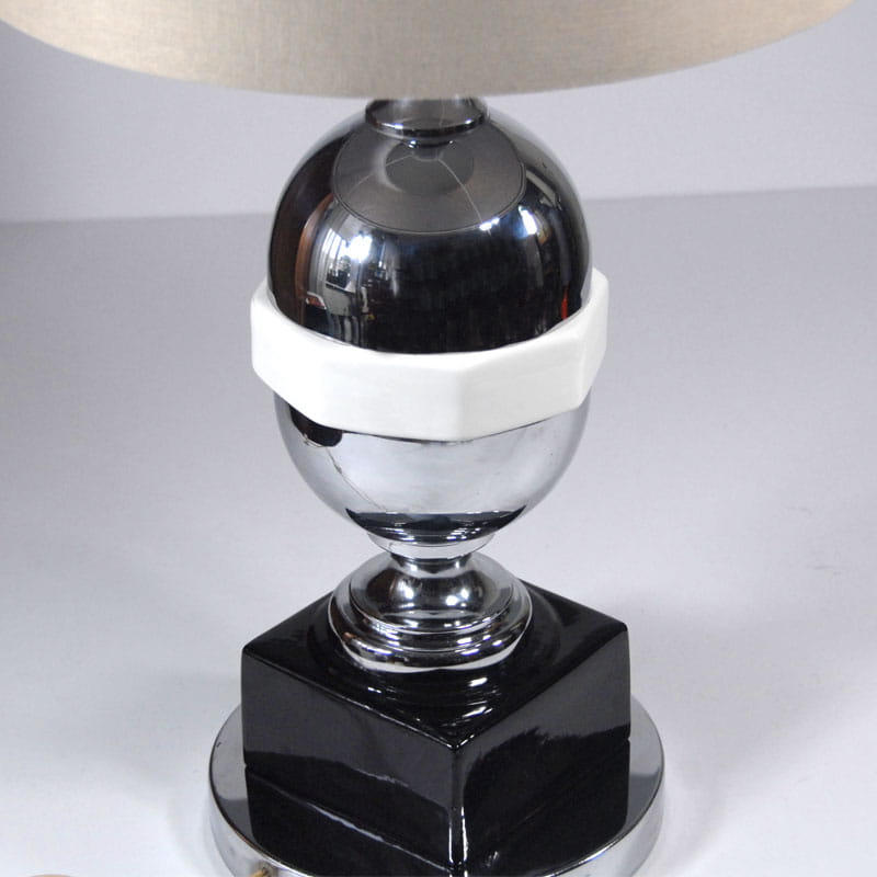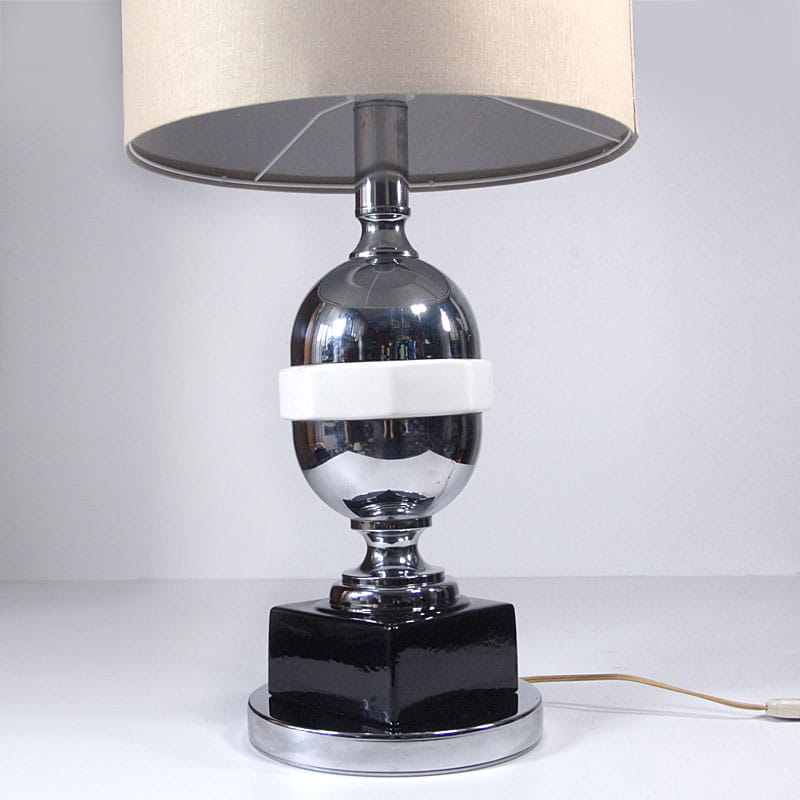 Bardzo efektowna lampa stołowa zaprojektowana w stylistyce Space Age. Podstawa zrobiona jest z chromowanego metalu łączonego ze szkliwioną ceramiką. Lampa pochodzi z wytwórni Massive w Belgii z lat siedemdziesiątych XX wieku. Zachowana jest w bardzo dobrym stanie z niewielkimi śladami używania. Obsadka na żarówkę z gwintem E@&. Włącznik na kablu. Lampa została uzupełniona o współczesny abażur. Wysokość całej lampy: 80 cm. Wysokość podstawy bez żarówki: 55 cm. Średnica abażuru: 42 cm. Średnica podstawy: 25 cm.