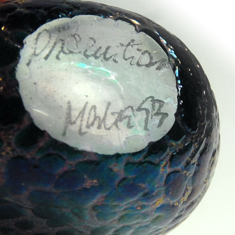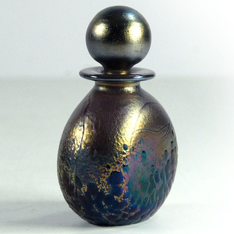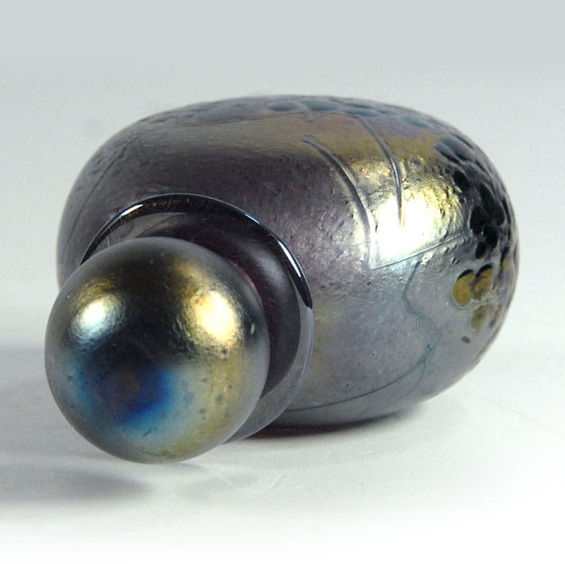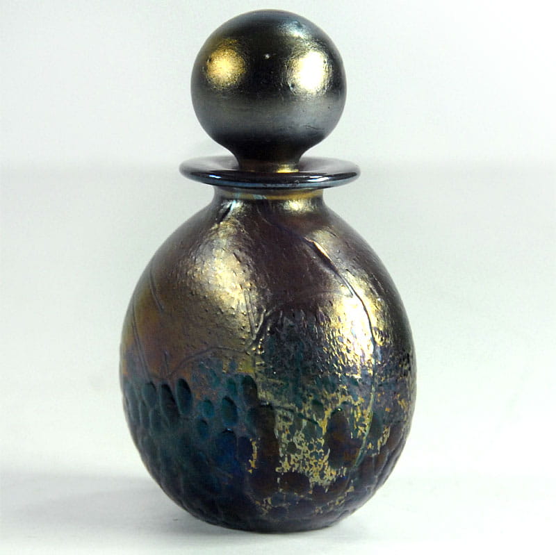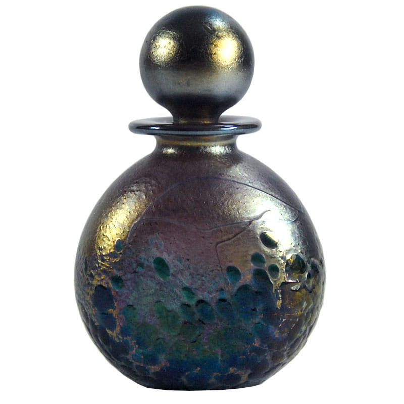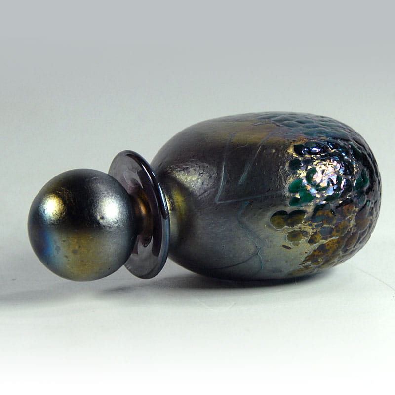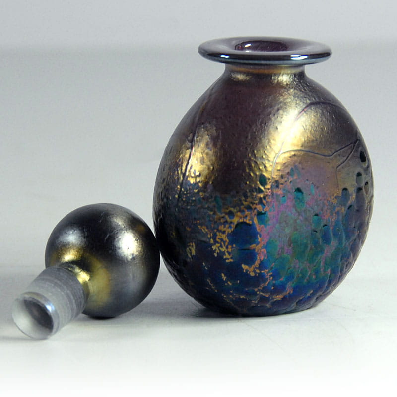 Bardzo efektowny, mały flakonik zrobiony ręcznie ze szkła w kolorze czarnym z delikatnie iryzującą fakturą. Prosty i wyrafinowany w formie. Pochodzi z pracowni Phoenician Glass na wyspie Malcta. Sygnowany i datowany. Oryginalny przedmiot vintage. Wymiary zewnętrzne: 9,5 x 6 x 4 cm.