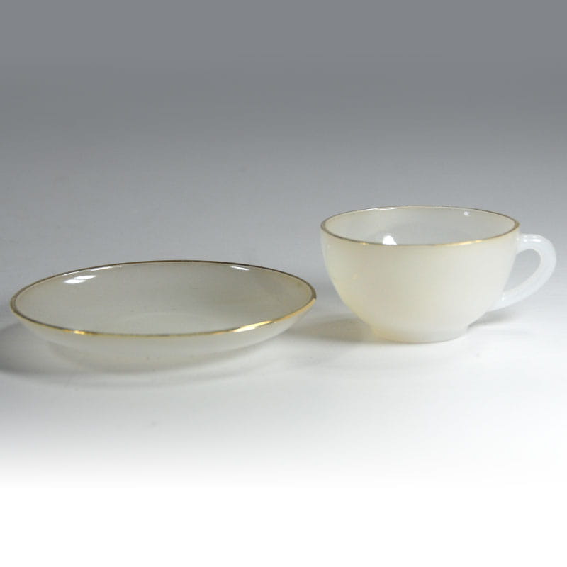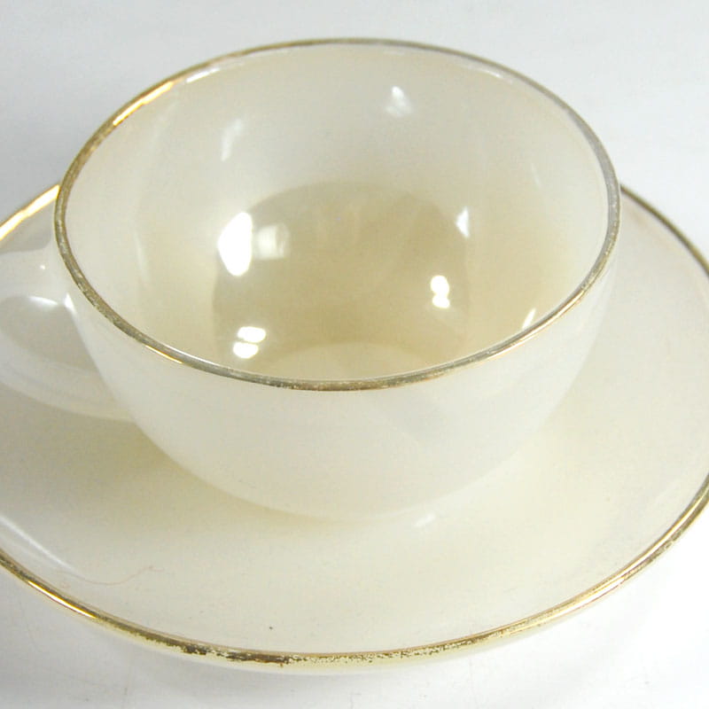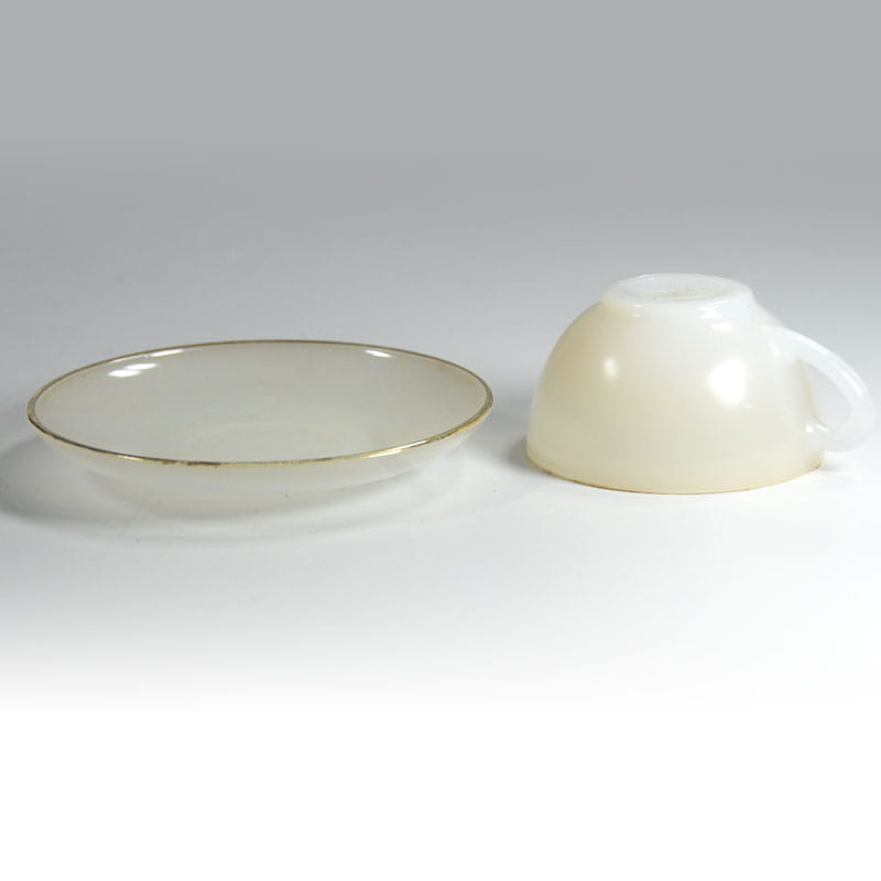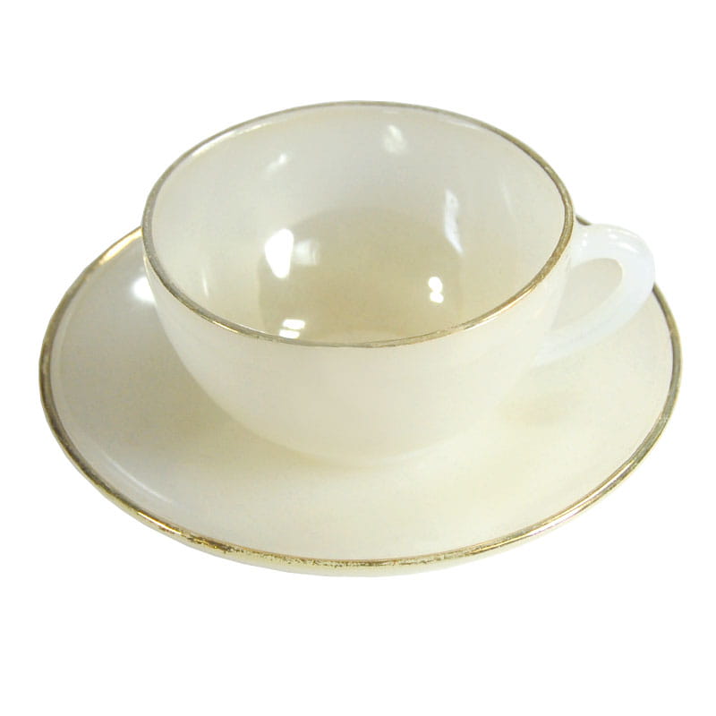 Mała, bardzo dekoracyjna filiżanka kawoea zrobiona z prasowanego lekko opalizującego szkła. Lekko złocona. Filiżanka pochodzi z Francji z wytwórni Arcopal z lat siedemdziesiątych XX wieku. Przetarcia złocenia. Średnica spodka: 11,5 cm. Wymiary filiżanki: 7,5 x 4 cm.