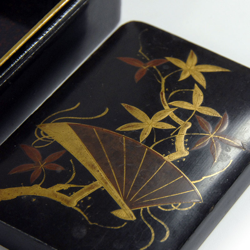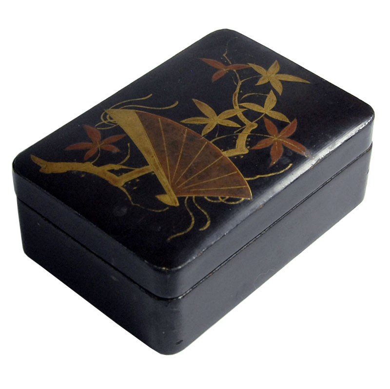 Dekoracyjna kasetka na drobiazgi zrobiona z lekkiego drewna i wykończona laką. Zdobiona jest ręcznie malowaną dekoracją orientalną, oraz jest delikatnie złocona. Wewnątrz lakierowana z dużym połyskiem. Pochodzi z początku XX wieku z Japonii. Nosi delikatne ślady używania. Wymiary: 10,5 x 7 x 4,5 cm.