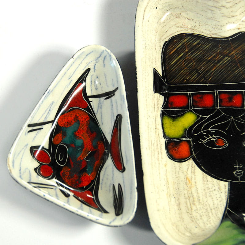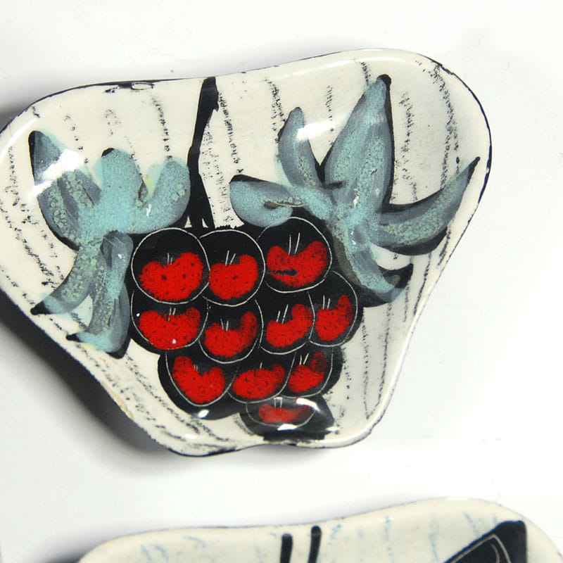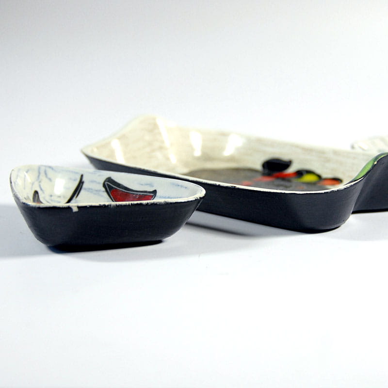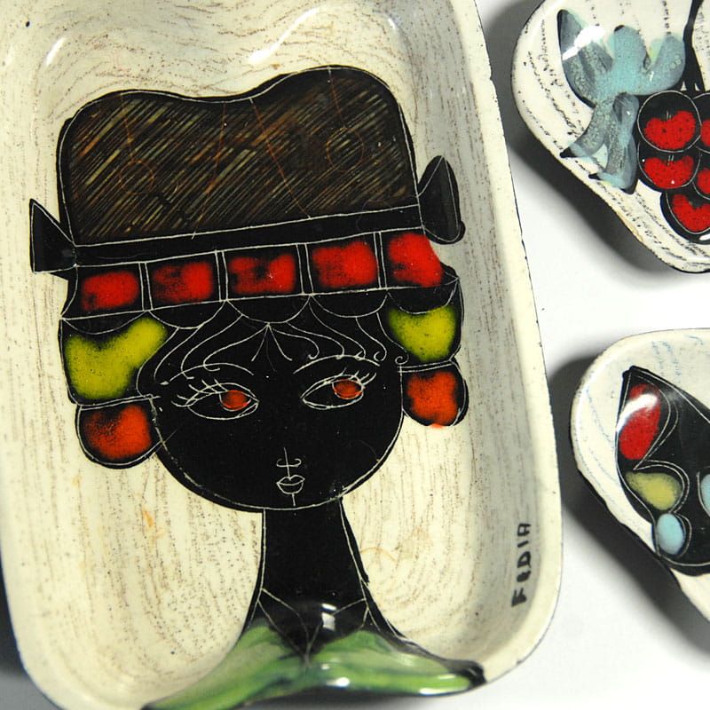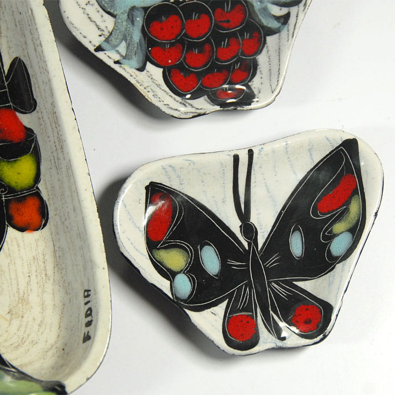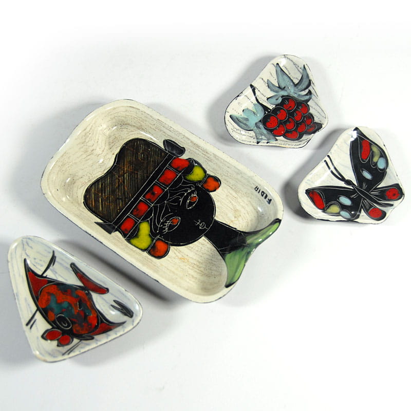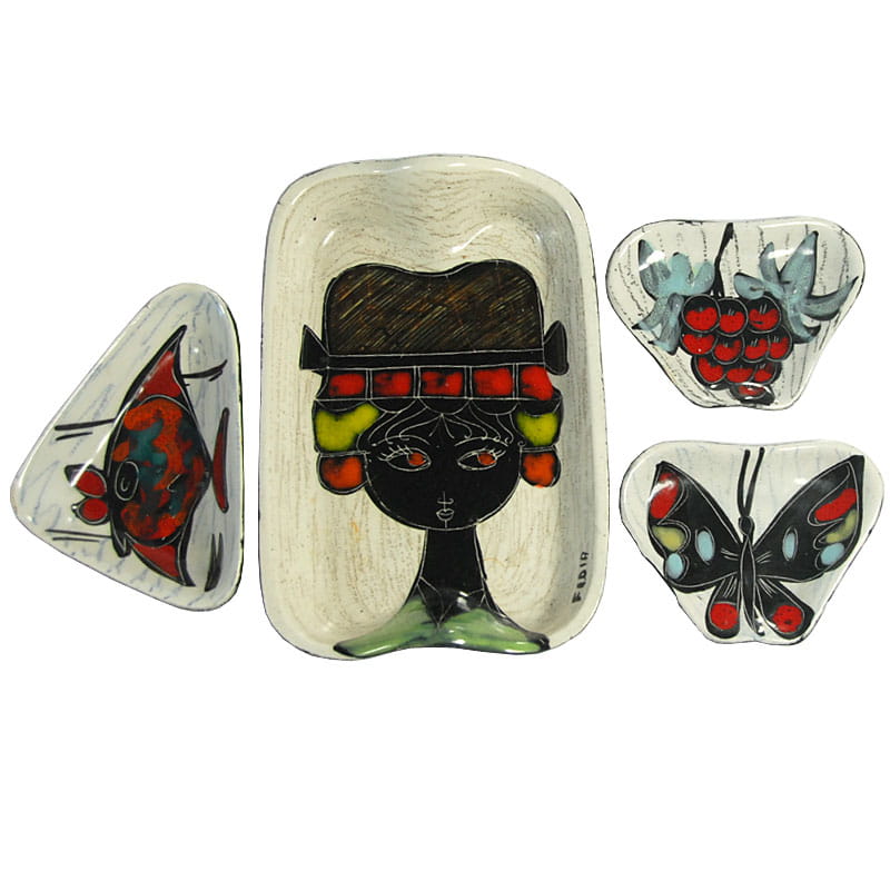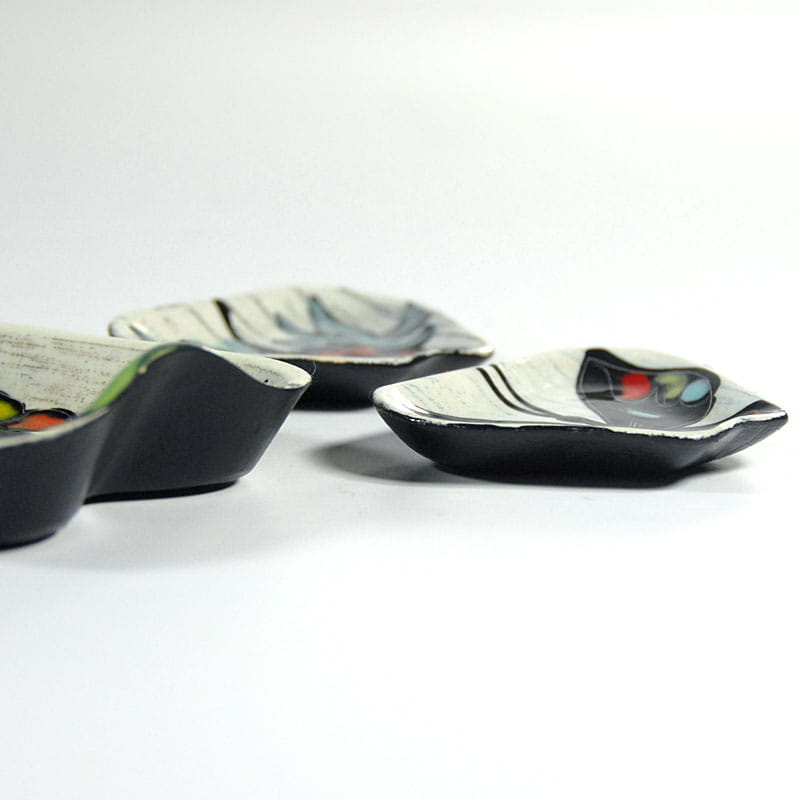 Zestaw miniaturowej ceramiki artystycznej pochodzący z Włoch z lat pięćdziesiątych XX wieku. Ceramika jest ręcznie wykonana, zdobiona techniką sgraffito i szkliwiona. Spod paterek są malowane. Sygnowane. Zachowane w bardzo dobrym stanie z minimalnymi śladami używania. Wymiary: 16 x 11 x 3 cm., 10,5 x 7 x 2,5 cm., 9 x 7 x 1,5 cm.