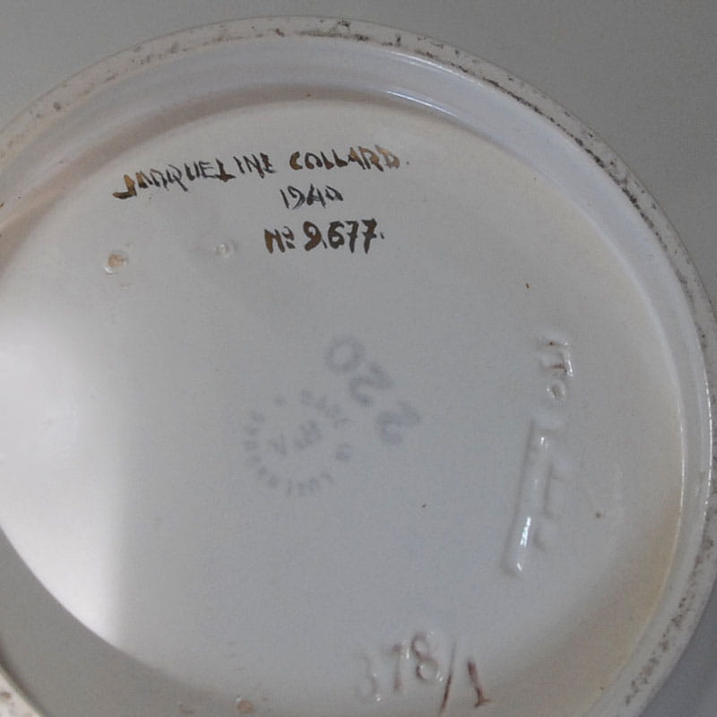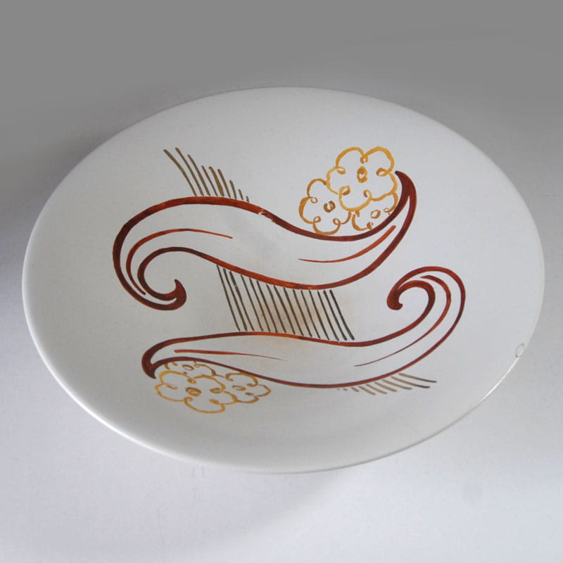 Duża, dekoracyjna misa w stylistyce Art Deco. Wyprodukowana w latach trzydziestych XX wieku w wytwórni V&B w Luxemburgu. Ręcznie zdobiona przez Jacqueline Collard w 1940 roku. Sygnowana znakami wytwórni oraz dekoratora. Niewielkie ślady używania. Pęknięcie włosowate przy krawędzi oraz delikatne przebarwienie na środku patery. Średnica: 36,5 cm. Wysokość: ok. 8 cm.
