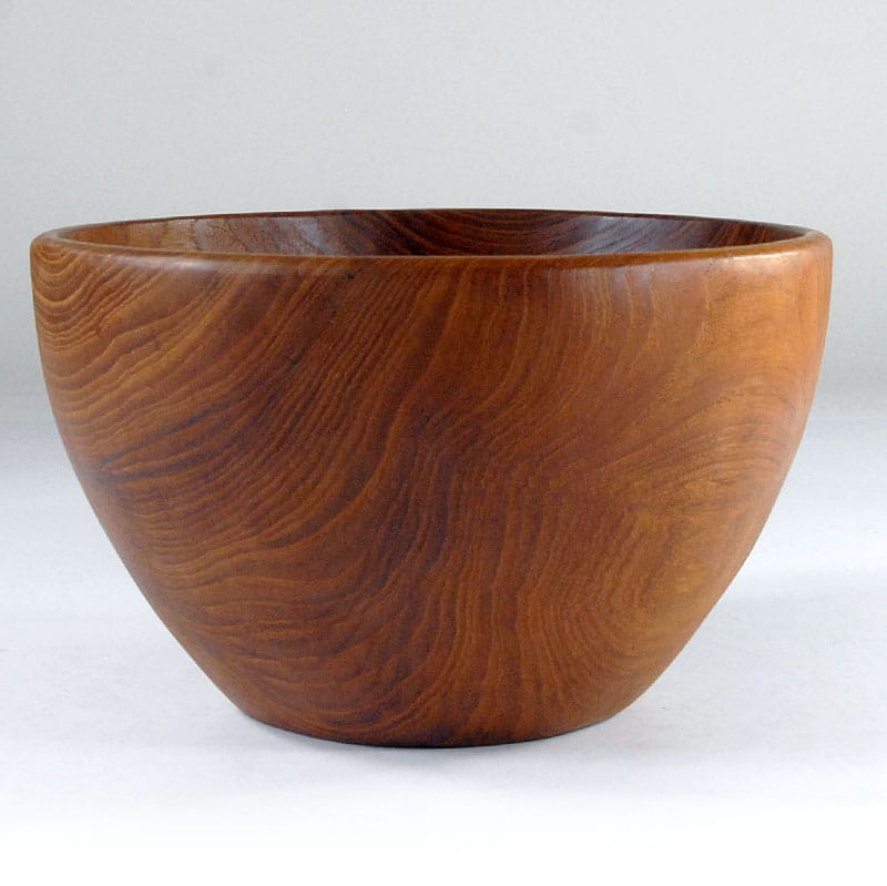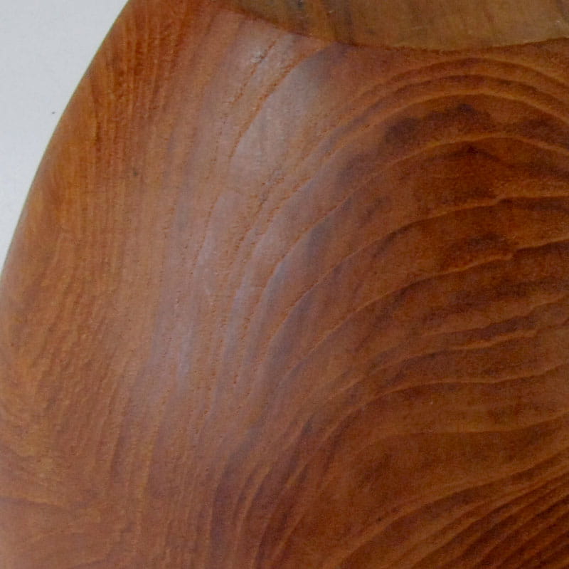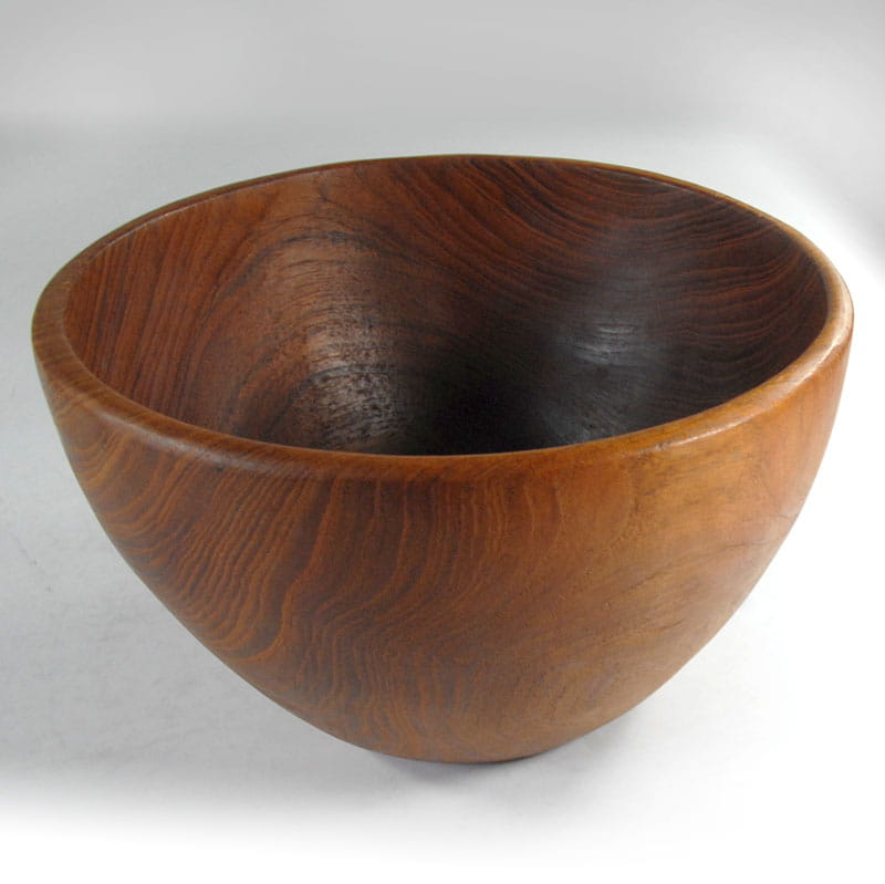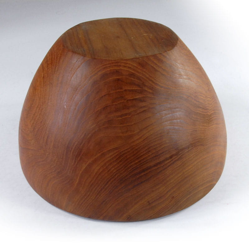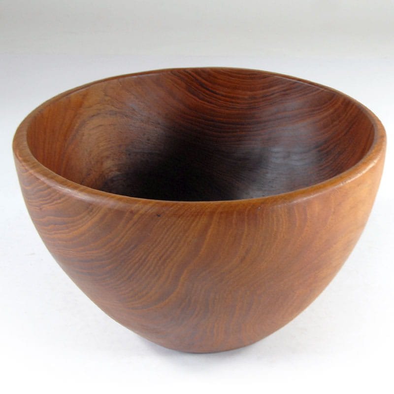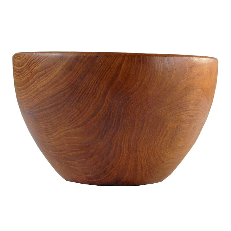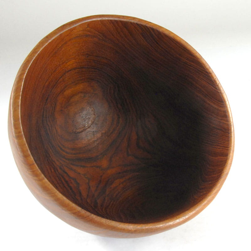 Duża i efektowna misa z olejowanego drewna tekowego. Oryginalny przedmiot vintage pochodzący z lat osiemdziesiatych XX wieku. Misa jest zachowana w bardzo dobrym stanie z niewielkimi śladami używania. Średnica: 25 cm. Wysokość: 15 cm. Średnica podstawy: 12,5 cm.