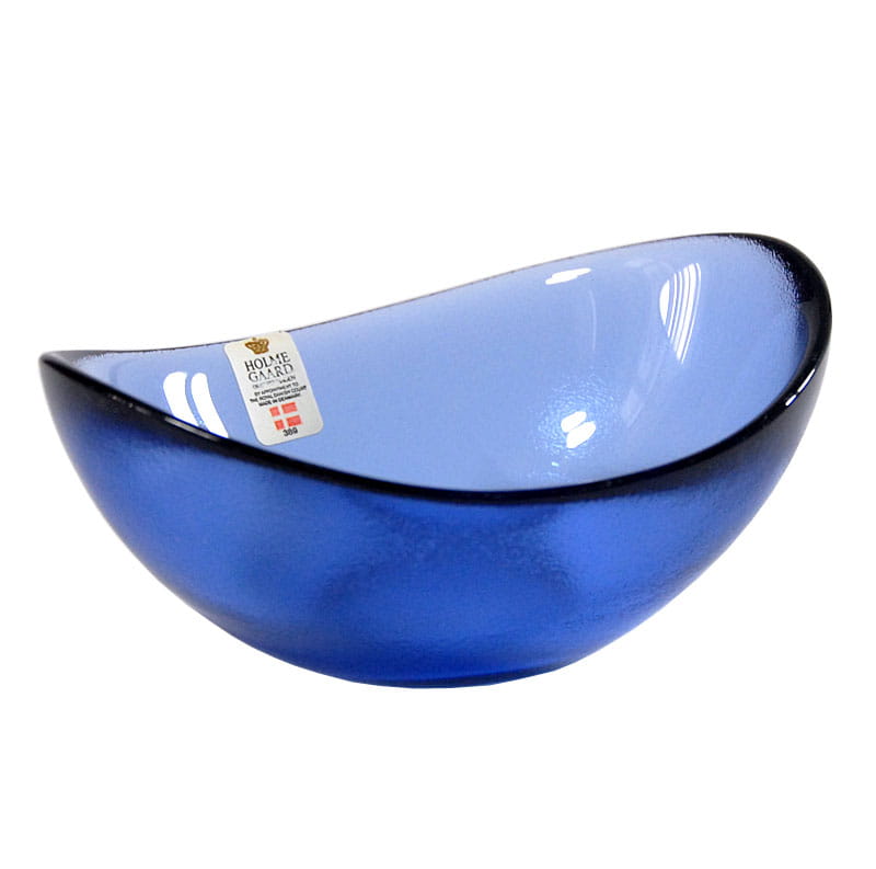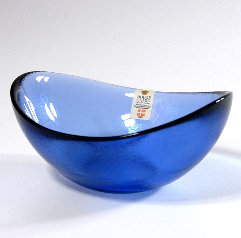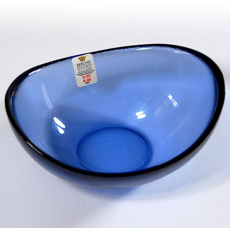 Nieduża miseczka ze szkła kolorowego z dekoracyjną fakturą. Piękny niebieski kolor. Pochodzi z renomowanej duńskiej wytwórni Holmegaard. Lata siedemdziesiąte XX wieku. Sygnowana. Wymiary: 13 x 10 x 5 cm.