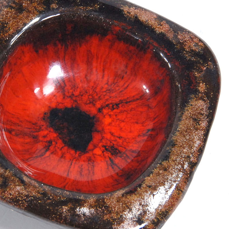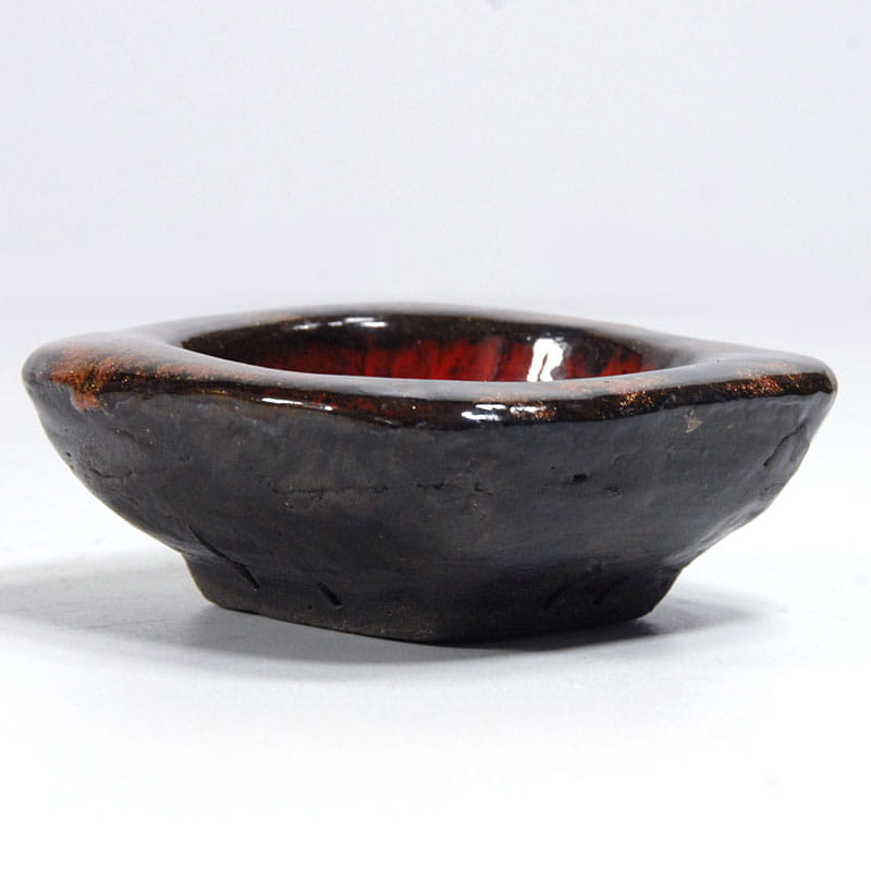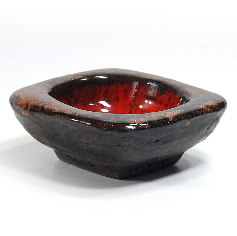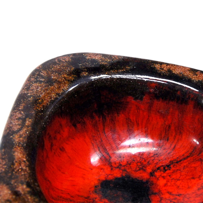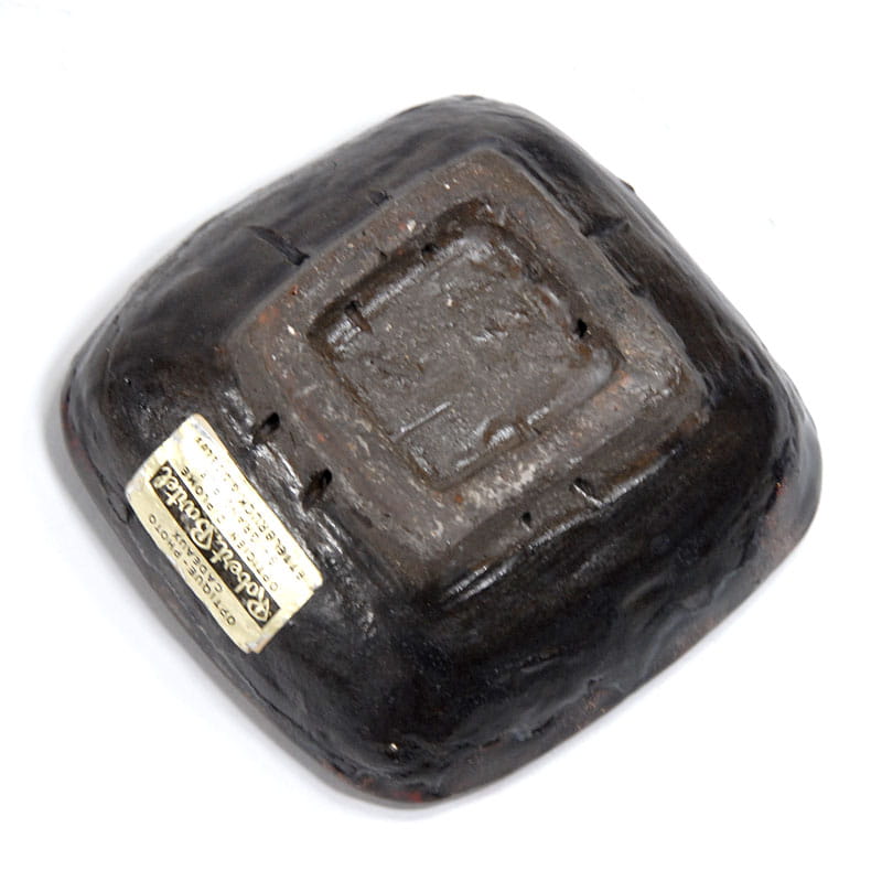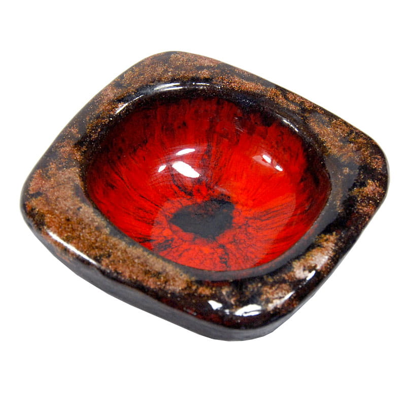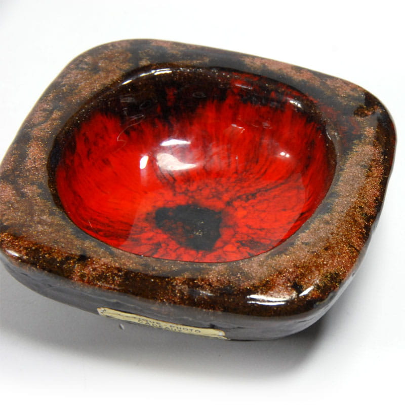 Mała, gruba miseczka zrobiona ręcznie z ceramiki. Zdobiona bardzo dekoracyjnym szkliwem zaciekowym w kilku kolorach. Miseczka pochodzi Holandii z lat siedemdziesiątych XX wieku. Zachowana jest w bardzo dobrym stanie. Na spodzie znajduje się naklejka sprzedawcy. Wymiary: 9,5 x 9,5 x 4 cm.