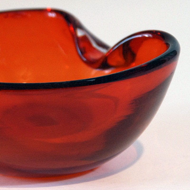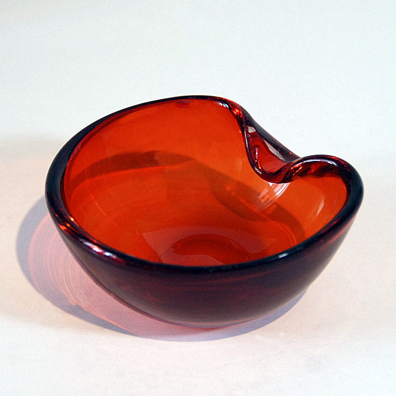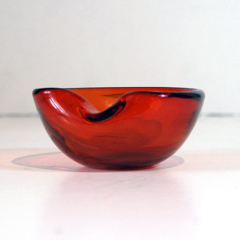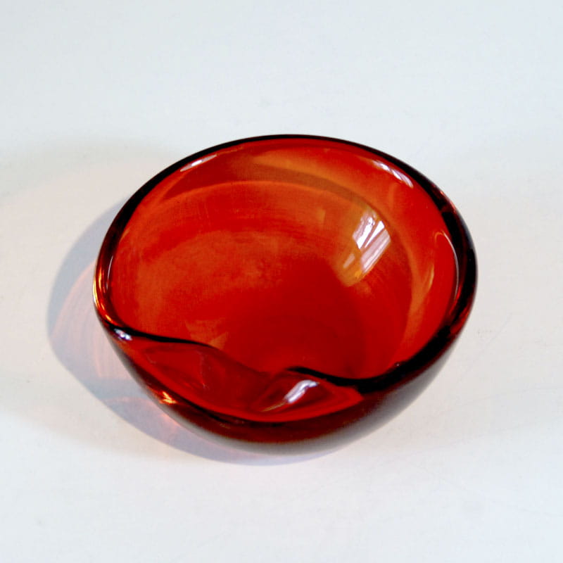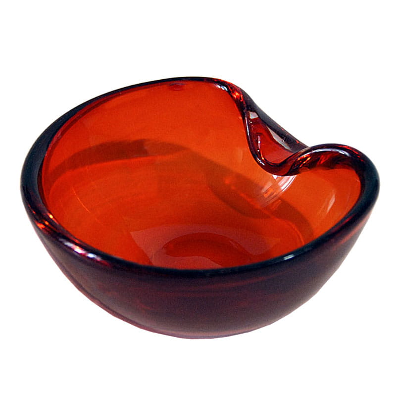 Bardzo efektowna czerwona paterka/popielniczka szklana wykonana w Danii przez firmę Holmegaard. Oryginalny przedmiot vintage pochodzący z lat sześćdziesiątych XX wieku. Średnica: ok. 11 cm. Wysokość: ok. 5 cm.