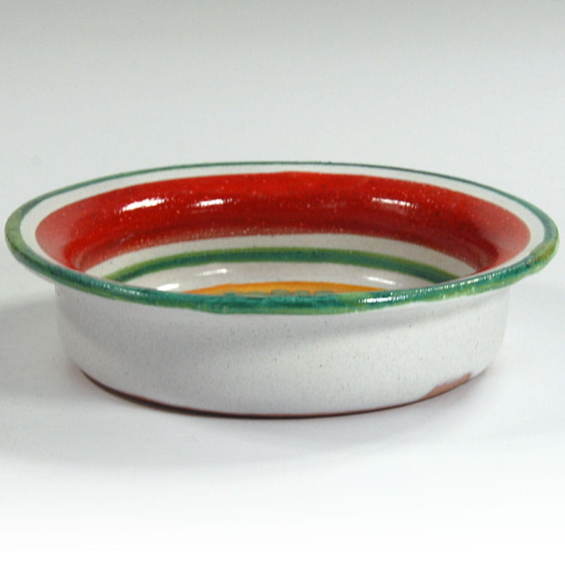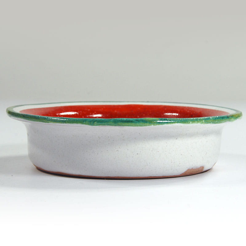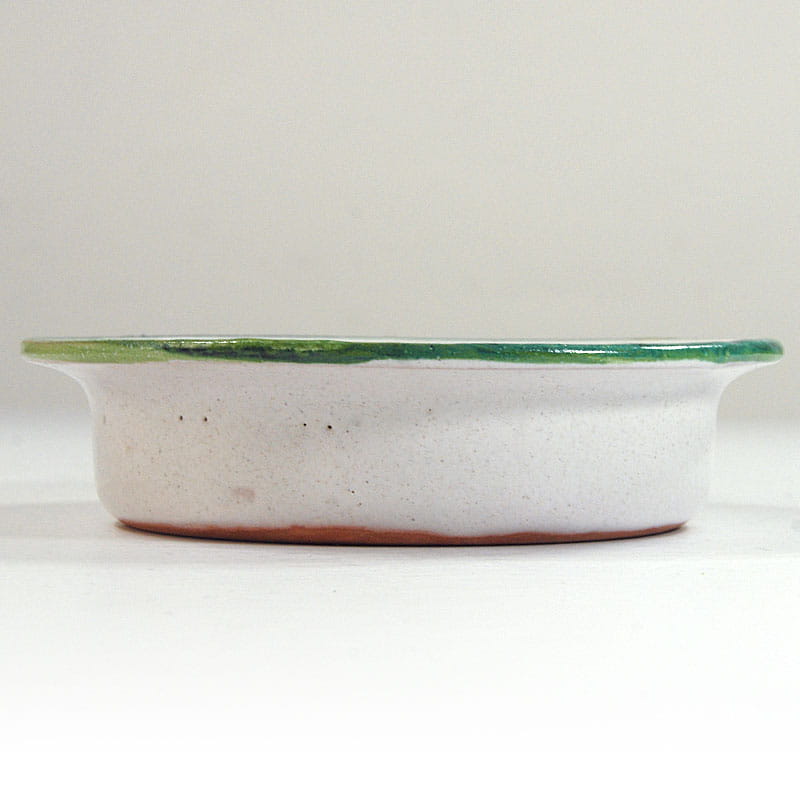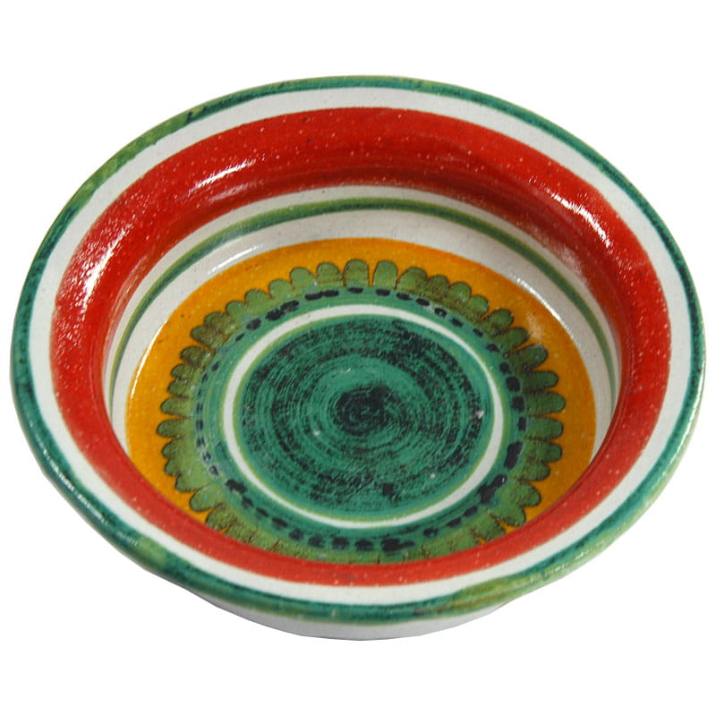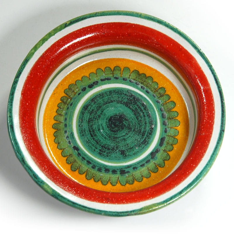 Efektowna miska zrobiona z ceramiki. Jest ręcznie malowana i szkliwiona. Pochodzi z wytwórni Giovanni Desimone utworzonej latach czterdziestych w Palermo na Sycylii. Giovanni Desimone studiował i pracował pod kierunkiem Pabla Picassa. Miseczka pochodzi z lat sześćdziesiątych/siedemdziesiątych, czyli z ostatniego okresu pracy Desimone. Zachowana jest w bardzo dobrym stanie. Sygnowana. Wymiary: 17 x 4 cm.