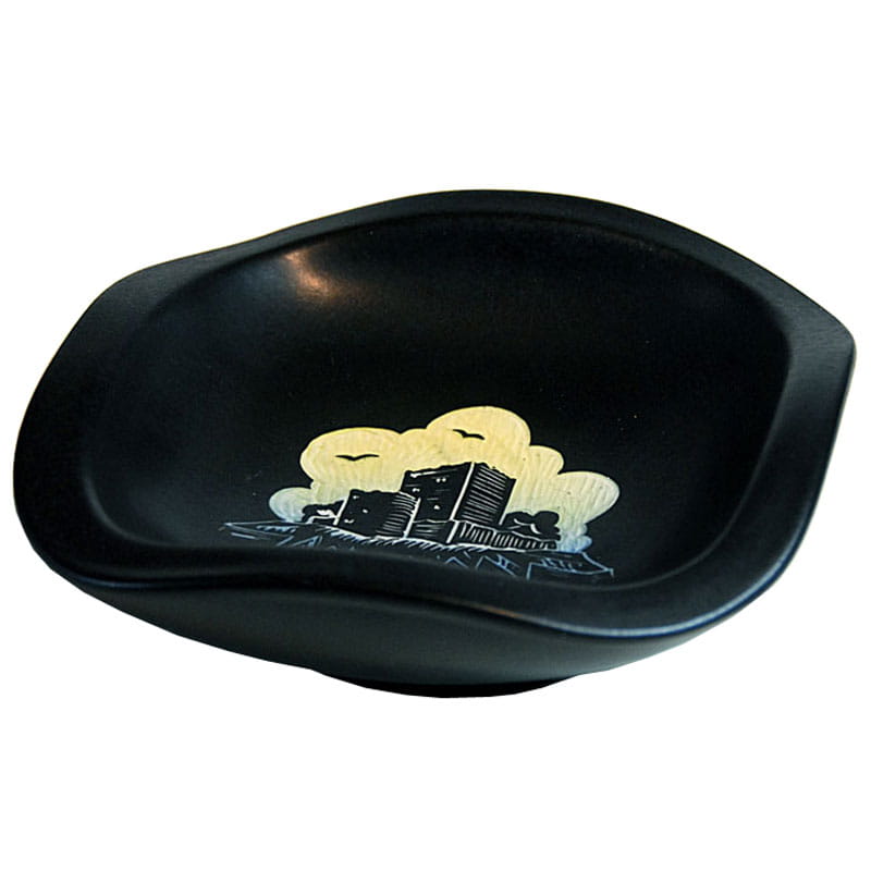 Patera ceramiczna szkliwiona i ręcznie dekorowana. Sygnowana: Soholm, Bornholm GJ oraz numerycznie:2047. Zaprojektowana przez Jorgena Mogensena. Oryginalny przedmiot vintage pochodzący z lat sześćdziesiątych XX w. Wyprodukowana w Danii. Wysokość: ok. 6 cm., średnica: ok. 18 cm.