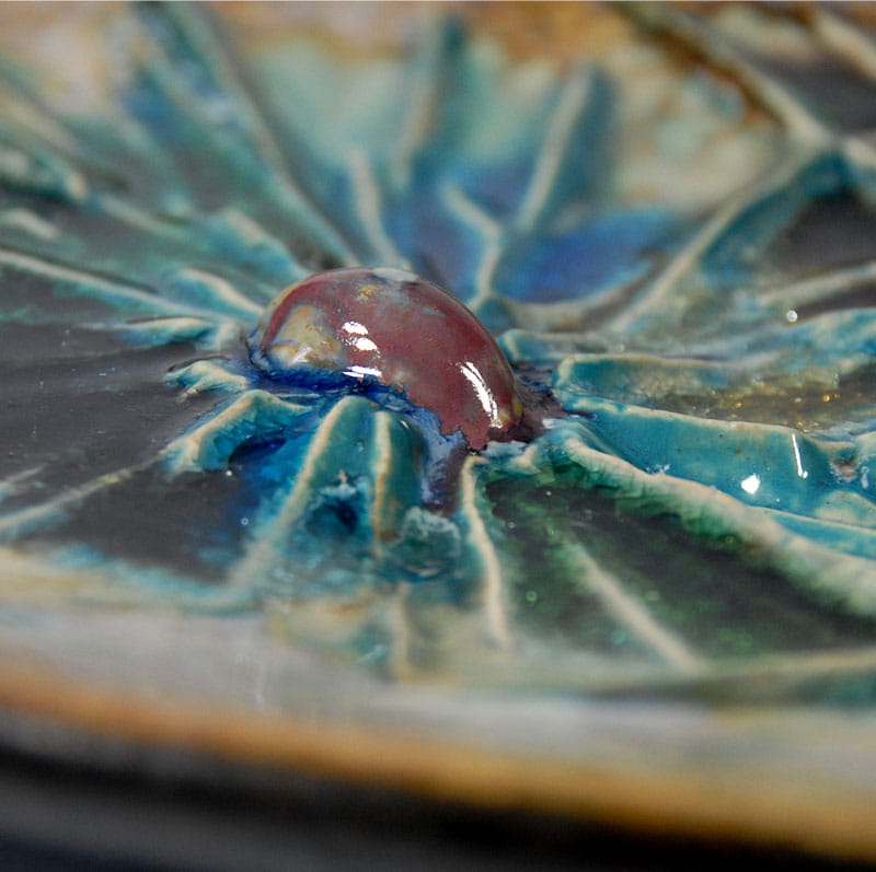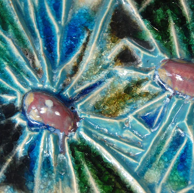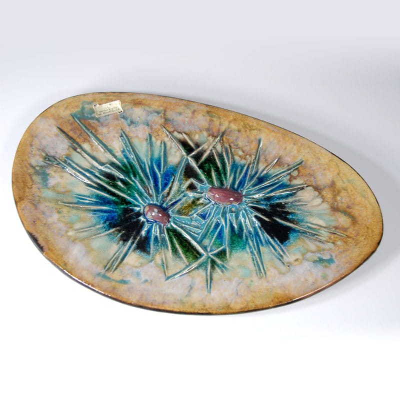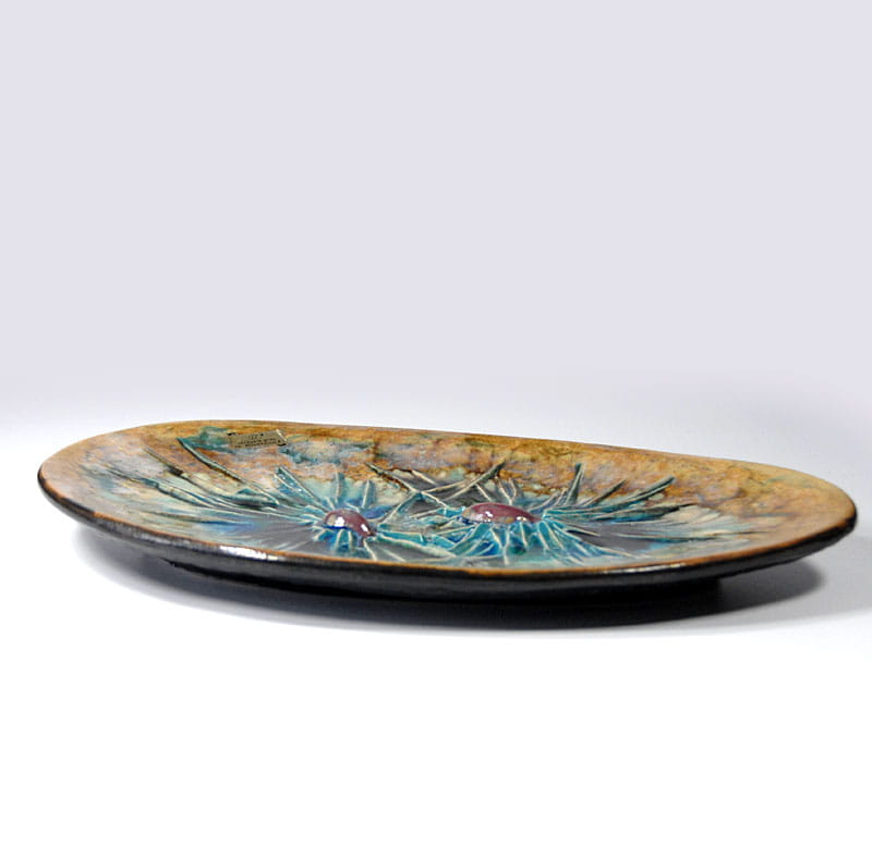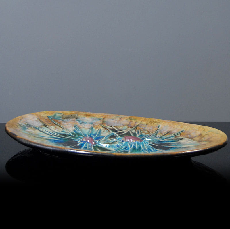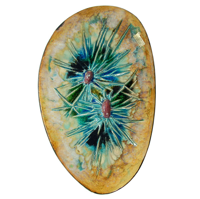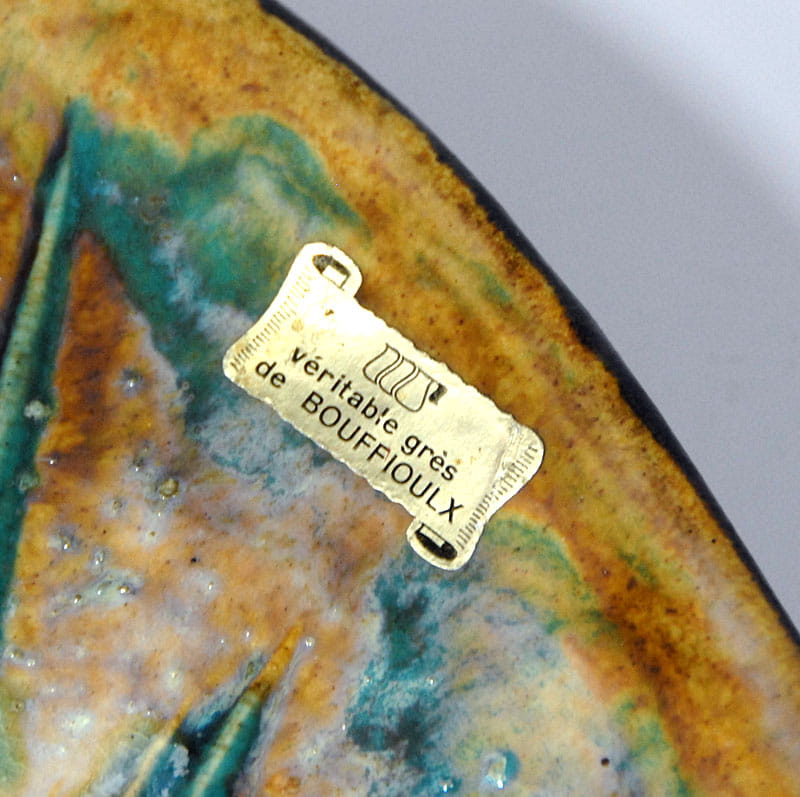 Ogromna, rzeźbiarska patera zrobiona ręcznie z rzeźbionej, malowanej oraz szkliwionej ceramiki. Grube szkliwo z bardzo efektowną krakelurą. Przedmiot unikatowy. Patera pochodzi z belgijskiej wytwórni Gres Bouffioulx. Sygnatura znajduje się na naklejce. Patera posiada z tyłu otwory umożliwiające zawieszenie na ścianie. Wymiary: 50 x 30 cm. Wysokość: 5 cm.