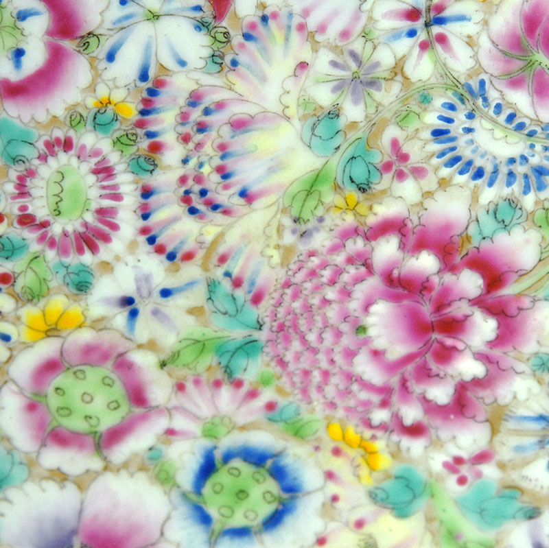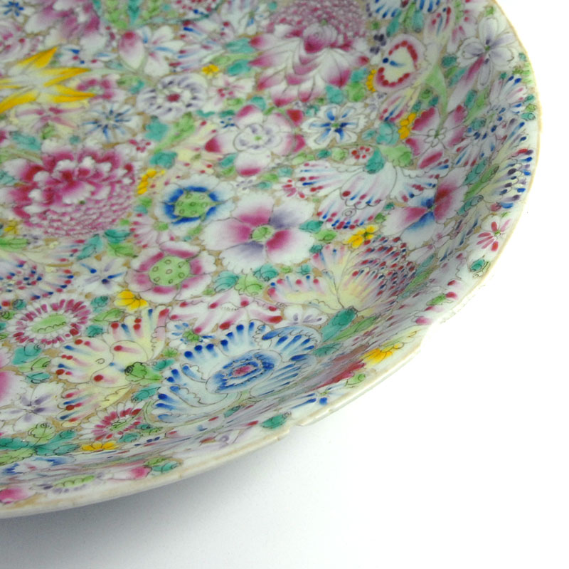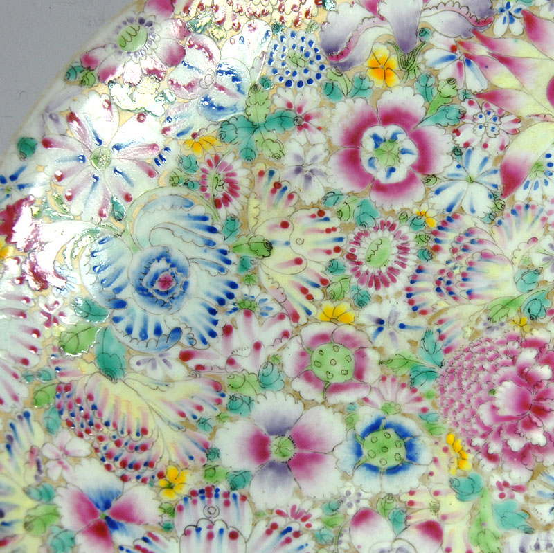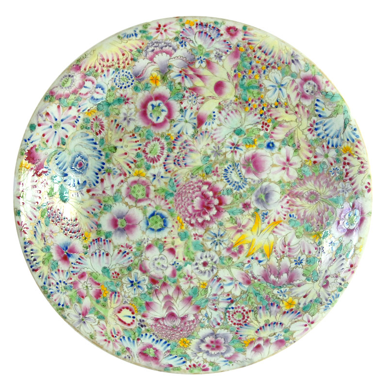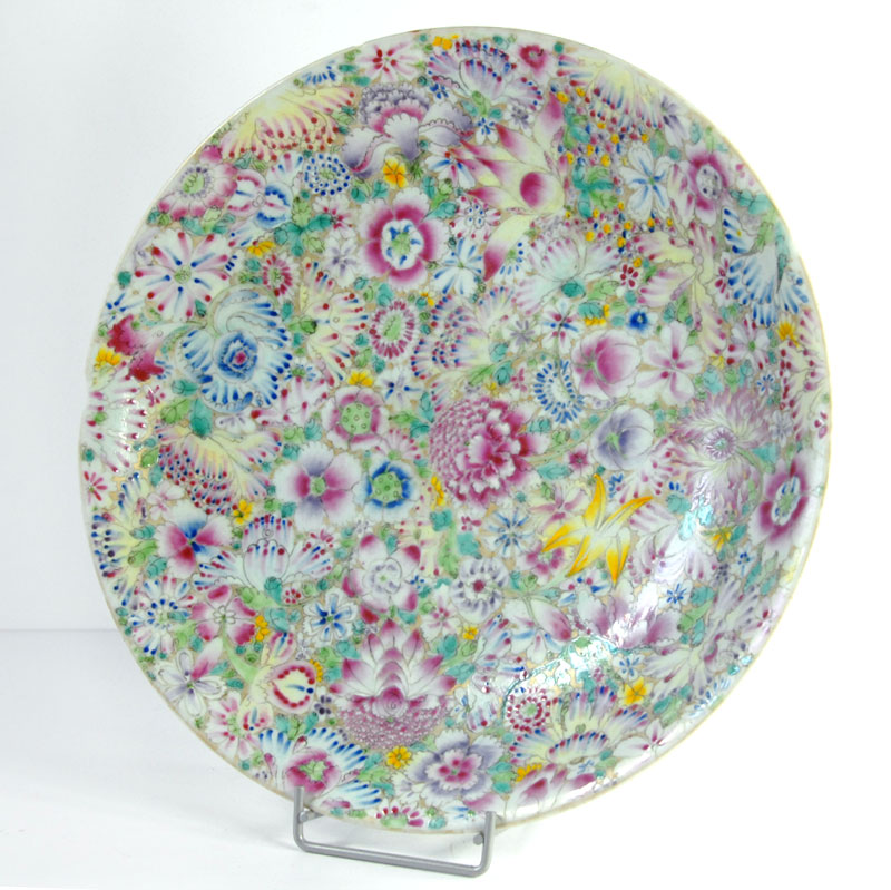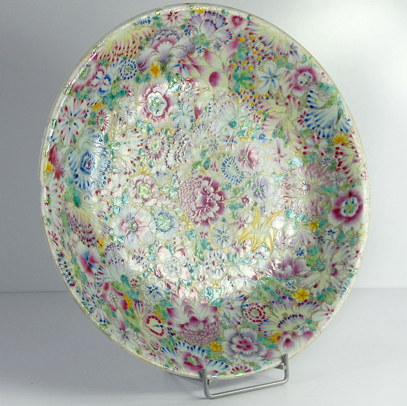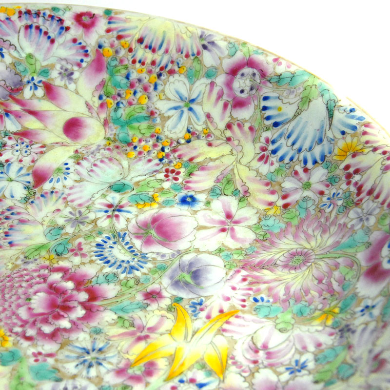 Ogromny, bardzo dekoracyjny talerz Millefiori zrobiony z porcelany i w dekorowany bardzo bogatą, kolorową ręczni nakładaną malaturą. Pochodzi z Chin z przełomu XIX i XX wieku. Kilka ubytków na krawędziach oraz stare, mało widoczne klejenie. Średnica: 33 cm. Wysokość: 6 cm.