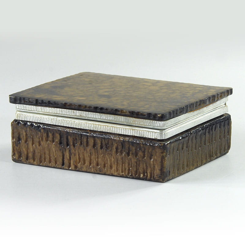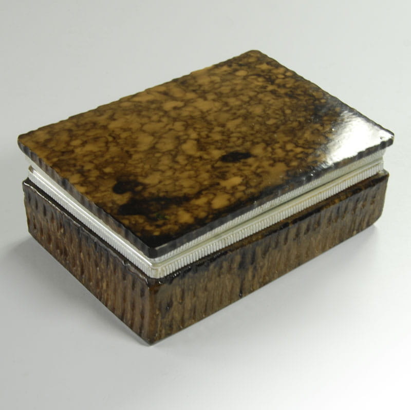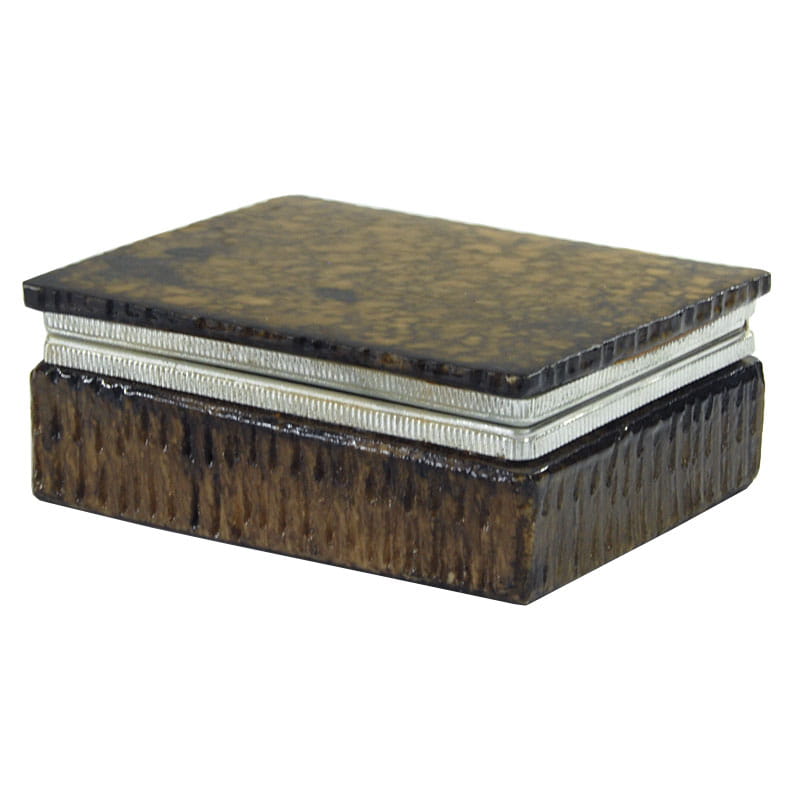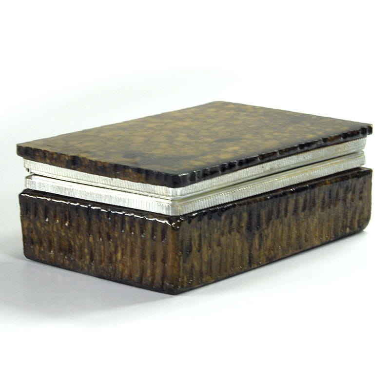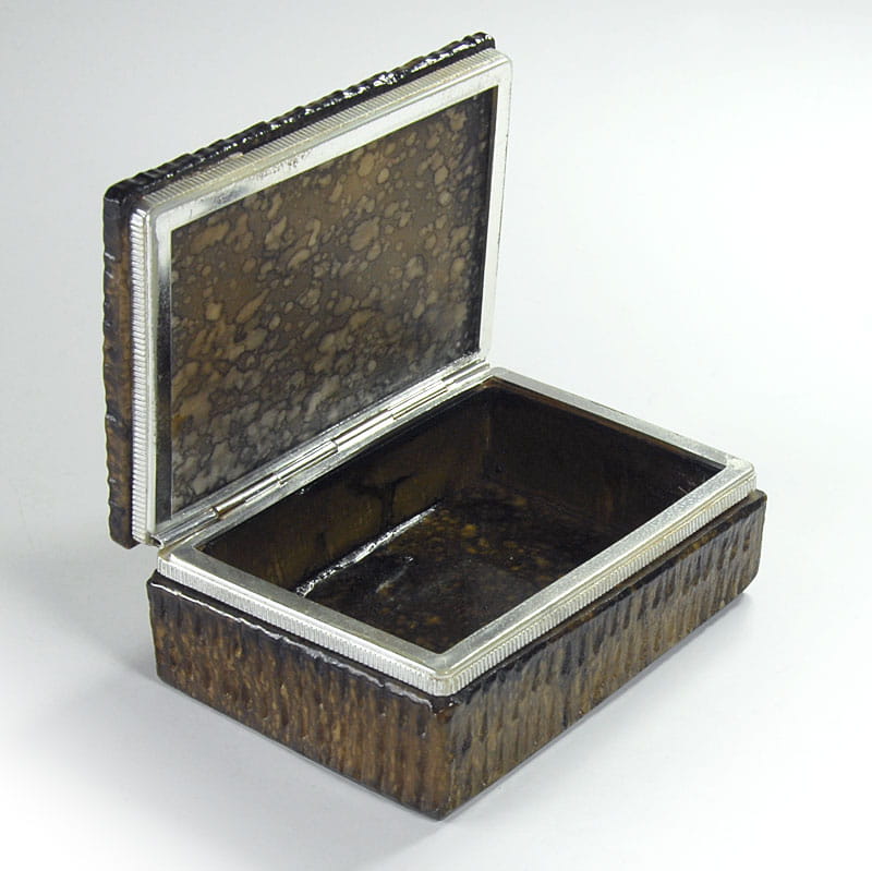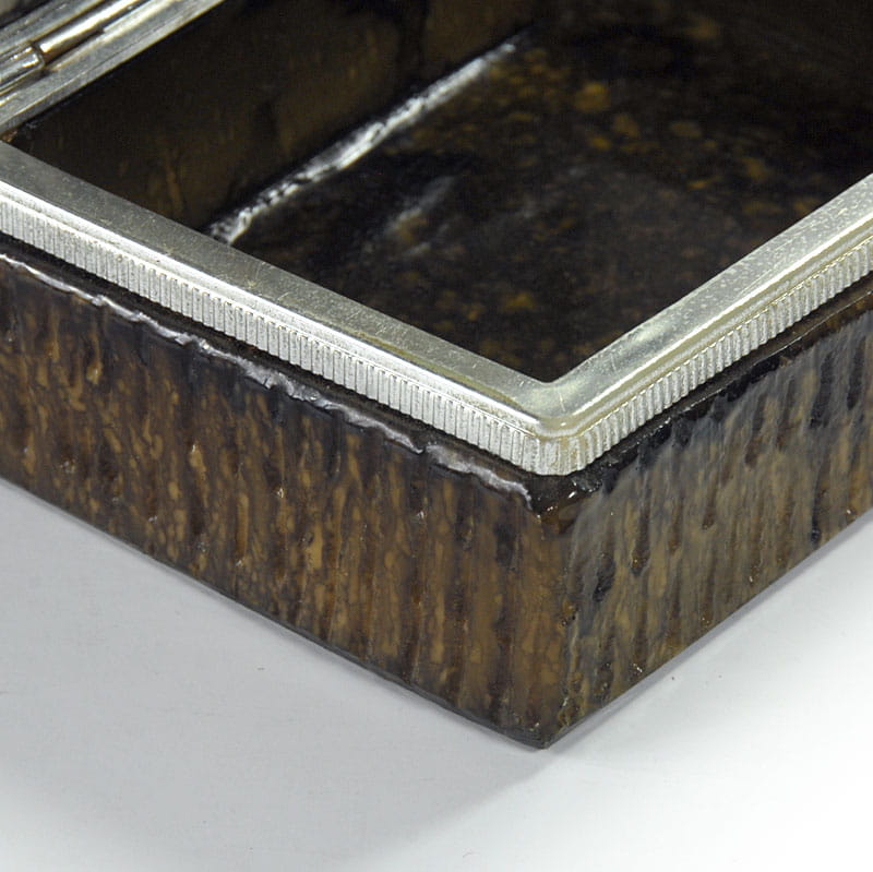 Dekoracyjna, zamykana kasetka pochodząca z Włoch z lat siedemdziesiątych XX wieku. Wykończona listwą z tworzywa sztucznego w kolorze srebrnym. Widoczne niewielki ślady używania. Wymiary: 13,5 x 9,5 x 5 cm.