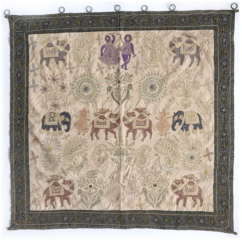 Ręcznie haftowana, orientalna tkanina dekoracyjna w delikatnych, pastelowych kolorach. Wyposażona w uchwyty umożliwiające zawieszenia na ścianie. bardzo dobry stan zachowania. Wymiary: 86 x 86 cm.