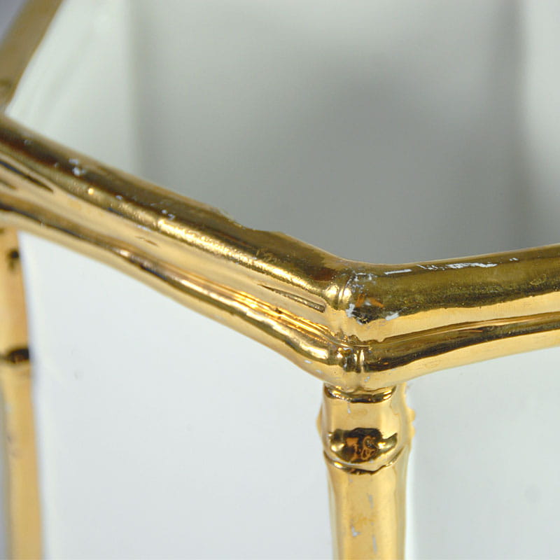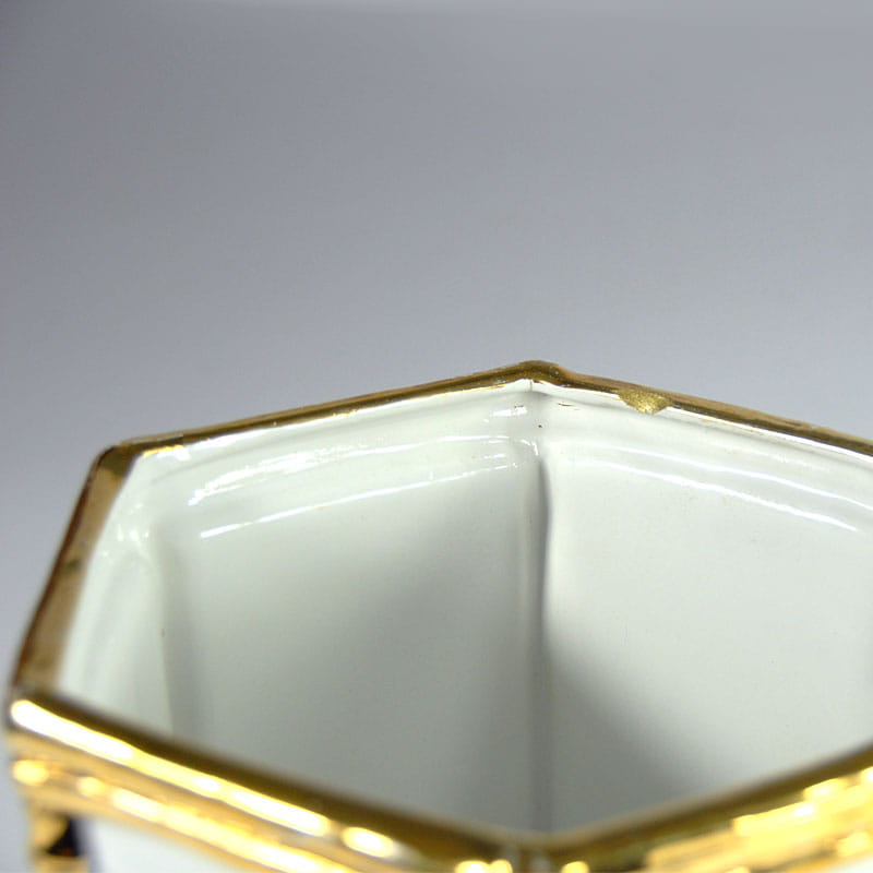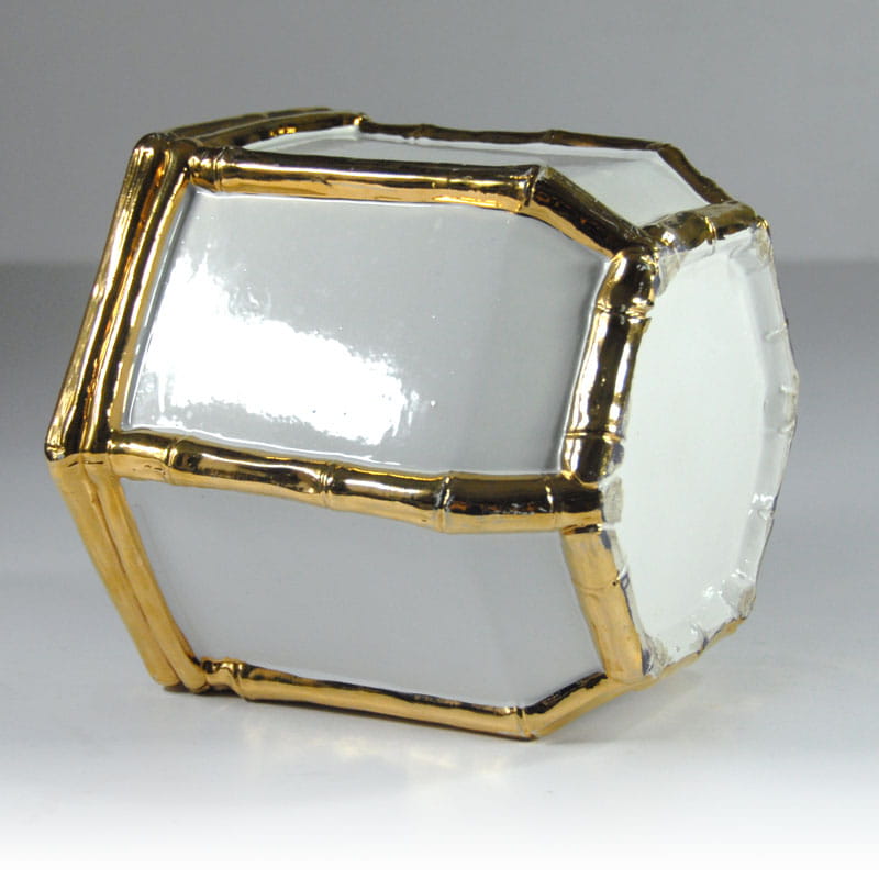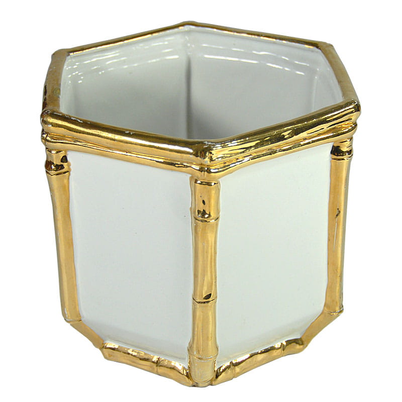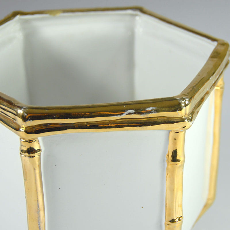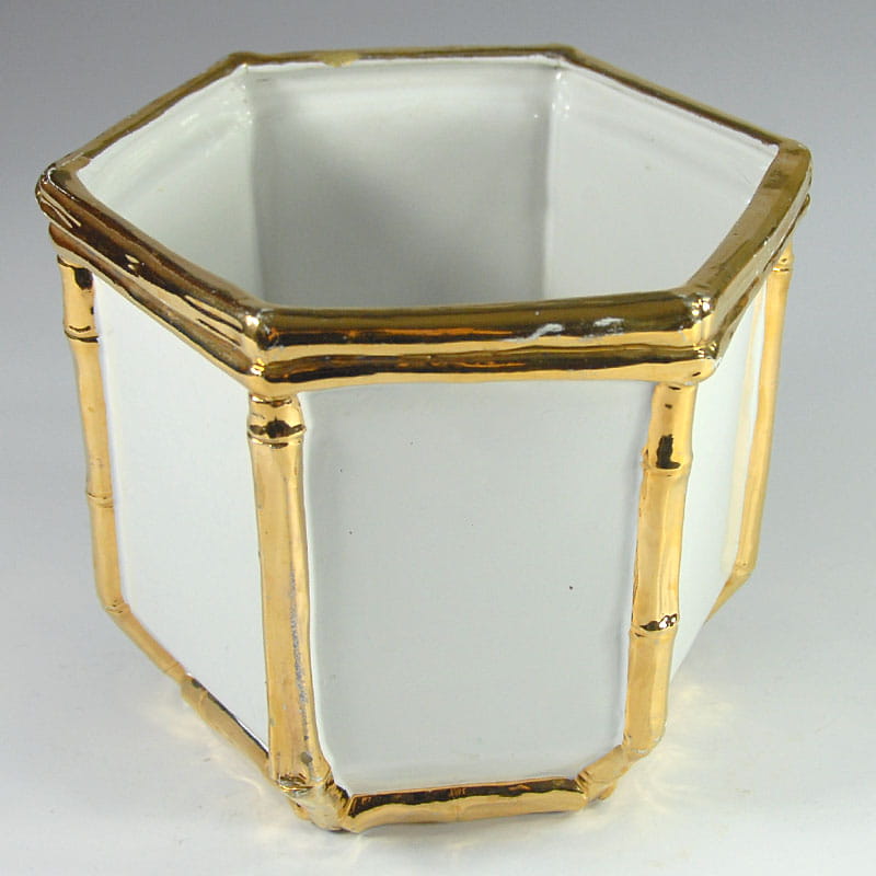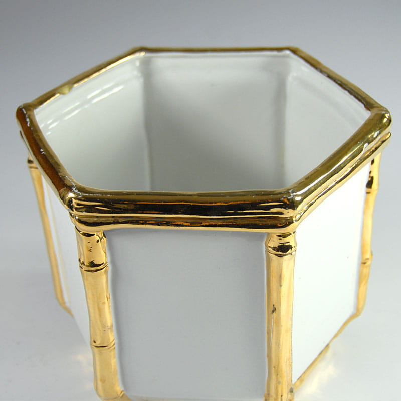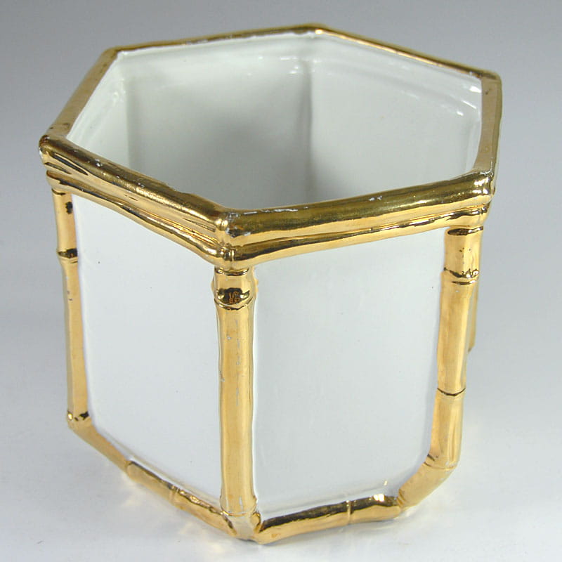 Duża, biała osłona na doniczkę zrobiona ze szkliwionej ceramiki. Dekoracyjne wykończenie imitujące pędy bambusa jest szkliwione z dużym połyskiem w kolorze złotym. Pochodzi z Włoch z lat siedemdziesiątych XX wieku. Widoczne ślady używania w postaci przetarcia złocenia oraz drobnych ubytków. Przy górnej krawędzi widoczny spory odprysk. Średnica: 22 cm. Wysokość: 18,5 cm.
