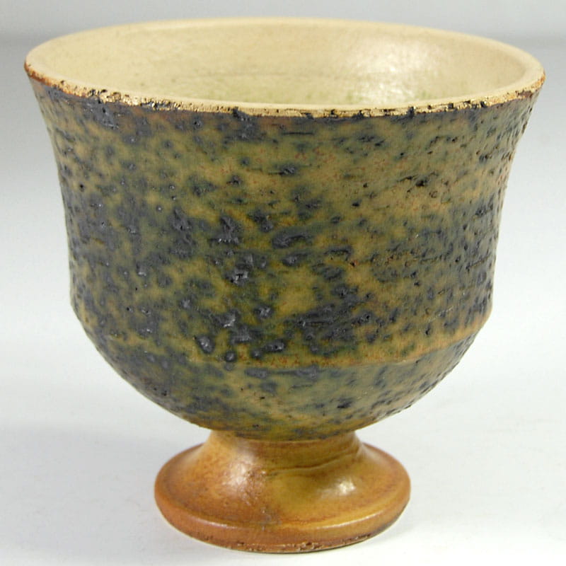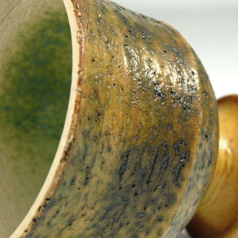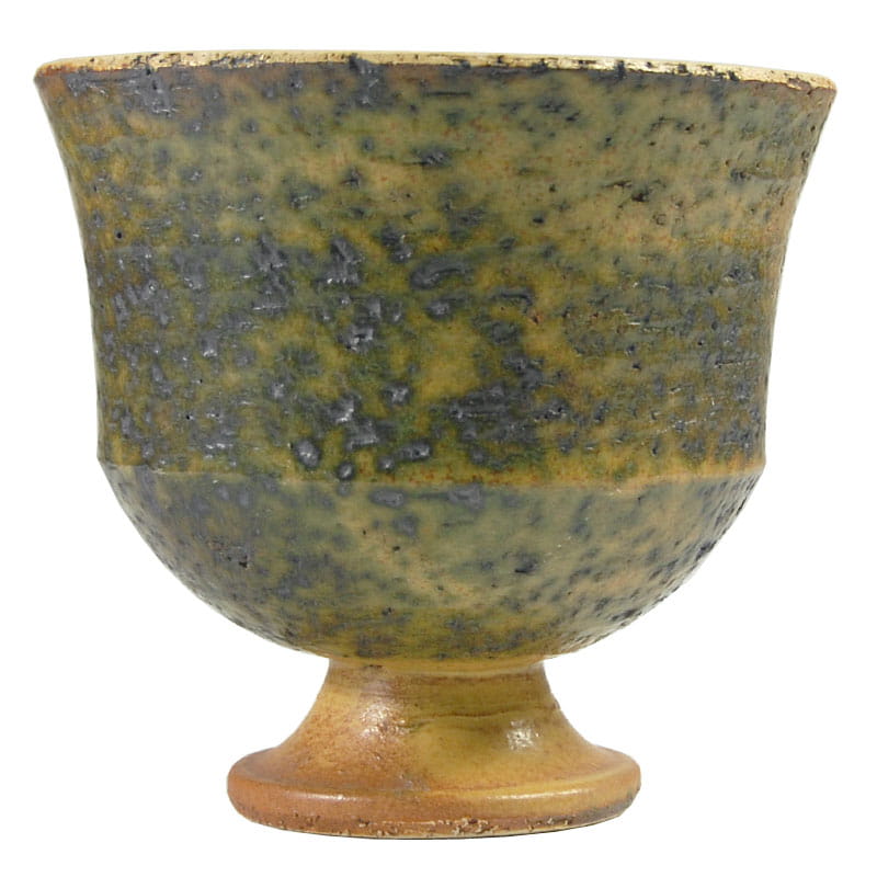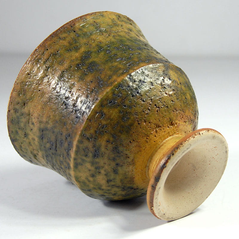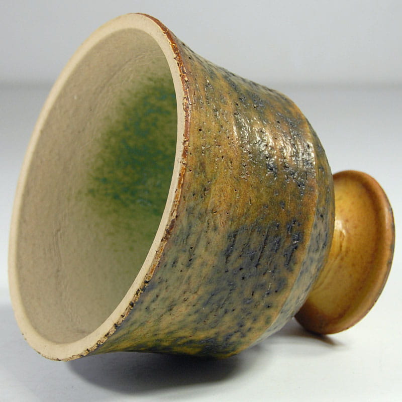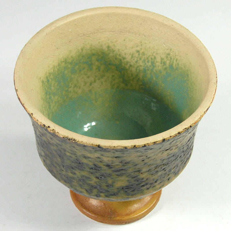 Dekoracyjna osłona na doniczkę pochodząca z lat pięćdziesiątych/sześćdziesiątych XX wielu. Zrobiona jest z surowej, zacieranej szkliwem ceramiki, wewnątrz szkliwiona. Projekt w stylu Pietera Groeneveldta. Bardzo dobry stan zachowania. Wysokość: 16 cm. Średnica: 18 cm.