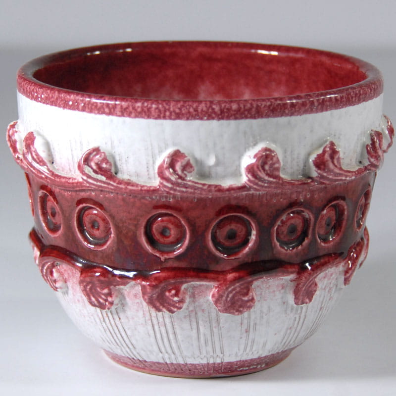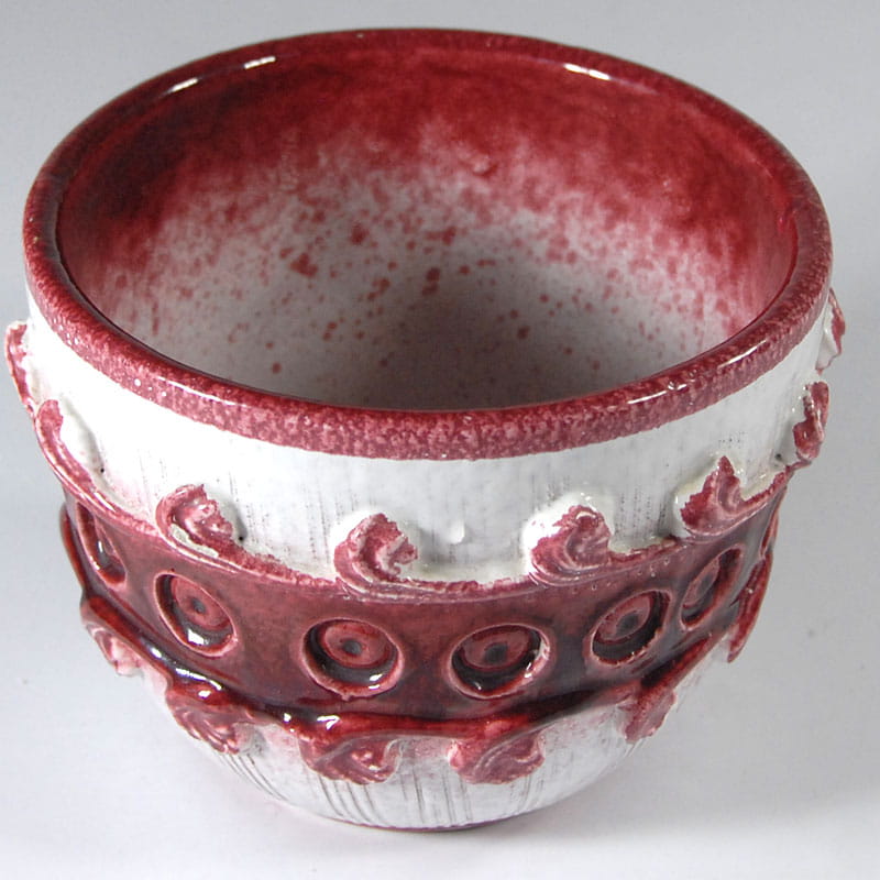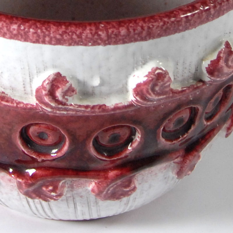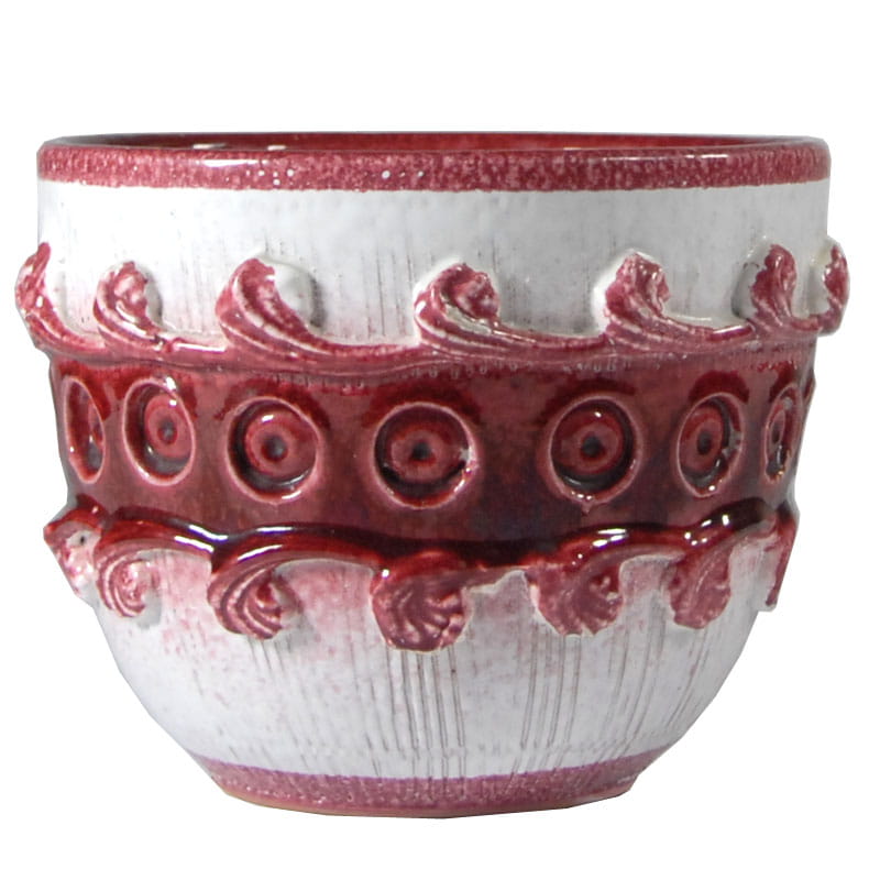 Ceramiczna, ręcznie wykonana i zdobiona osłonka na doniczkę. Szkliwiona. Pochodzi z wytwórni Nuovo Rinascimento we Włoszech z lat sześćdziesiątych XX wieku. Wysokość: 14 cm. Szerokość: 17 cm. Średnica podstawy: 10 cm.