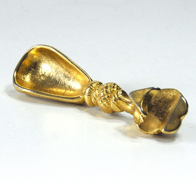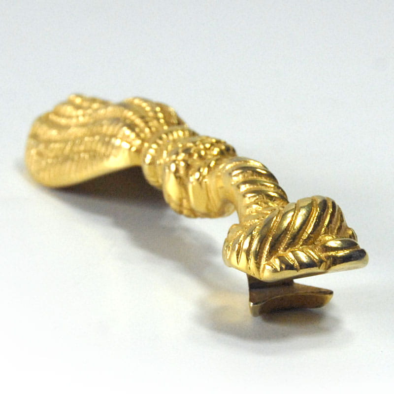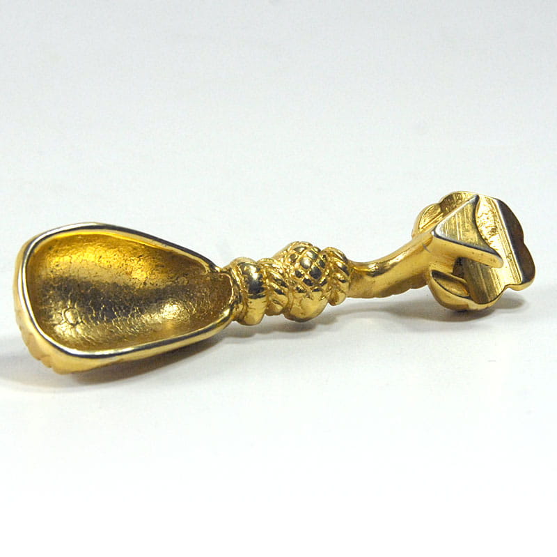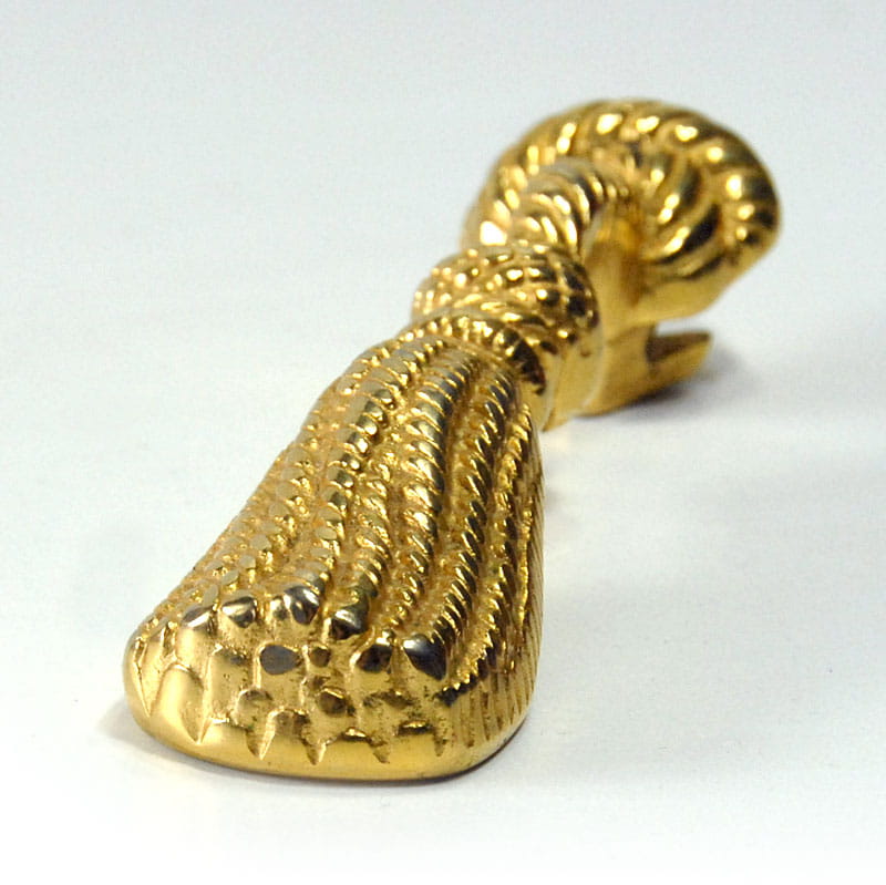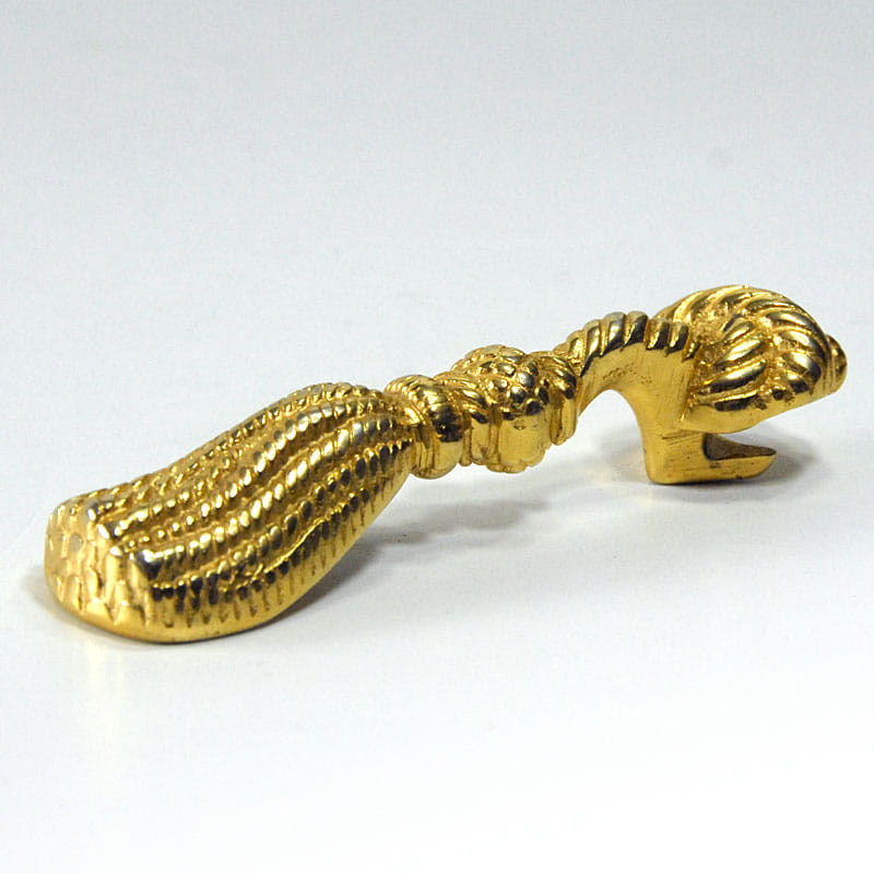 Złocony otwieracz do butelek w formie dekoracyjnego fędzla. Pochodzi z Włoch, z lat siedemdziesiątych XX wieku. Zachowany w bardzo dobrym stanie. Wymiary: 12 x 3,5 x 3 cm.