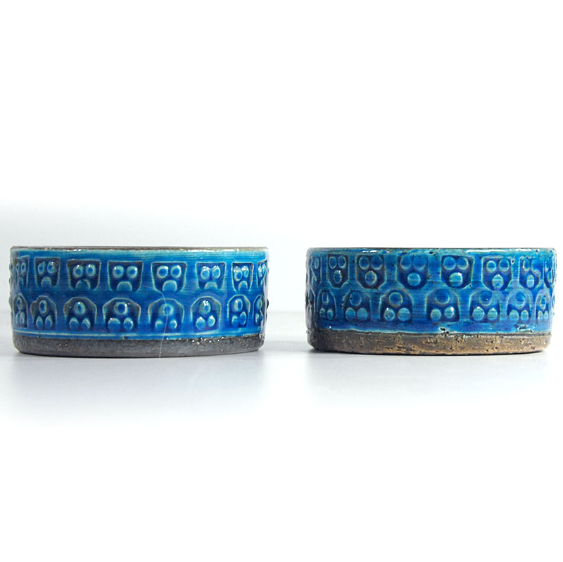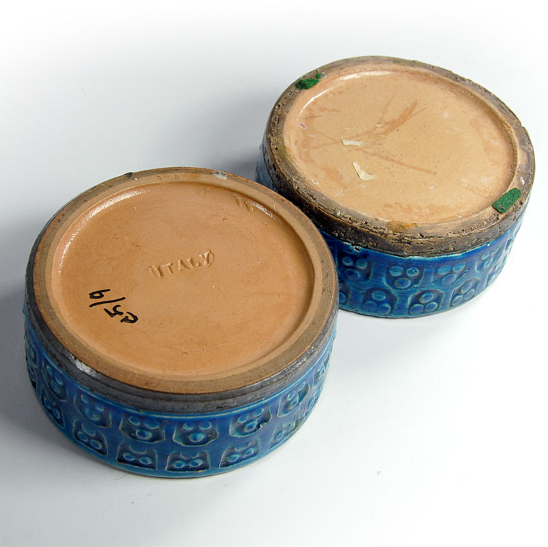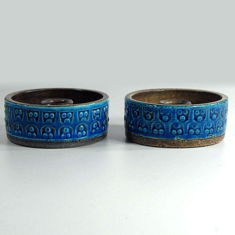 Para ceramicznych świeczników zrobionych ręcznie, dekorowanych reliefowanym ornamentem i wykończonych szkliwem w kolorze Rimini Blue. Zaprojektowane zostały przez Aldo Londiego. Wzór typowy dla projektów firmy Bitossi. Pochodzą z Włoch z lat sześćdziesiątych XX w. Bardzo dobry stan zachowania. Średnica: 10 cm. Wysokość: 4 cm. Cena za komplet.