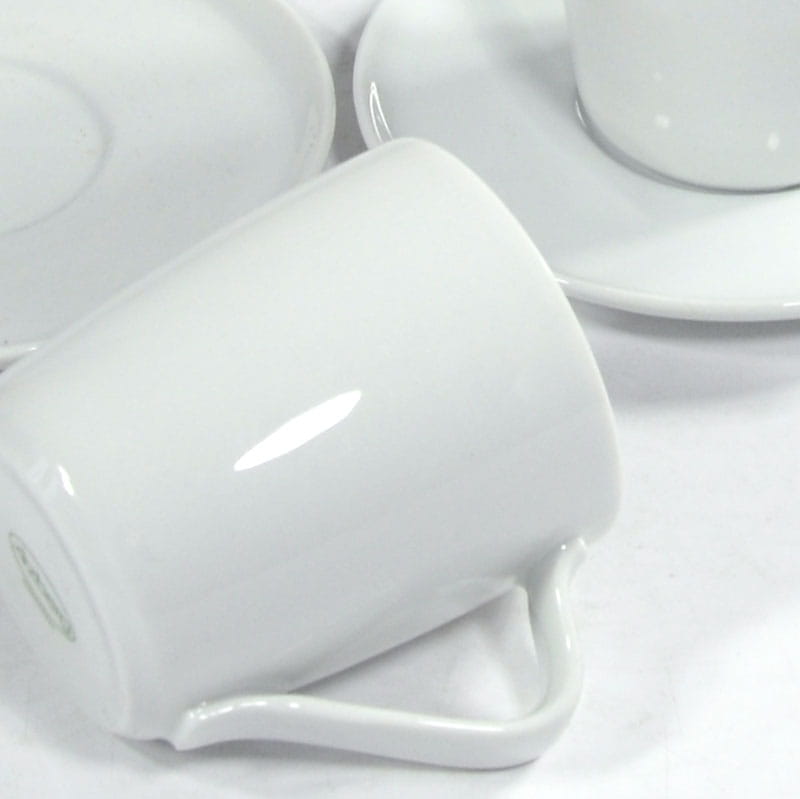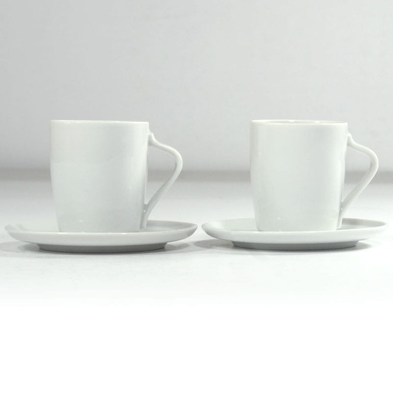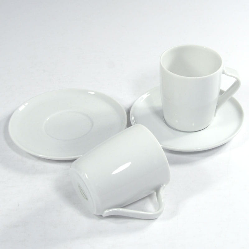 Para dekoracyjnych filiżanek kawowych zrobionych z cienkiej, białej porcelany. Dekoracyjne uszko i płaski spodeczek sprawiają wrażenie. Pochodzą z Niemiec z renomowanej wytwórni Arzberg.. Sygnowane. Zachowane w bardzo dobrym stanie. Wymiary filiżanki: 6,5 x 6 cm. Średnica spodka: 11 cm.