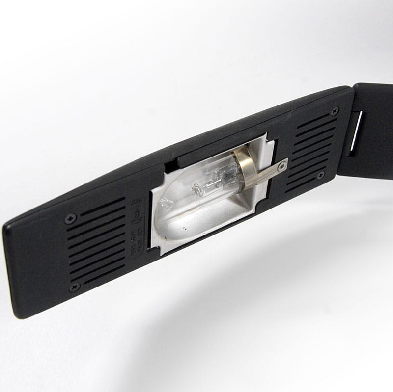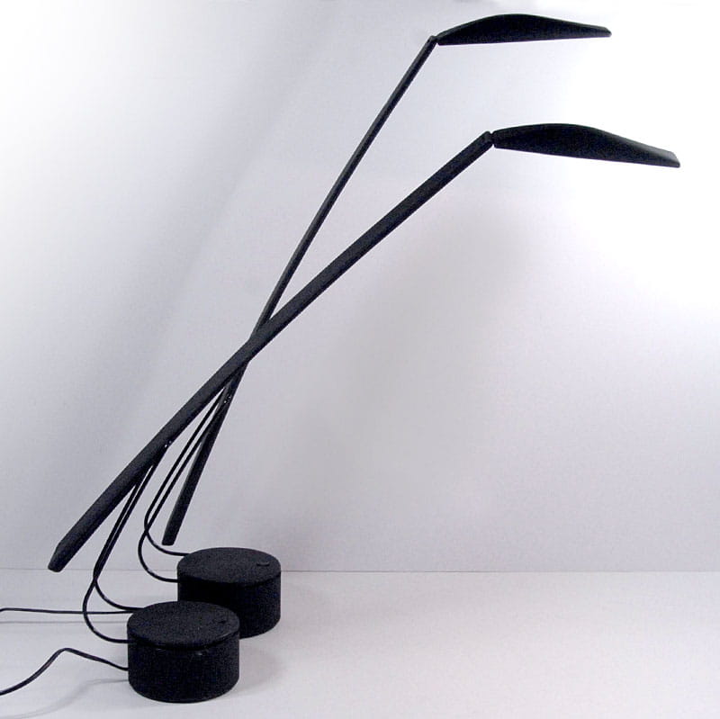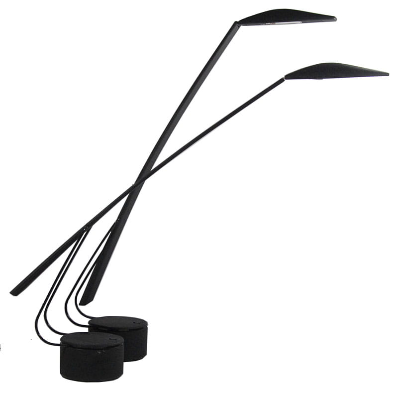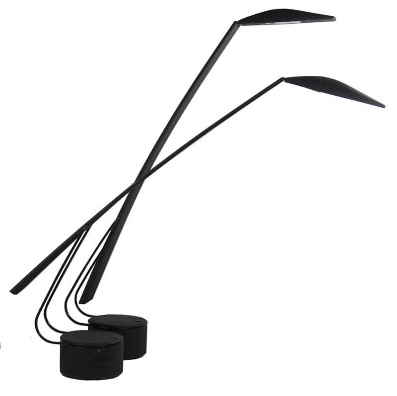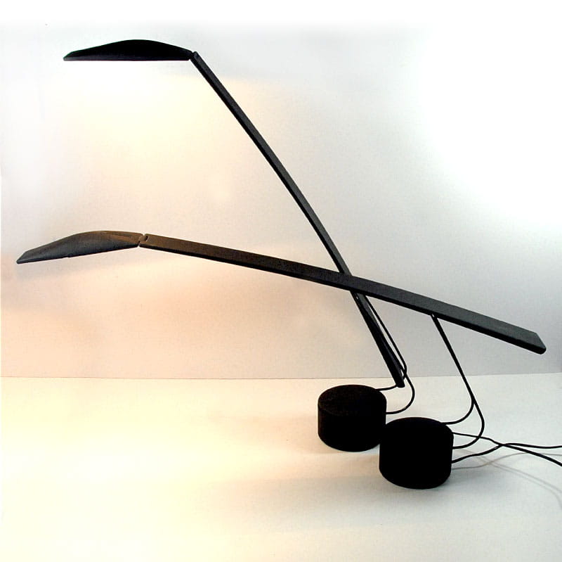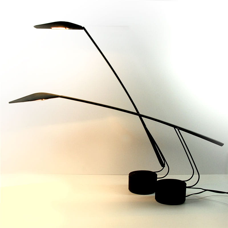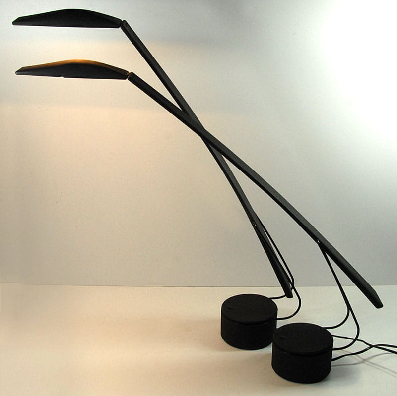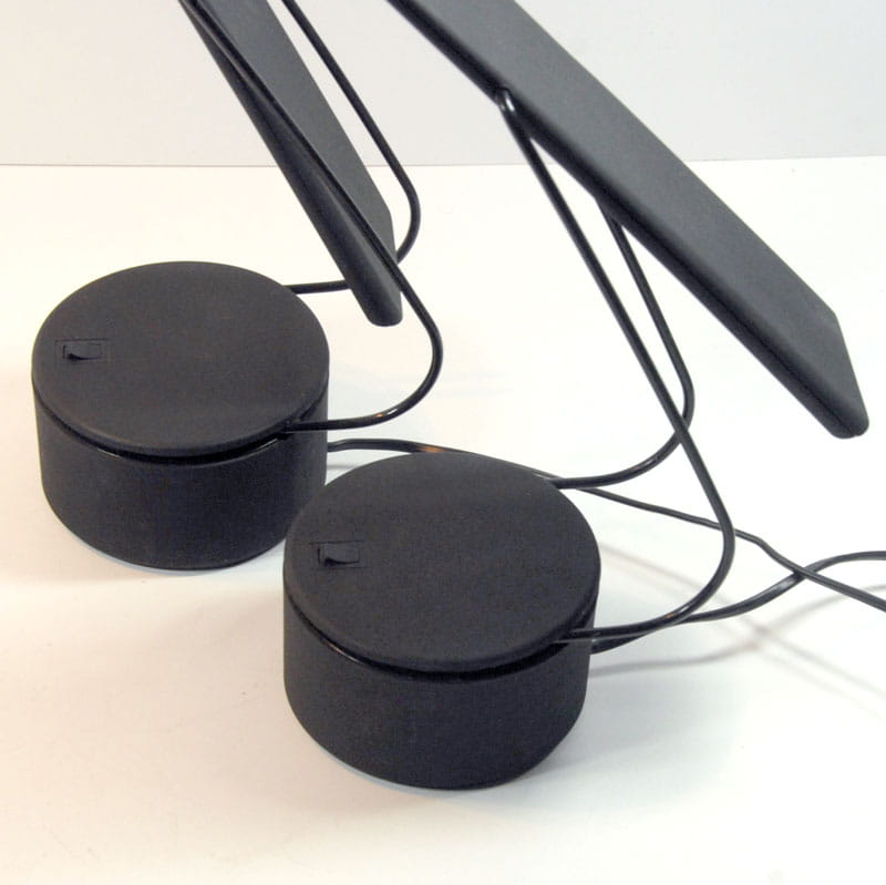 Para lamp włoskich biurkowych zaprojektowanych przez designerski duet Mario Barbaglia & Marco Colombo w latach osiemdziesiątych XX wieku w Mediolanie. Lampy zostały wyprodukowane przez Italiana Luce. Posiadają regulację nachylenia ramion oraz trzystopniowy system regulacji jasności oświetlenia. Zachowane są w bardzo dobrym stanie. Jedna z lamp ma niewielki ubytek na krawędzi widoczny na zdjęciu. Wysokość maksymalna: 90 cm. Szerokość maksymalna: 84 cm. Głębokość: 12 cm.