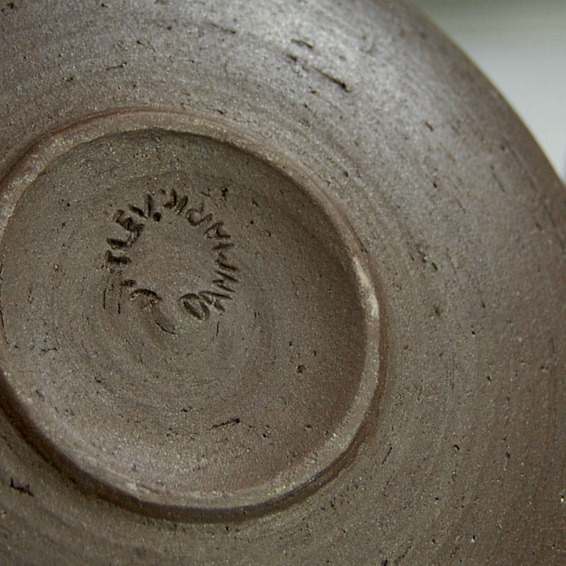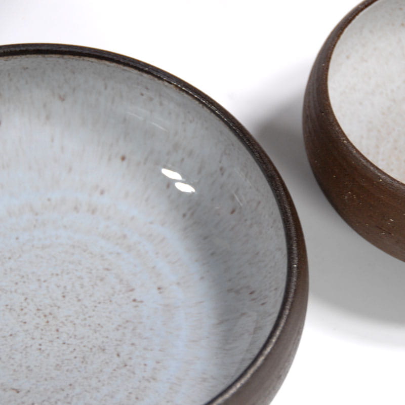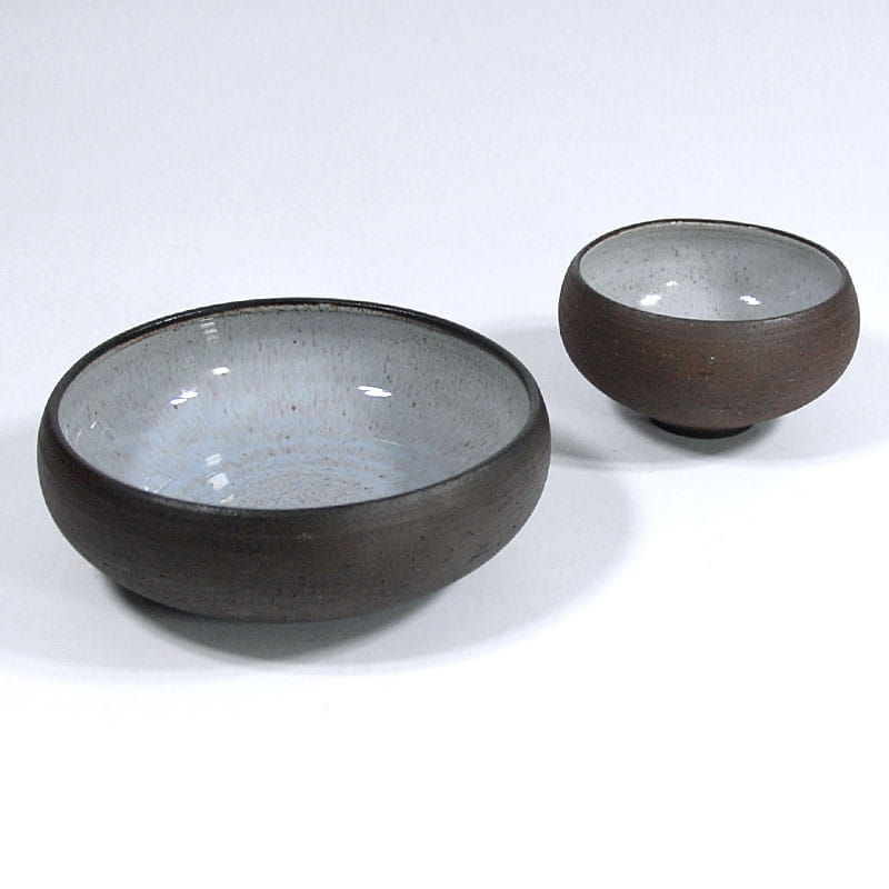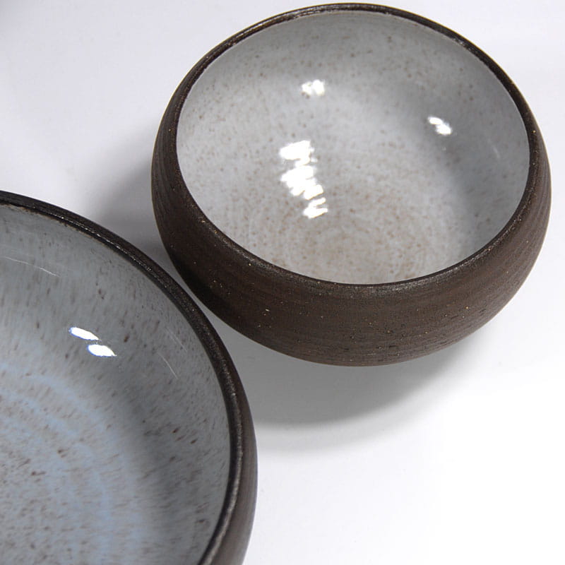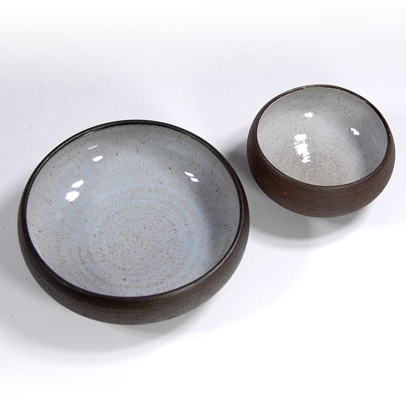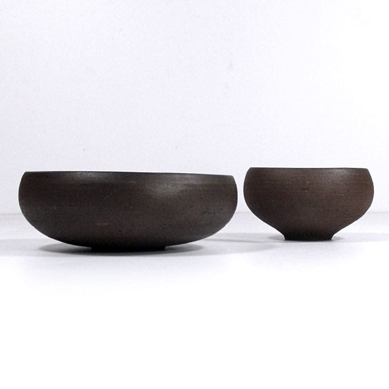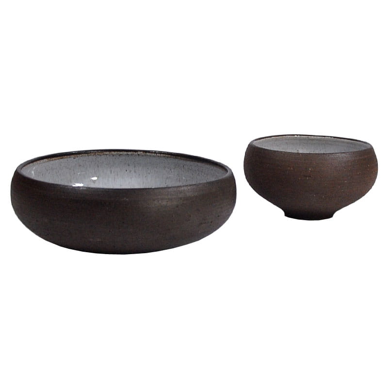 Zestaw misek zrobionych z surowej ceramiki w ciemno brązowym kolorze. Szkliwione jedynie wewnątrz. Sygnowane: Vitlev Denmark. Oryginalne przedmioty vintage pochodzące z lat siedemdziesiątych XX w. Wyprodukowane w Danii. Wymiary: 19 x 7 cm. oraz 13 x 8 cm.