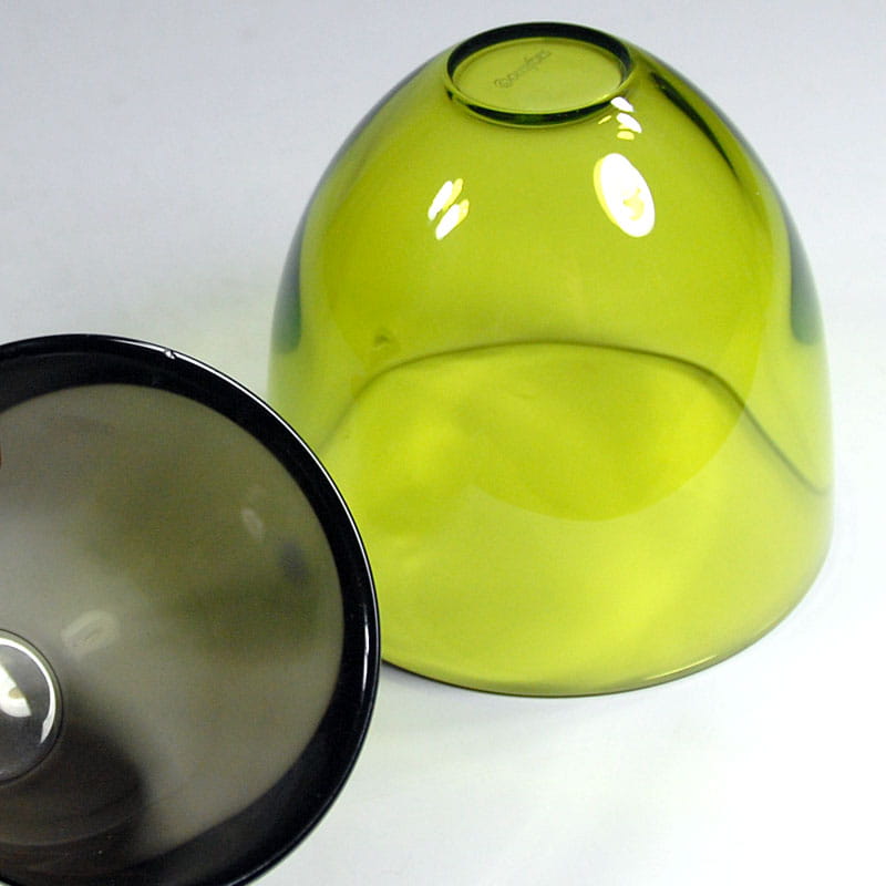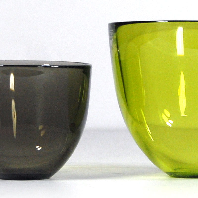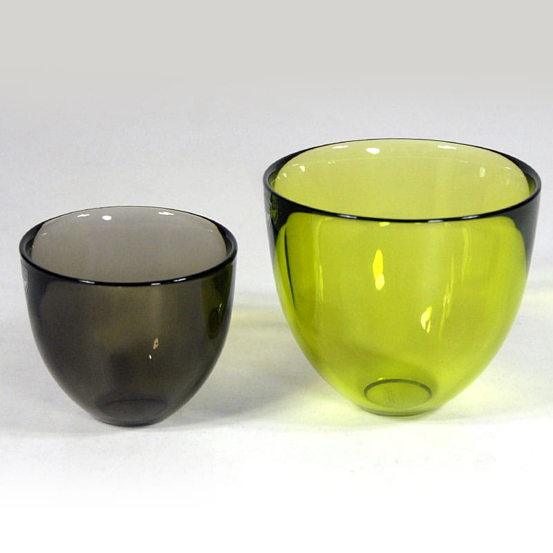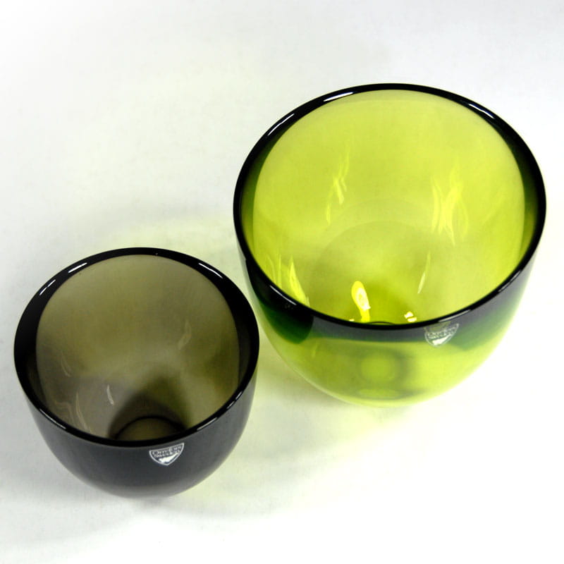 Para dekoracyjnych misek Pastillo z wysokiej jakości szkła kolorowego. Zaprojektowane przez Lenę Bergström. Pochodzą ze szwedzkiej wytwórni Orrefors, z lat dziewięćdziesiątych XX wieku. Sygnowane. Wysokość: 11 cm. Średnica: 12 cm. oraz średnica: 8 cm. i wysokość: 9 cm.